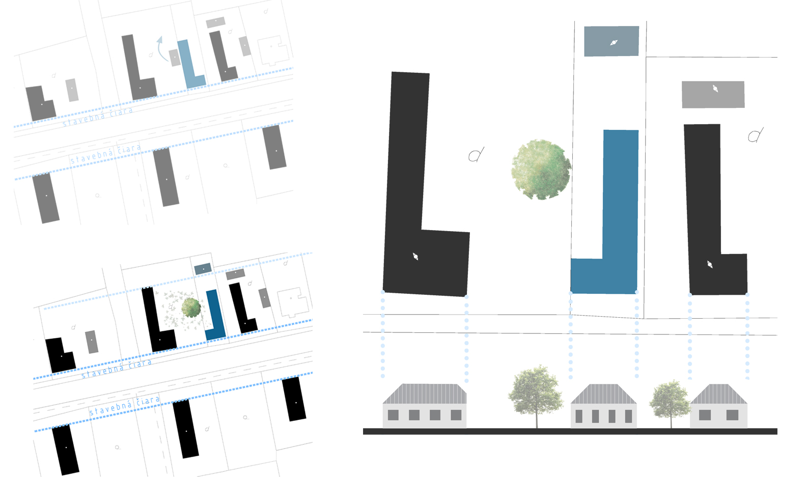 Navrhovaný objekt novostavby rešpektuje uličnú zástavbu-stavebnú a uličnú čiaru celkovou formou a navrhovaným objemom. Zrkadlením formy susedného objektu (tiež ležiaceho na predmetnej parcele) sa vytvára príjemné intímne nádvorie, do