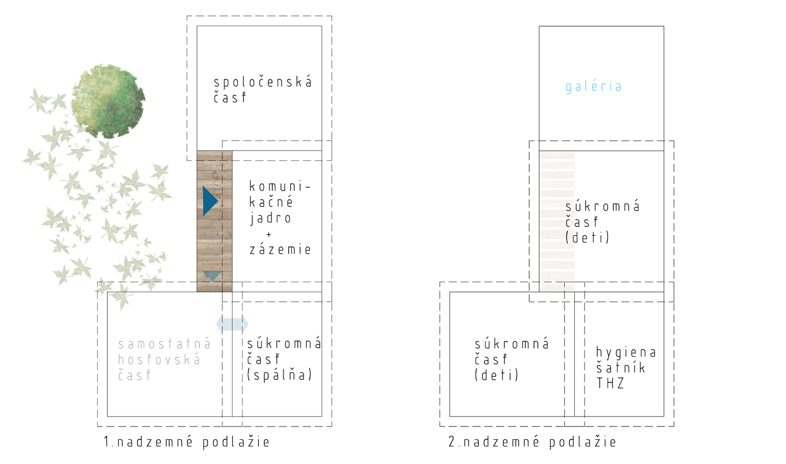 Nad obývacou izbou sa nachádza galéria, ktorá komunikuje so schodiskovým priestorom a detskými izbami. Tie sa nachádzajú na druhom nadzemnom podlaží a majú vlastnú kúpeľňu. Ich charakteristickým prvkom je vyvýšené pódium v polohe pod