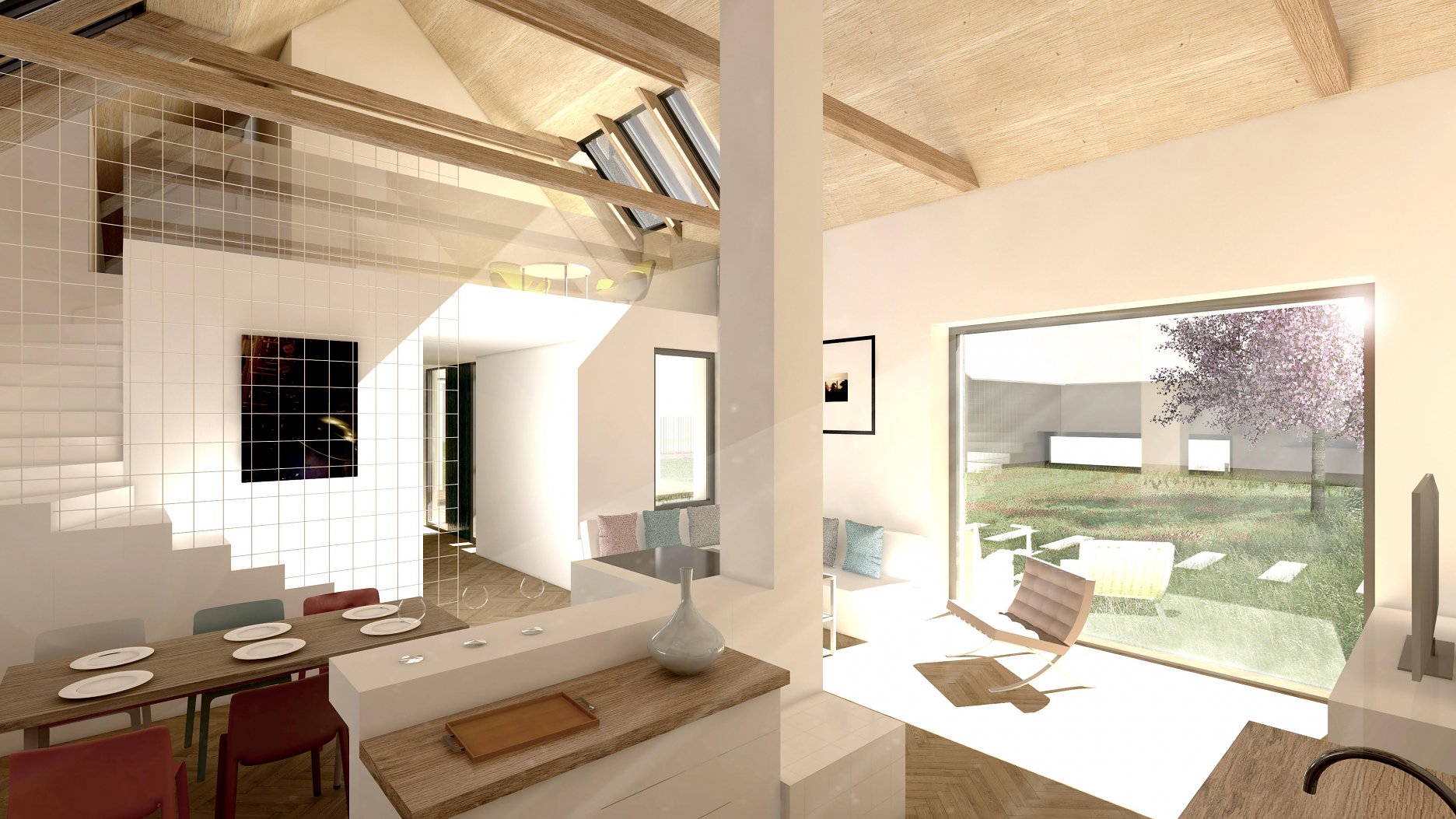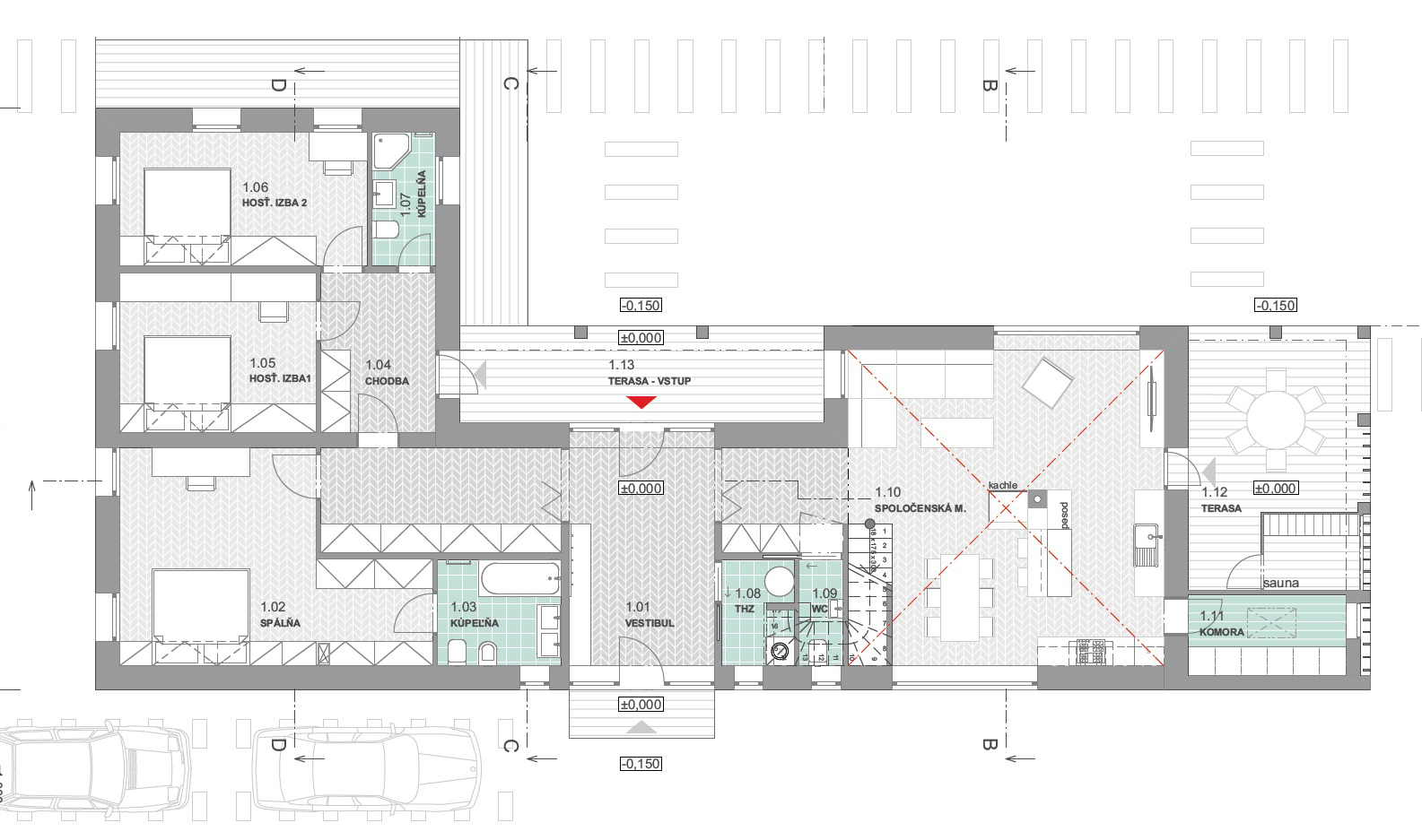 Kuchyňa má priamy prístup do komory (ktorá môže byť prístupná aj zo záhrady, pozn. pre investorov). Z obývacej izby je možné dostať sa do polo-exteriérového priestoru terasy s vonkajším sedením a uzavretou saunou.