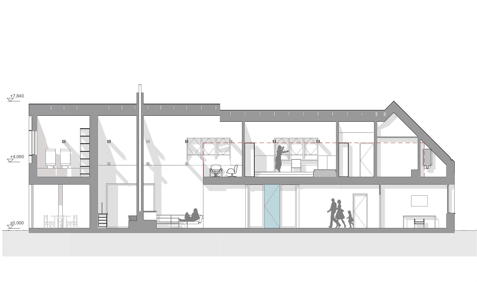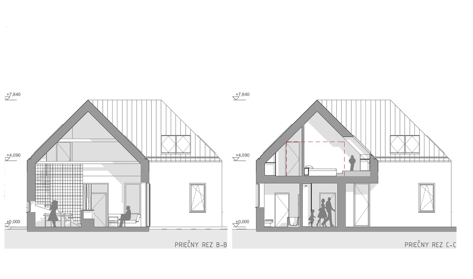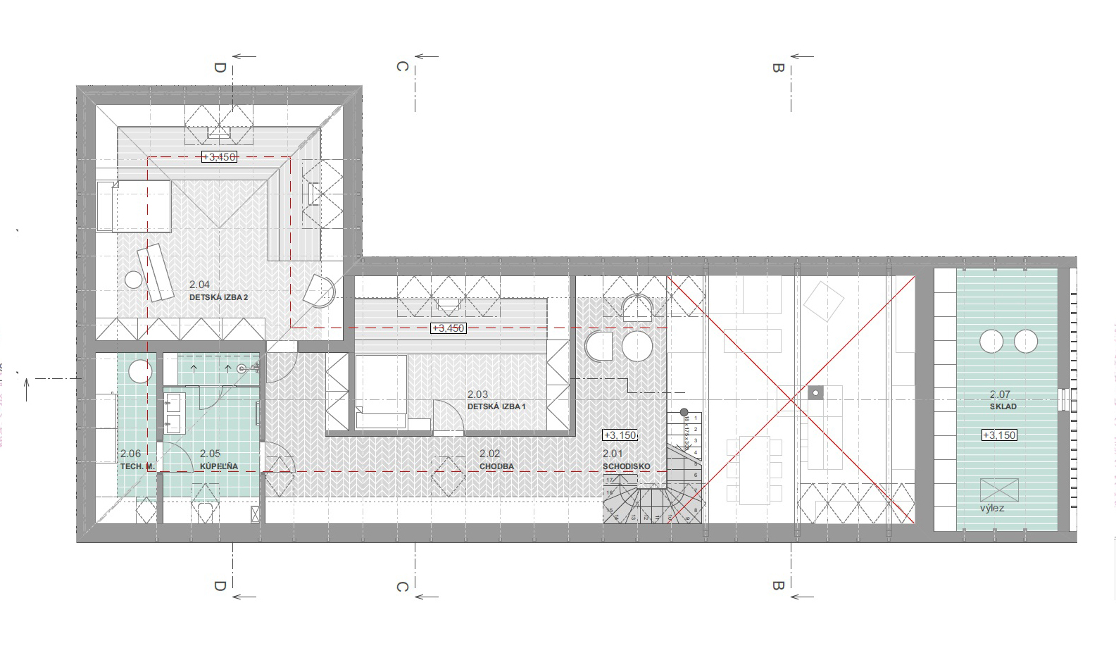 zabezpečenie dostatočného denného osvetlenia. Za kúpeľňou (smerom k ulici) sa nachádza technická miestnosť na umiestnenie rekuperačných (vzduchotechnických) jednotiek a tepelného čerpadla. Nad komorou sa nachádza podkrovný sklad, ktorý je prístupný padajúcimi rebríkovými schodíkmi a alternatívne môže slúžiť aj pre decentralizovanú rekuperačnú jednotku.