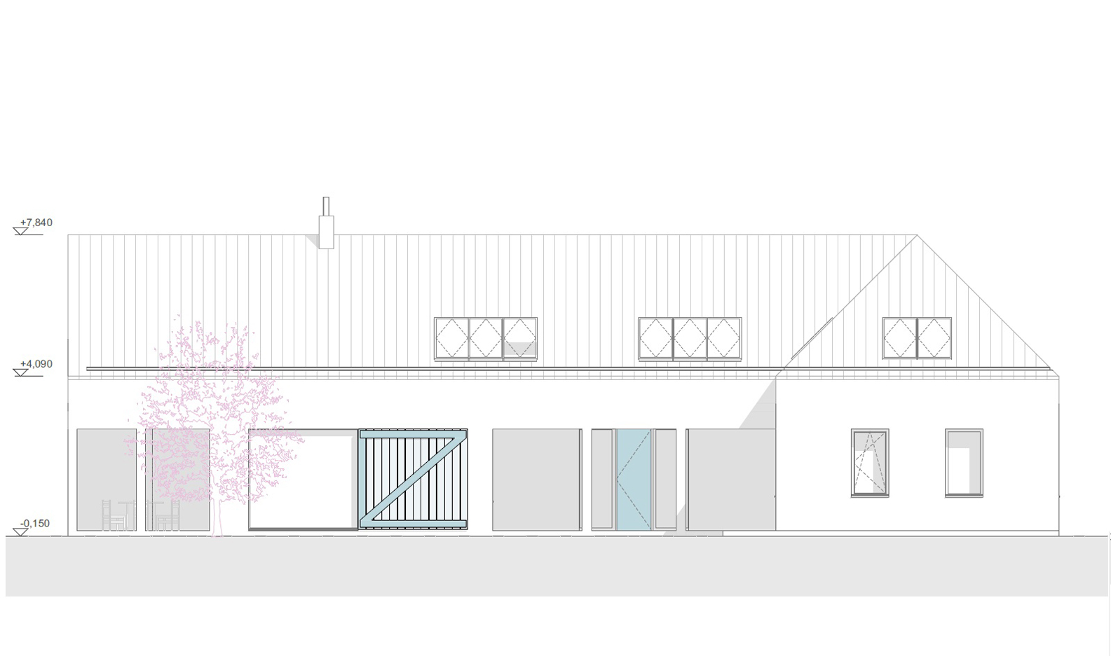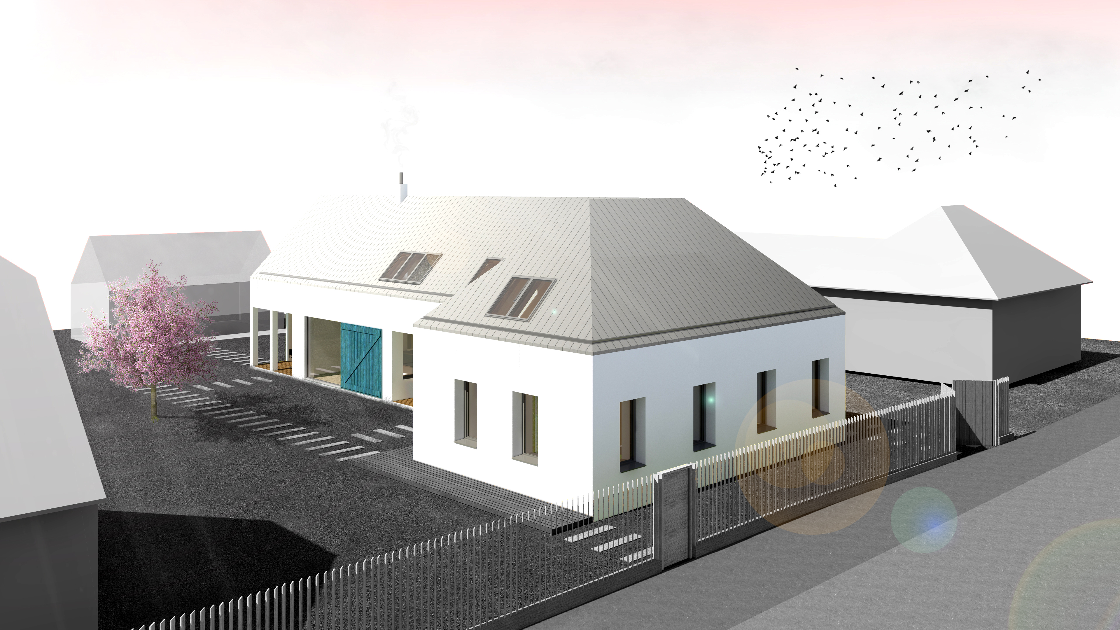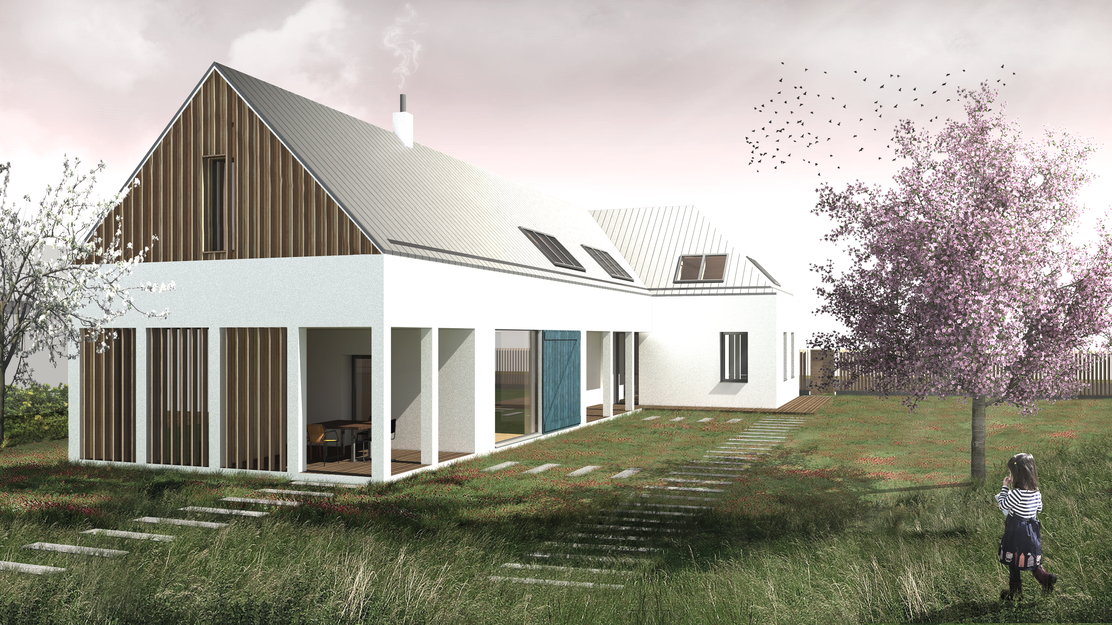 materiály. Ich vzájomným spolupôsobením vzniká fungujúci komplex jednoduchého charakteru, vďaka čomu vyniknú jednotlivé modré prvky (drevené vráta z pobytovej zóny, vstupné dvere a pod.) tvoriace hlavnú odvolávku na miestnu ľudovú