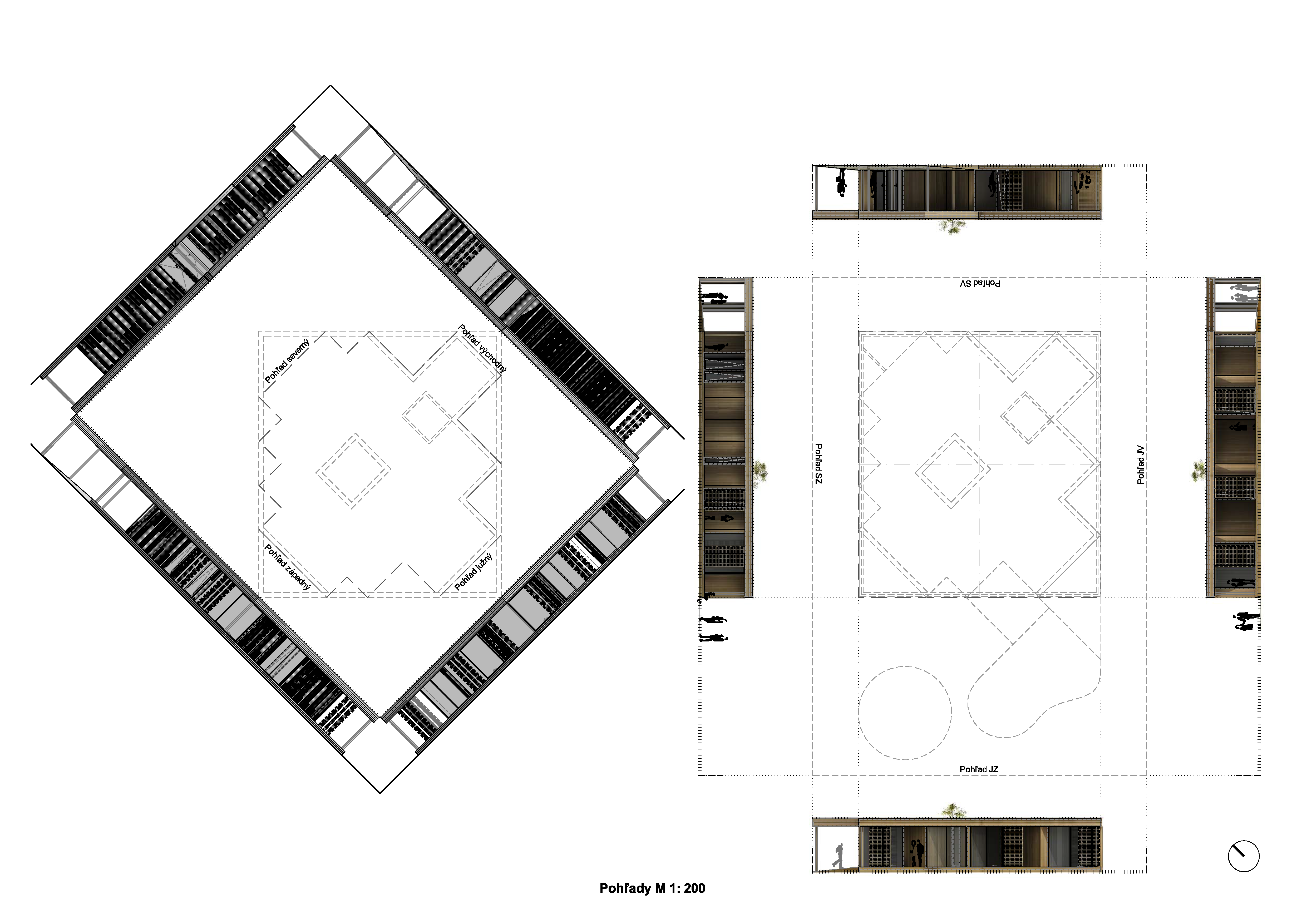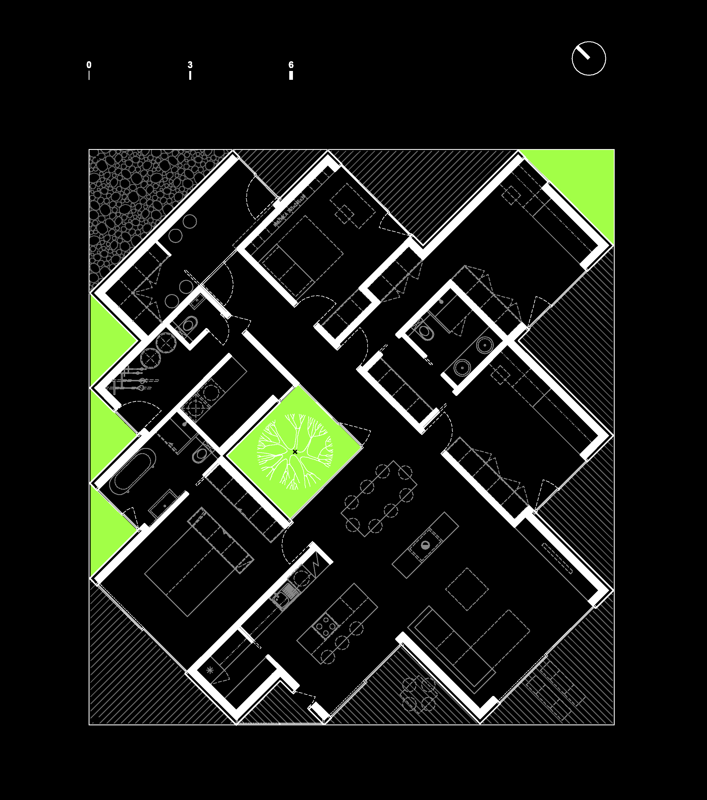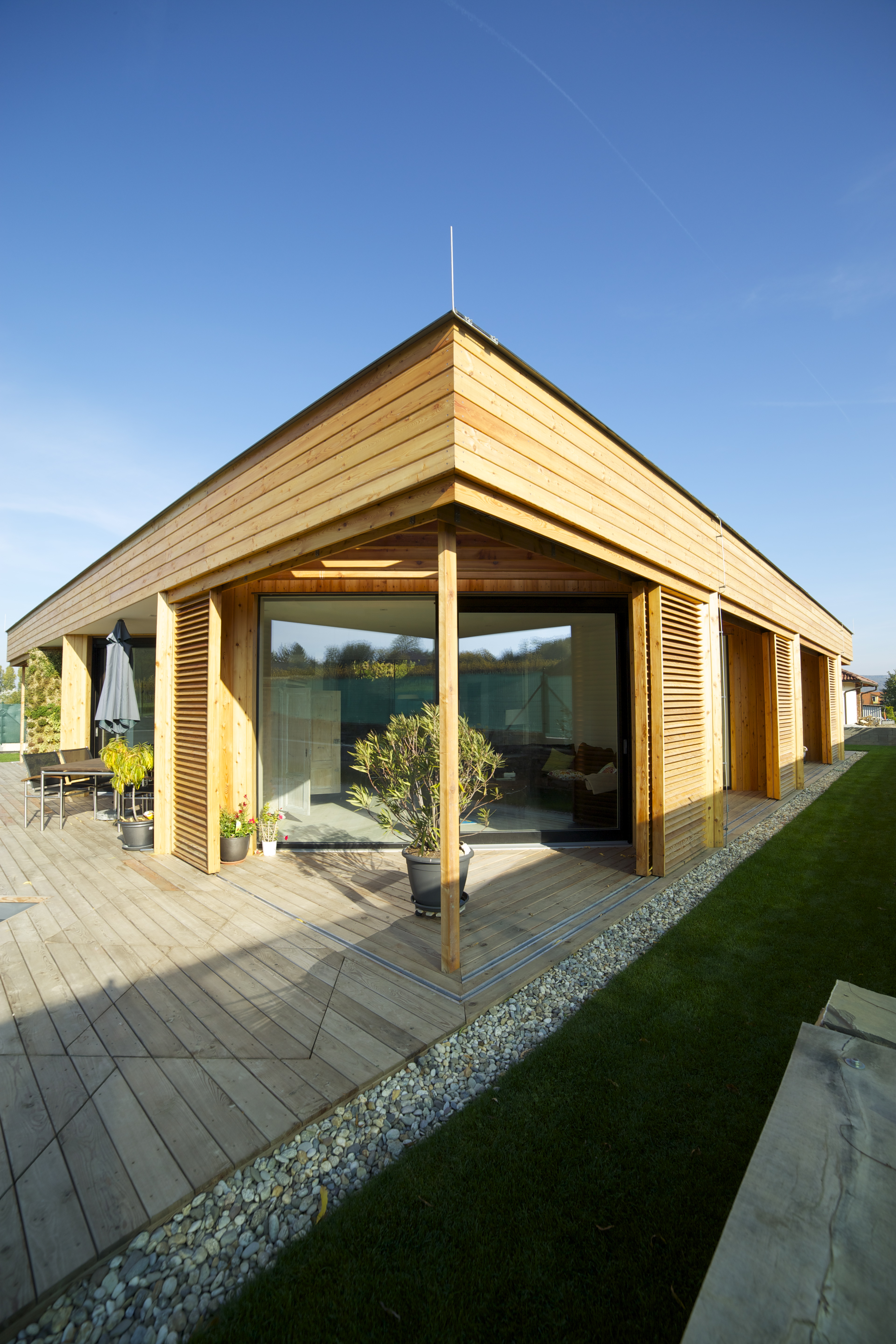 Navrhovaný tvar domu, aj keď z pozície vonkajšieho pozorovateľa pôsobí ako bežný „bungalov“ na štvorcovom pôdoryse, jeho tajomstvo sa skrýva v jeho vnútornom členení priestorov, a to najmä jeho jednoduchým a pri tom logickým natočením vnútornej dispozície miestností presne o 45°, pozdĺž základnej S-J orientácie, kde jej severná časť vyúsťuje do ulice a južná do záhrady. Takto vytvarovaný dom má najväčšie možné solárne zisky. Zároveň to umožňuje všetkým miestnostiam mať „vlastný“ výhľad na okolitú JV-J-JZ panorámu, aj separátny východ do exteriéru. „Zafixovaný“ štvorcový podklad domu a nad ním totožná strecha tak vytvára medzi svojimi obrysmi a pootočeným obrysom vonkajších stien trojuholníkové niky – lodžie, privátne pre každú miestnosť samostatne. Každá z týchto lodžií môže mať vlastnú povrchovú úpravu, buď ako terasa, zimná záhrada alebo len malý dvorček – záhradka s trávou, bylinkami, kvetinami ako „veľké terasové kvetináče“. Nad niektorými nikami je pevná strecha, najmä nad menšími, pri väčších je prekrytie riešené drevenými pergolami, ktoré sú vlastne len logickým pokračovaním konštrukcie stropných nosníkov pozdĺž kratšej strany štvorca.