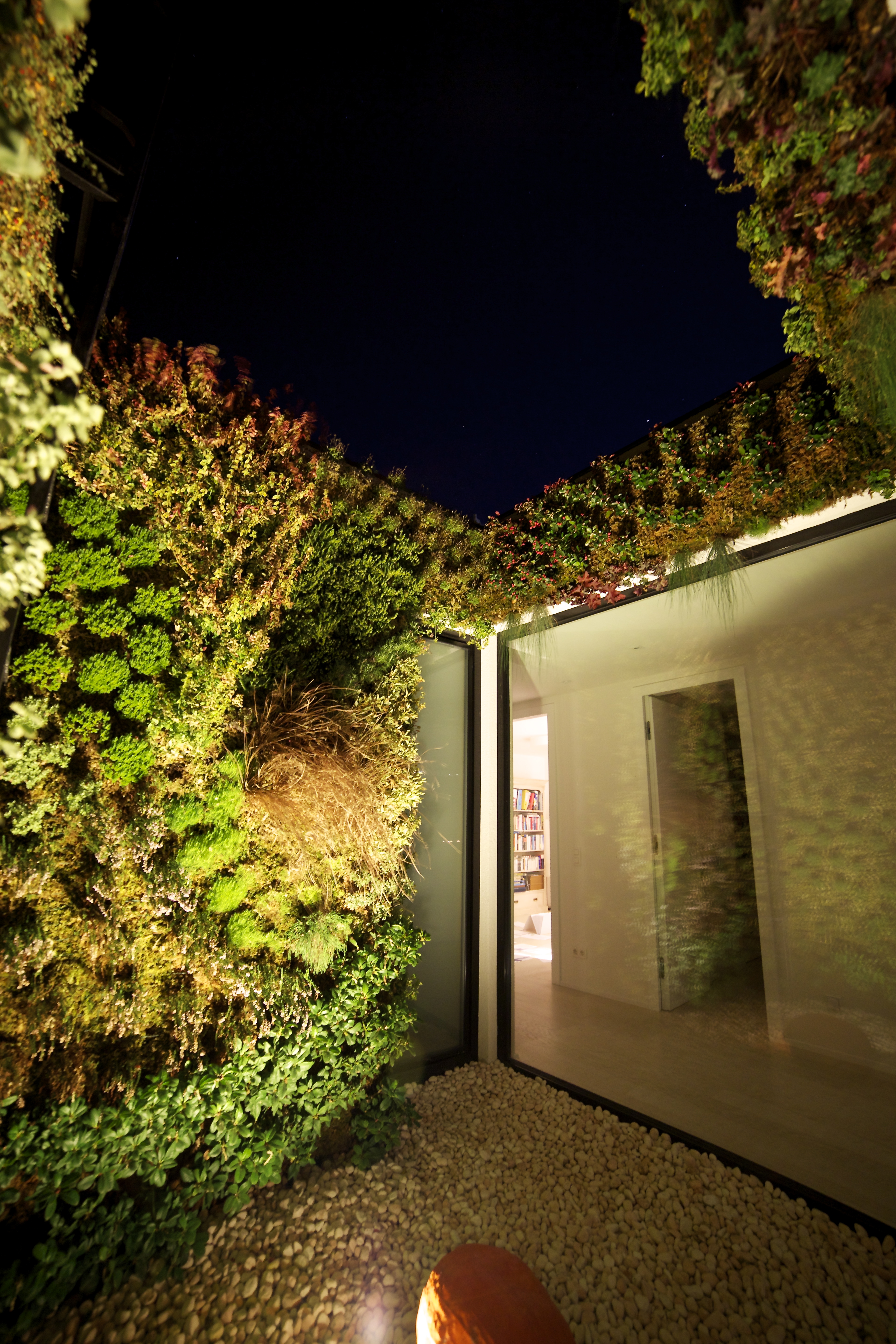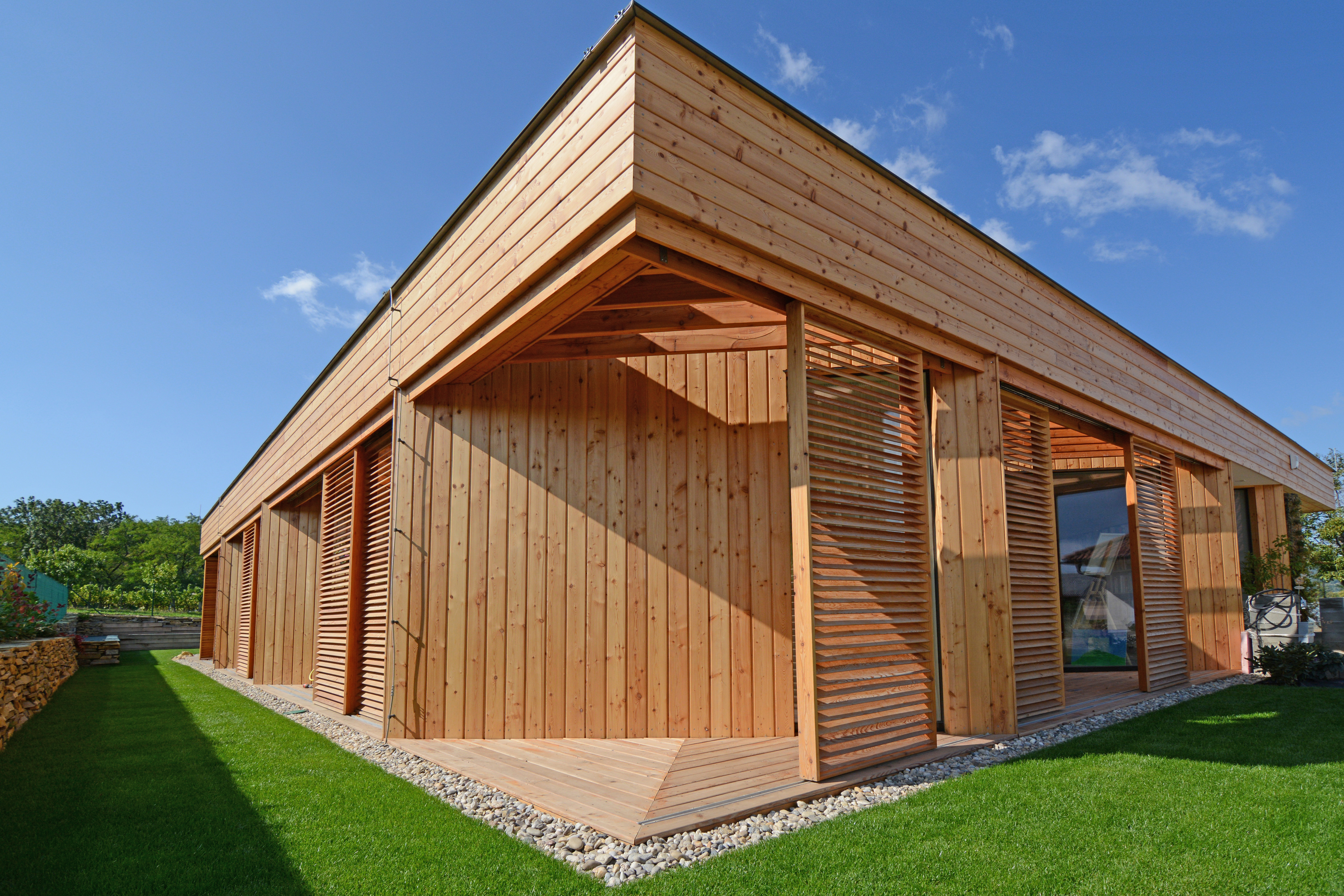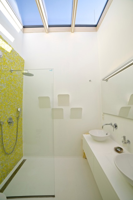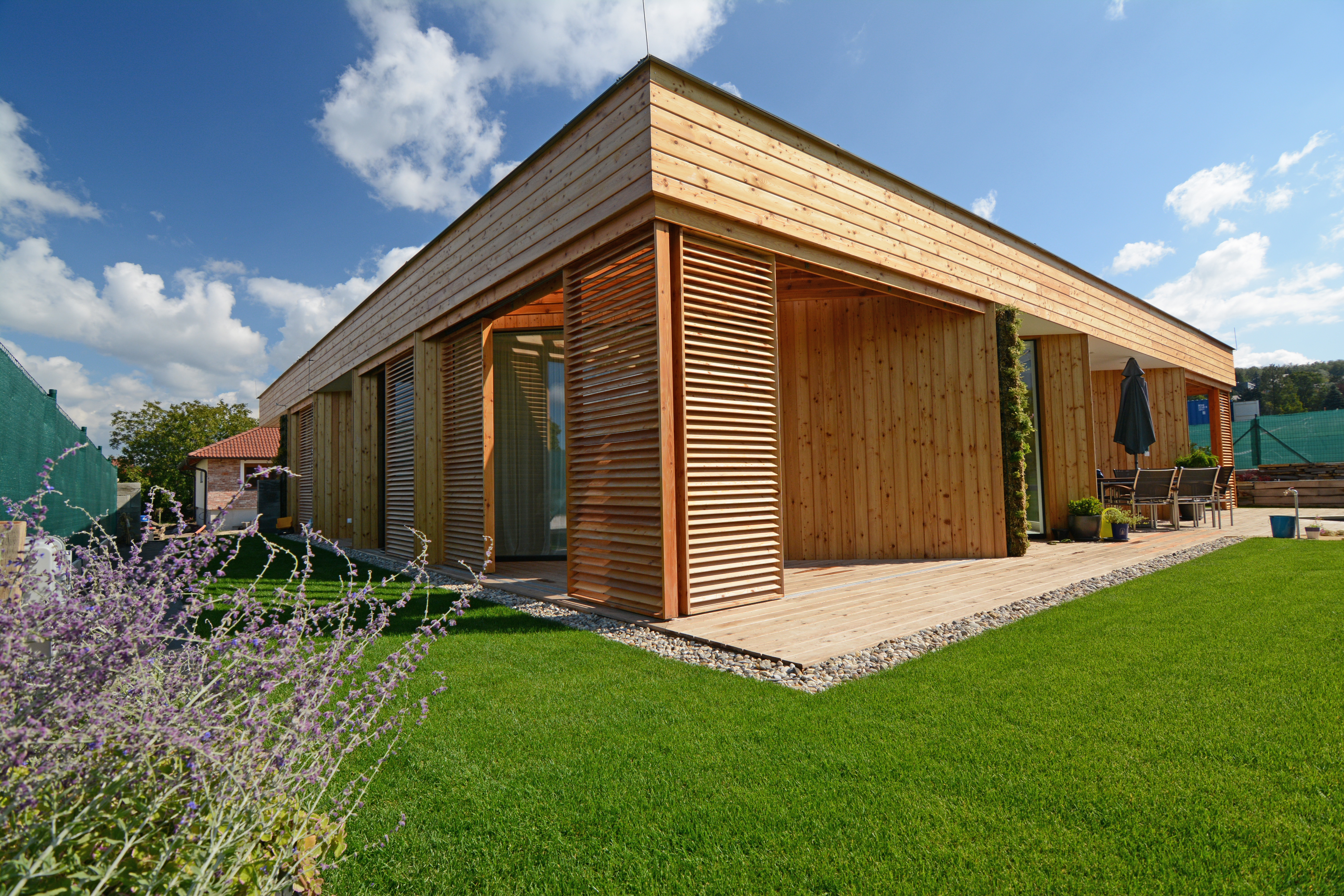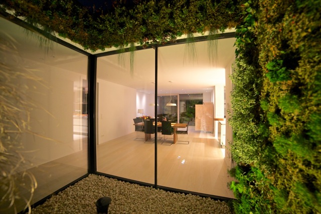 Týmto rastrovaním sa zabráni oslneniu počas horúcich letných dní, ale počas zimného obdobia alebo pri východe, či západe Slnka budú lúče voľne padať do interiéru. Pre prípadné prevádzkové zatienenie vnútorných miestností aj pri nižších polohách Slnka, ale aj pre zabezpečenie intimity pri väčších presklenných plochách, bude slúžiť systém posuvných žalúzií, pohybujúcich sa po vonkajšej štvorcovej hrane domu. Vnútornú atmosféru domu ešte dopĺňajú dva výrazné architektonické prvky: otvorené átrium so živým stromom a jednoduchou „parkovou“ úpravou /tráva, štrk podsyp/ a veľký strešný svetlík v detskej kúpelni, ktoré umožnia prestupu denného svetla do „hĺbky“ interiéru, ale aj netradičných priehľadov a výhľadov na dennú resp. nočnú oblohu.