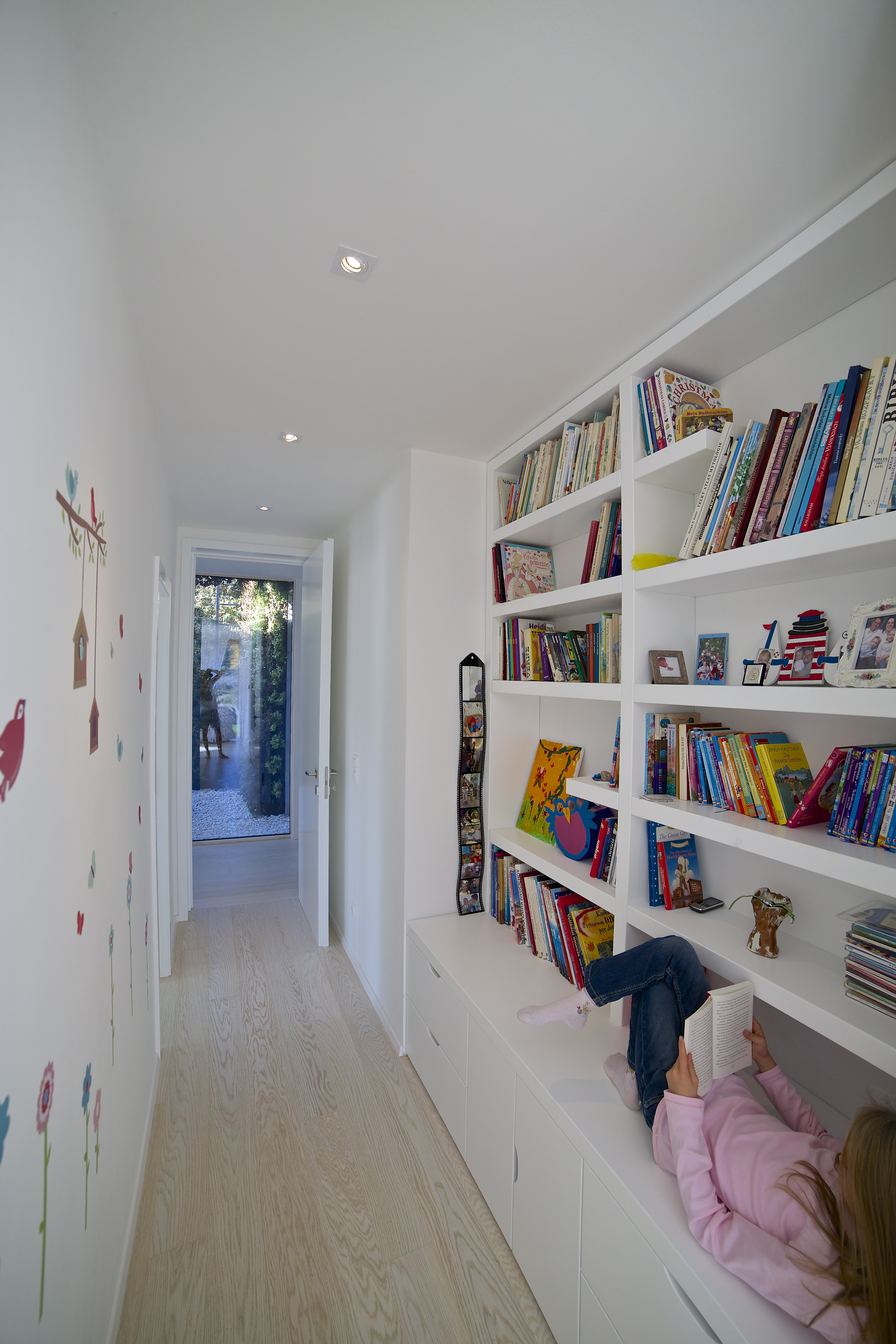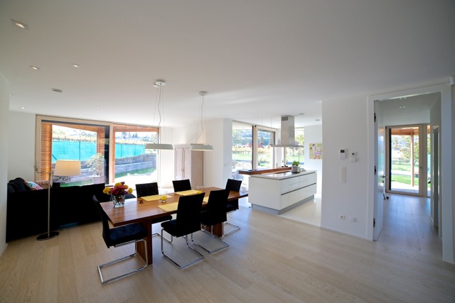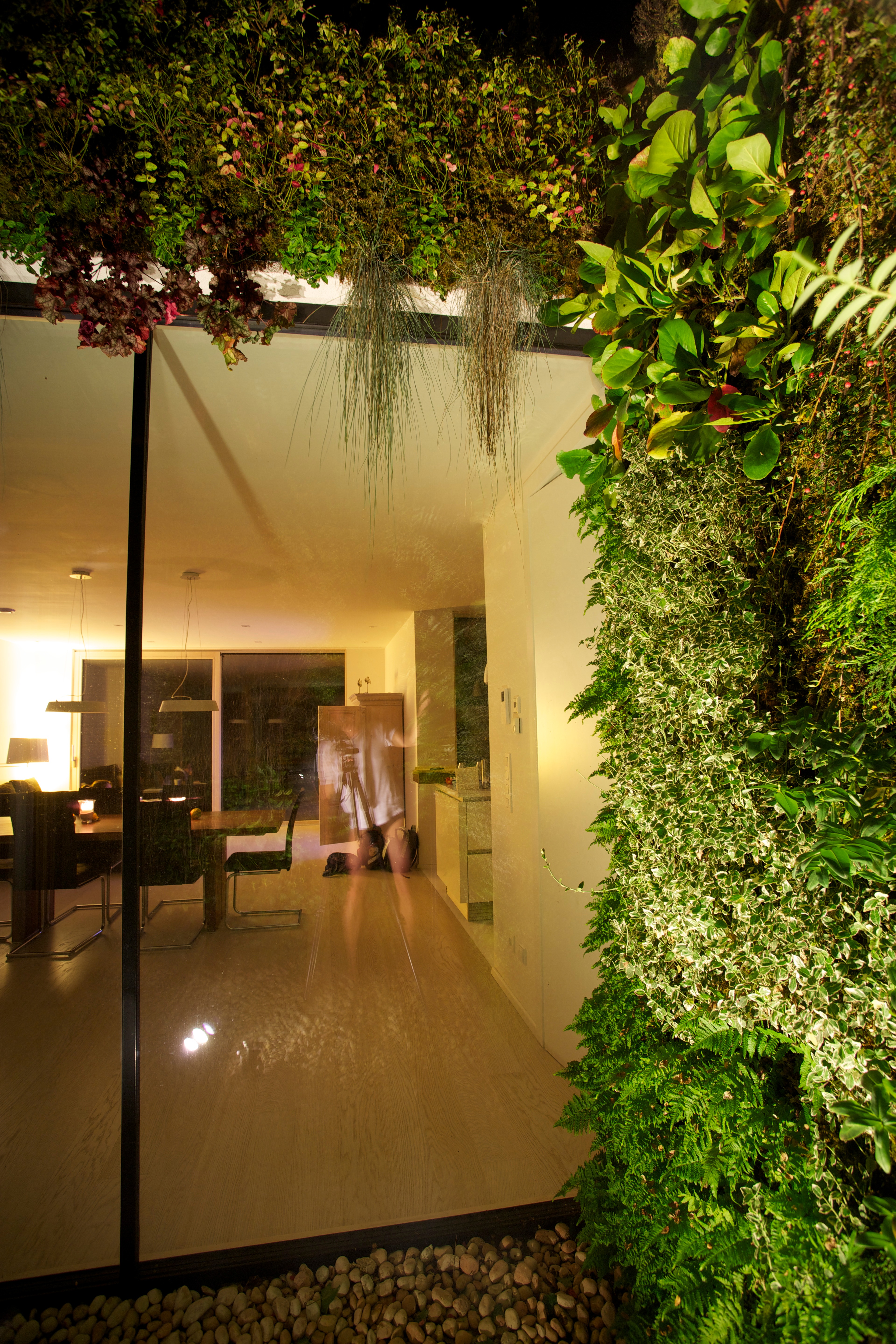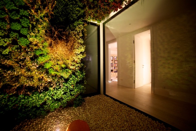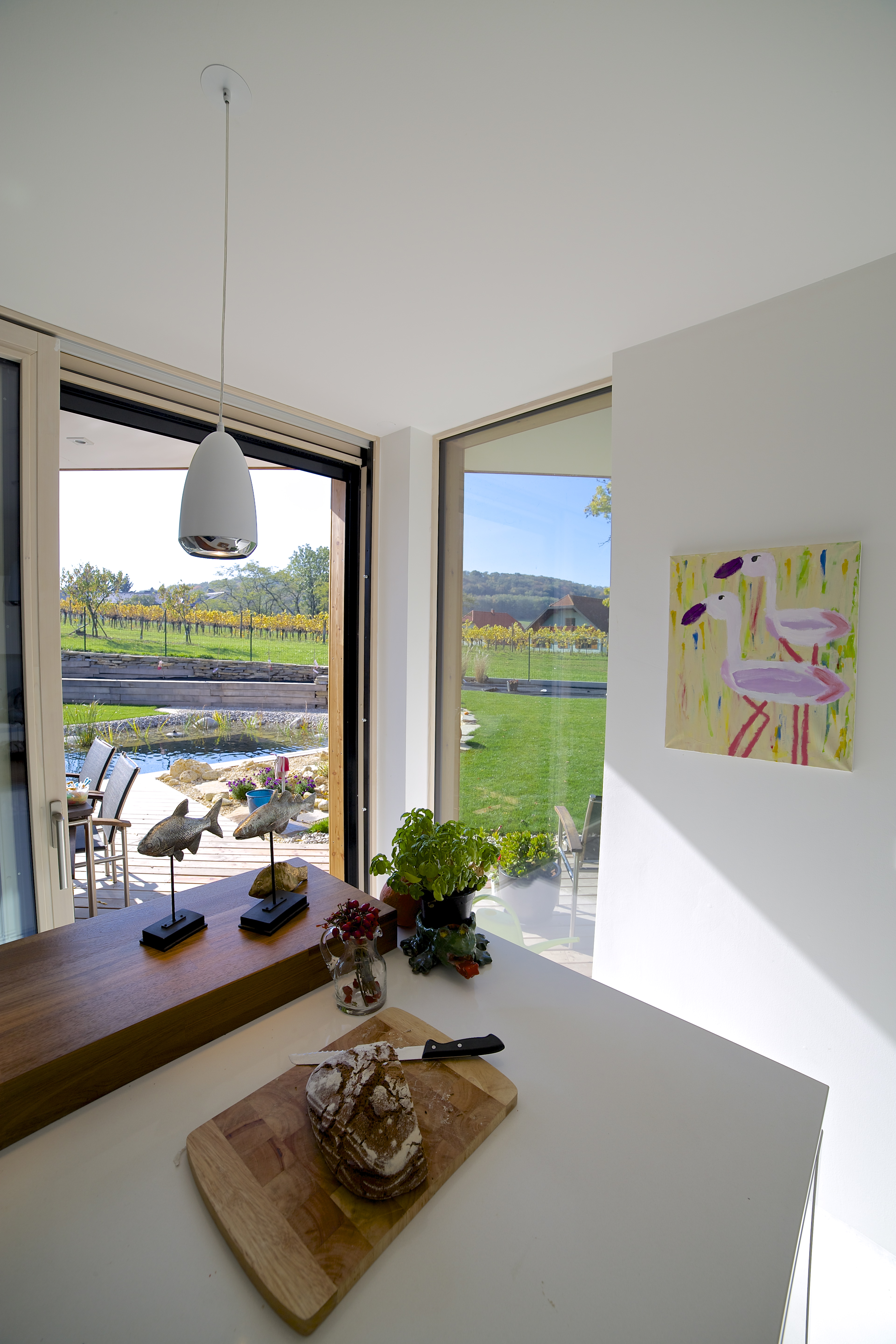Týmto rastrovaním sa zabráni oslneniu počas horúcich letných dní, ale počas zimného obdobia alebo pri východe, či západe Slnka budú lúče voľne padať do interiéru. Pre prípadné prevádzkové zatienenie vnútorných miestností aj pri nižších polohách Slnka, ale aj pre zabezpečenie intimity pri väčších presklenných plochách, bude slúžiť systém posuvných žalúzií, pohybujúcich sa po vonkajšej štvorcovej hrane domu. Vnútornú atmosféru domu ešte dopĺňajú dva výrazné architektonické prvky: otvorené átrium so živým stromom a jednoduchou „parkovou“ úpravou /tráva, štrk podsyp/ a veľký strešný svetlík v detskej kúpelni, ktoré umožnia prestupu denného svetla do „hĺbky“ interiéru, ale aj netradičných priehľadov a výhľadov na dennú resp. nočnú oblohu.