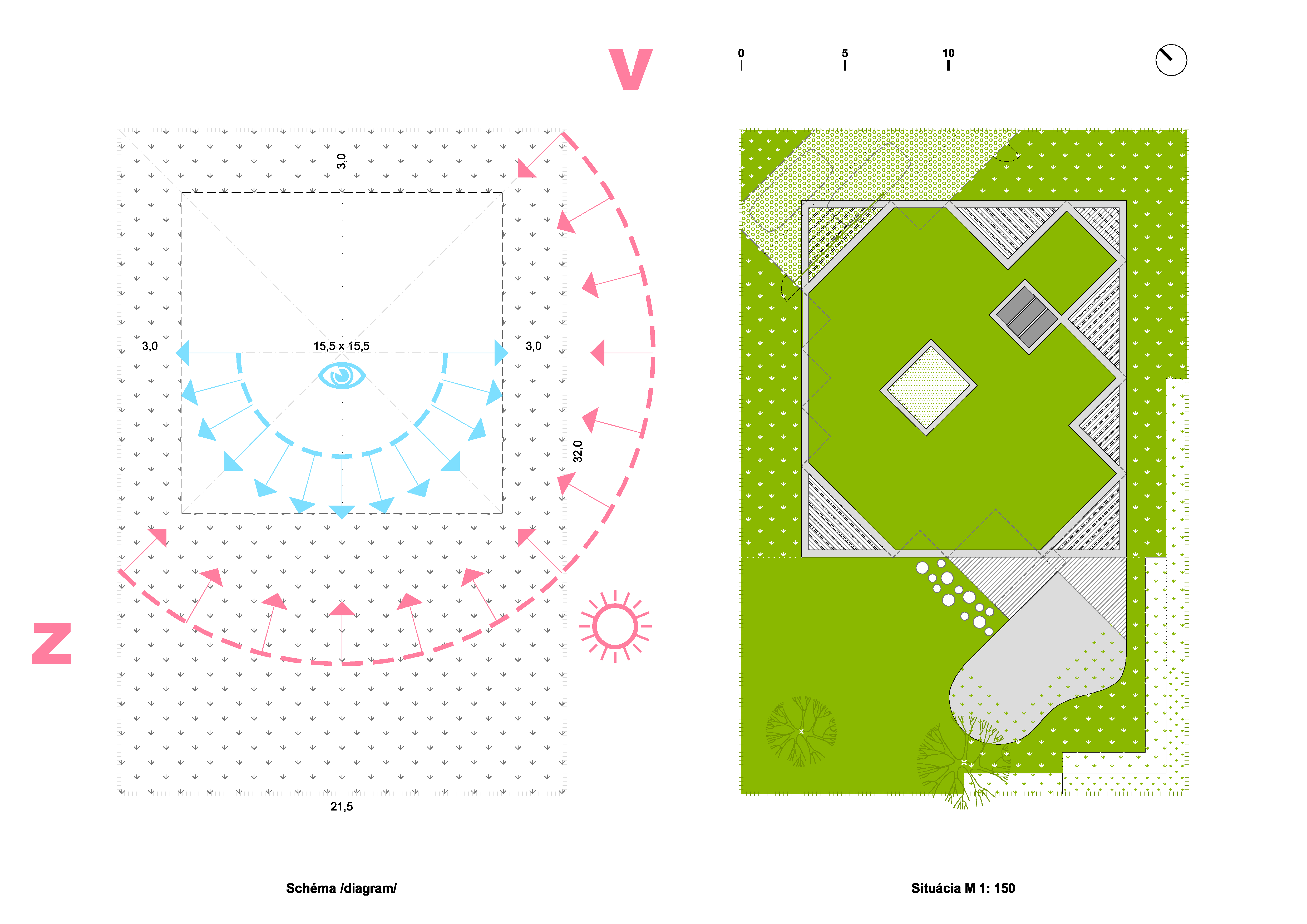 Objekt novostavby rodinného domu je navrhnutý s požadovanými odstupovými vzdialenosťami od hraníc pozemku /3 m od susedných pozemkov a 3,5 m od novej ulice, s požadovanými priestorovými a plošnými kapacitami určenými investorom. Obrys domu tak priamo reaguje na takmer ortogonálne hranice pozemku a „okupuje“ najmä jeho hornú, severovýchodnú, uličnú časť. Týmto spôsobom ostáva dôležitý juhozápadný priestor pozemku voľný pre divokorastúcu záhradu, s bio-záhradkou a prírodným okrasným, aj kúpacím jazierkom. Na základe klientom naznačených dispozičných väzieb a prioritných exteriérových výhľadov a priehľadov vznikol koncept štvorcového prízemného domu, avšak aj s vlastným prírodným „stredom“ domu, s vnútorným átriom.