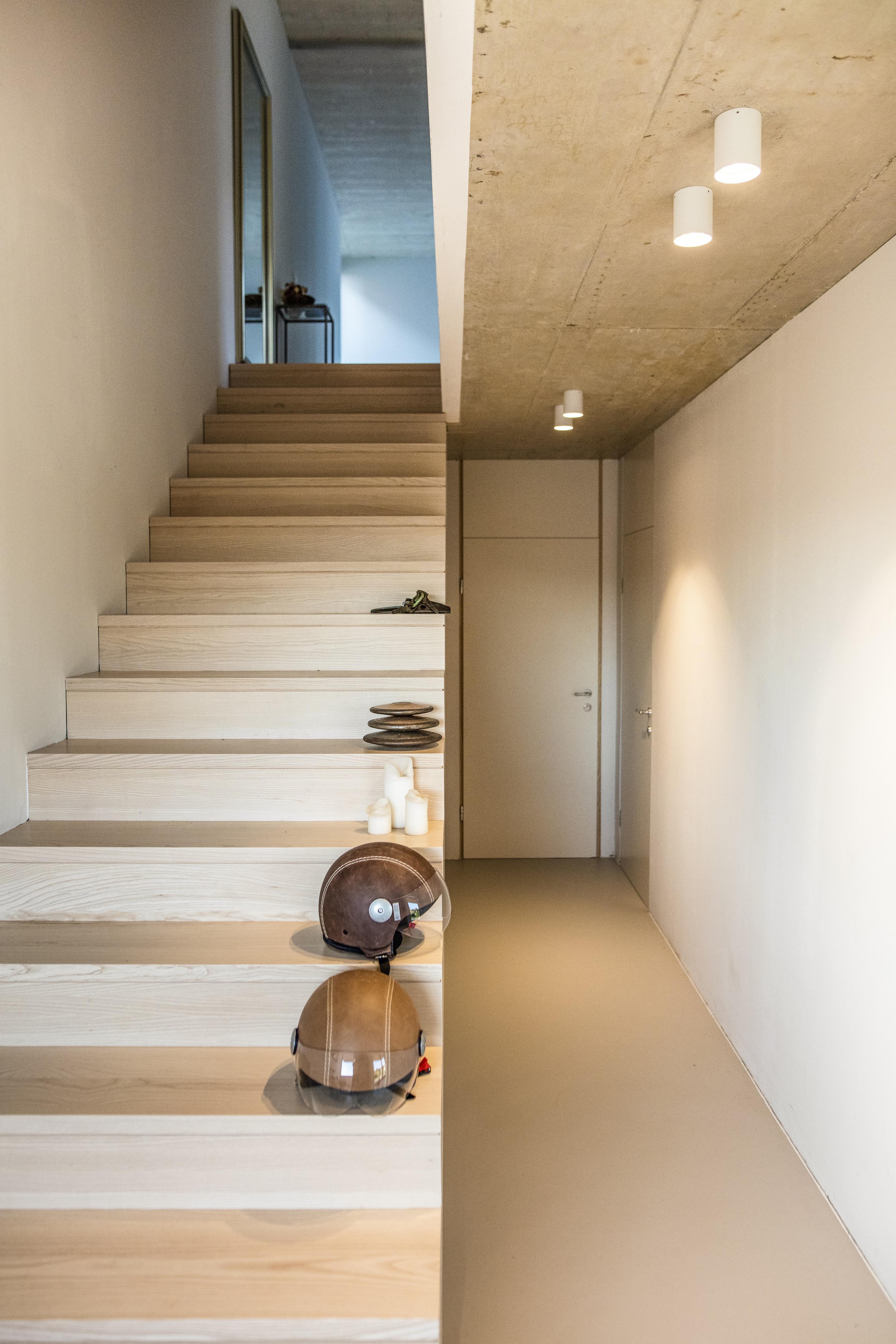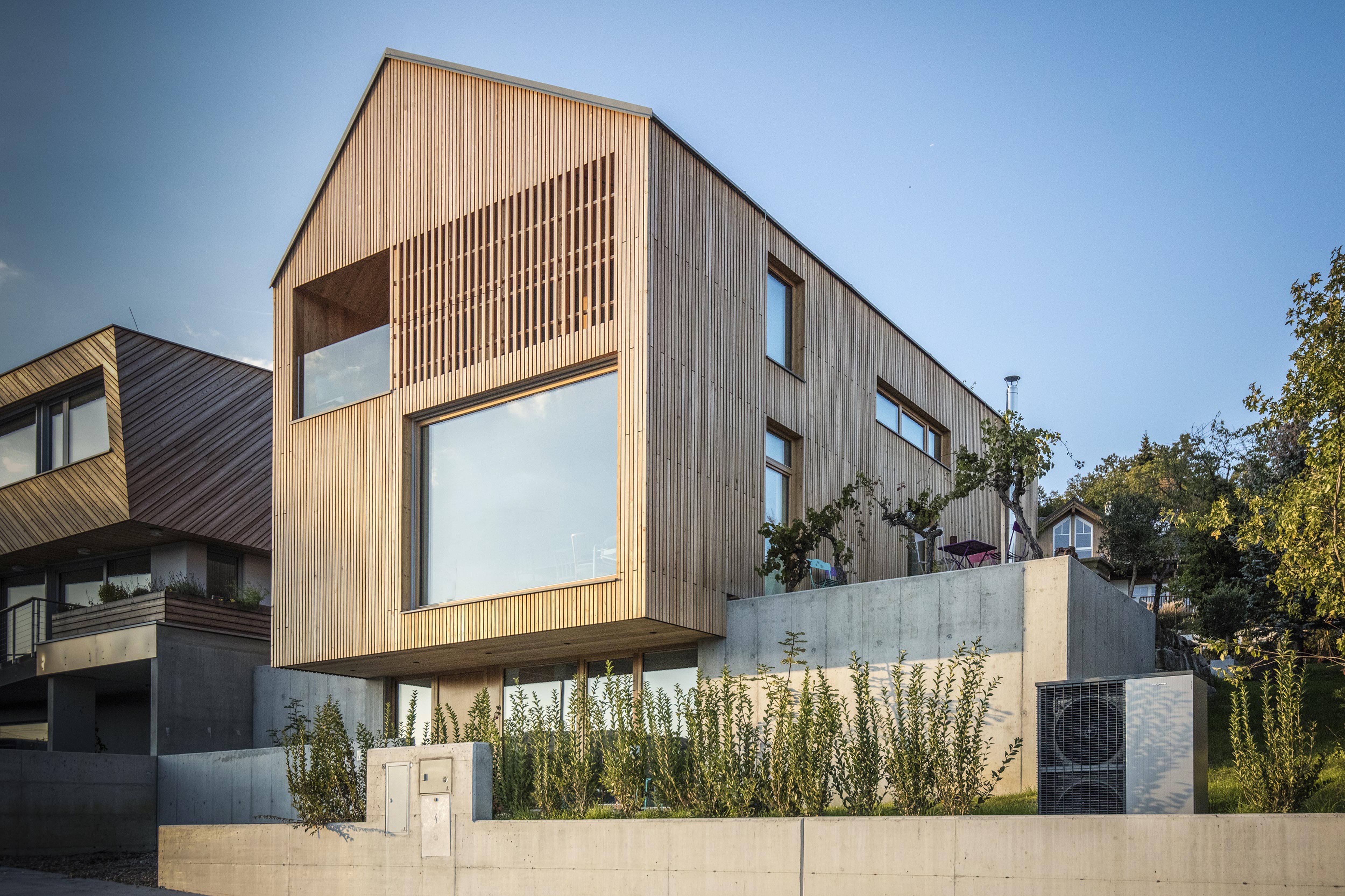 Drevené podlažia domu sú vykonzolované za obrys betónového múru - podobne ako skalný previs. Riešenie ukrýva symboliku vo vzťahu k majiteľom. Tí patria k elitným rakúskym lezcom.