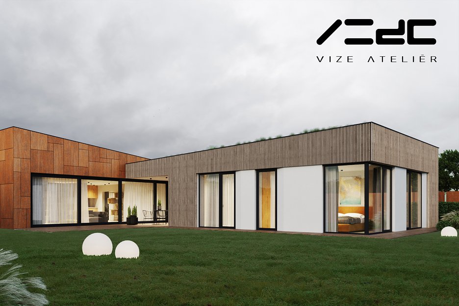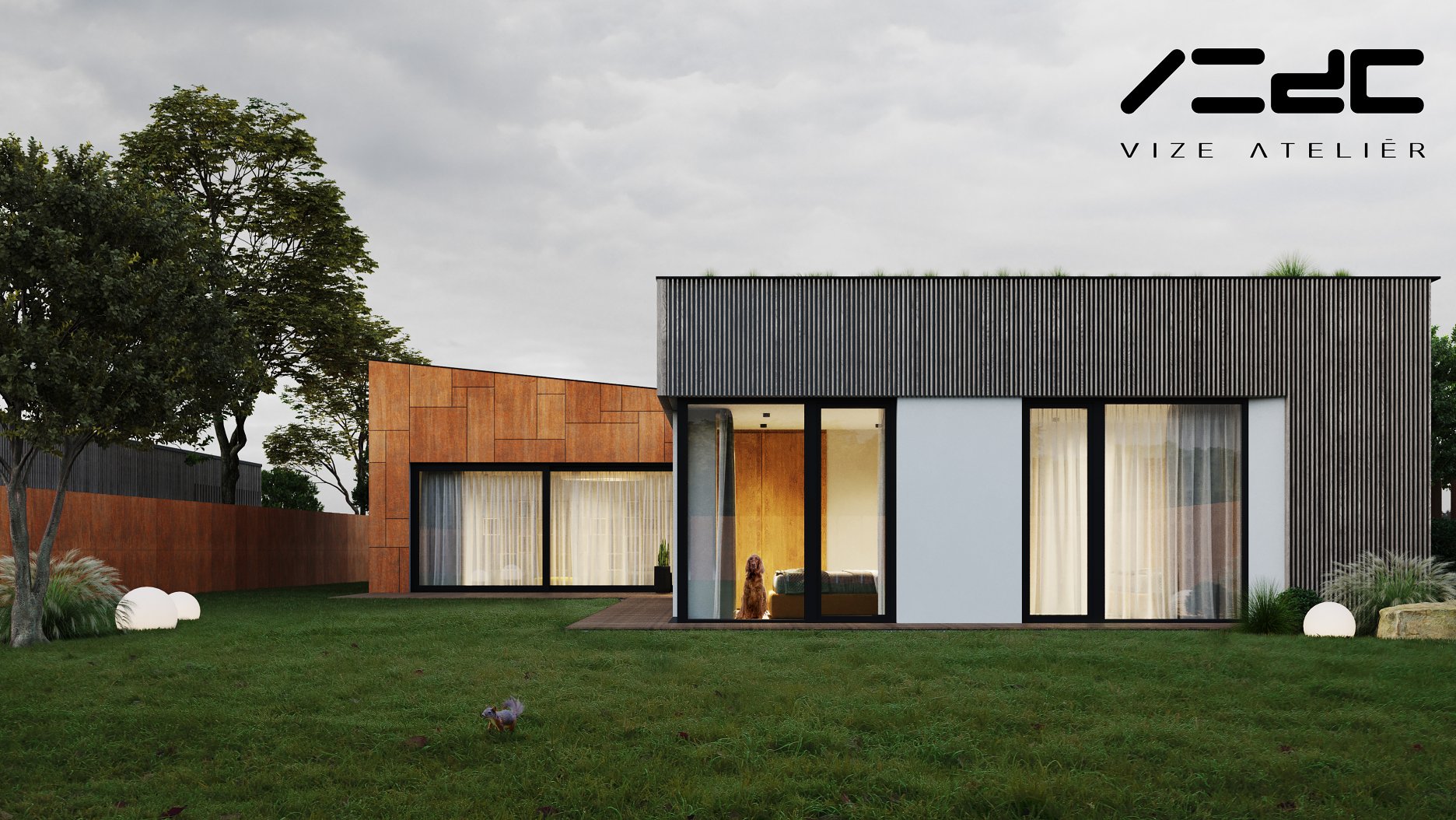 Zakomponovanie obkladu z Cortenu bolo požiadavkou klienta od začiatku. Ide o oceľ, ktorá oxidáciou vytvára na svojom povrchu patinu. Obklad pôsobí ako hrdzavý, ale v skutočnosti je voči korózii veľmi odolný. Materiálovým prevedením fasády sme rozdelili dom na dve hmoty. Súkromný trakt je stvárnený s dreveným obkladom, na obývačkovom je navrhnutý moderný kovový obklad.