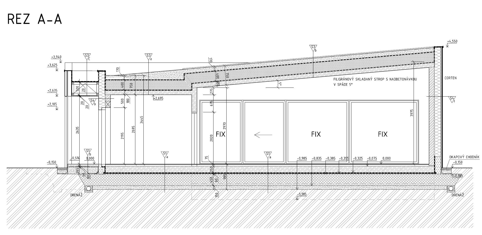 Pri jednopodlažných domoch je vždy pre architekta výzva stvárnenie hmoty domu tak, aby nepôsobila fádne. V tomto prípade sme zvolili hru s dynamickým zošikmením plochých striech. Kým v súkromnom trakte sa sklon prejavuje len v konštrukcii strechy a v interiéri je strop vodorovný, v obývačke je navrhnutý nadštandardný šikmý strop so zväčšujúcou sa svetlou výškou. V najvyššom bode dosahuje výšku 3,7m.
