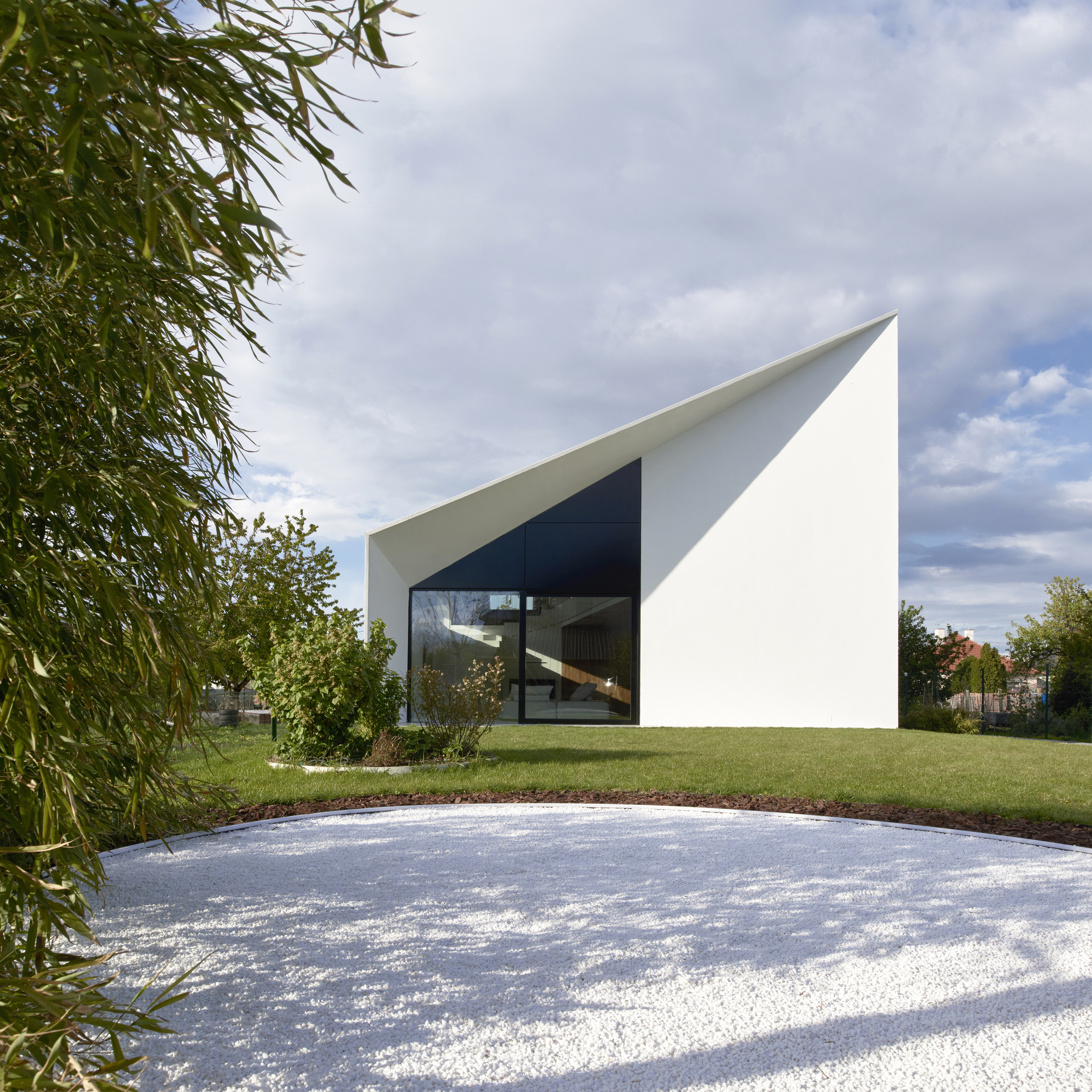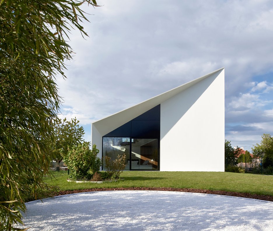 Na jednej strane reaguje na blízku kubickú zástavbu, na strane druhej reflektuje archetyp vidieckeho domu so sedlovu strechou. Výtvarnosť riešenia je založená na kompozícii bielej hmoty, do ktorej sú vsadené tmavé geometrické plochy zasklenia.