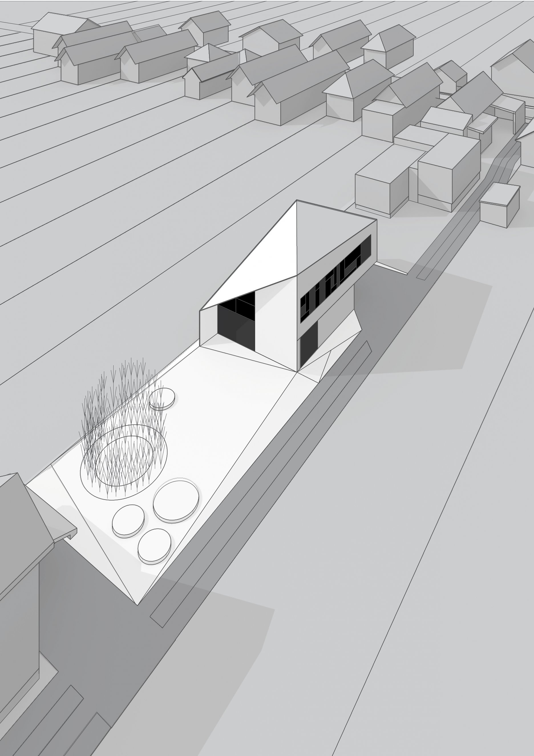 Realizovaný objekt nadväzuje na vidiecky kontext tvorivým spôsobom. Vychádza zo šikmých striech, ale mení ich formu na súdobý šikmý diagonálny tvar s pozdĺžnou osou sever-juh, ktorá sa tak stáva osou celého riešeného priestoru a súčasne prináša z každého uhla pohľadu iný zážitok. Priečny smer (vo vnútri zástavby) je nezastavaný. Otvára zaujímavé priehľady do zelene, hlavne z vyšších horizontov.