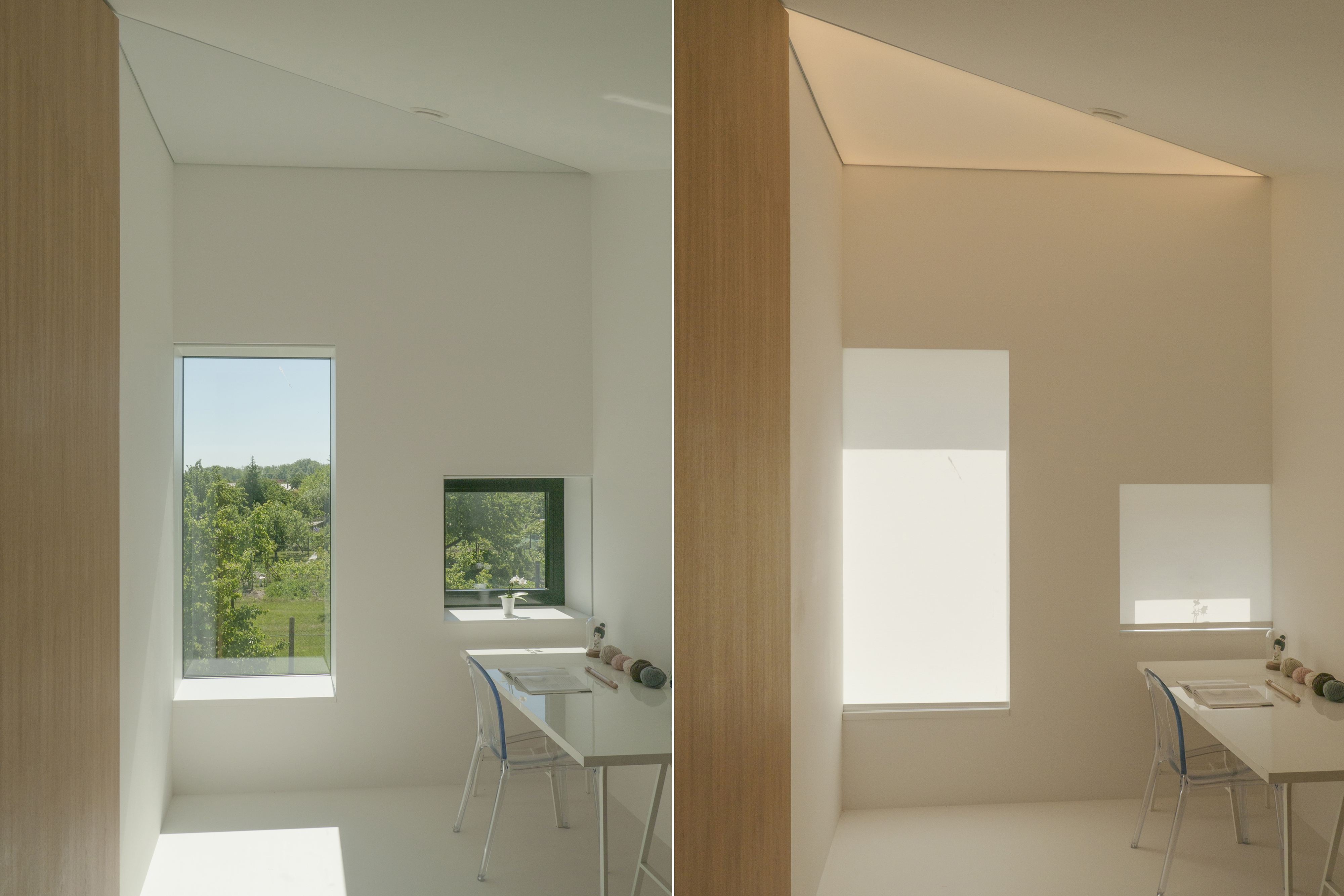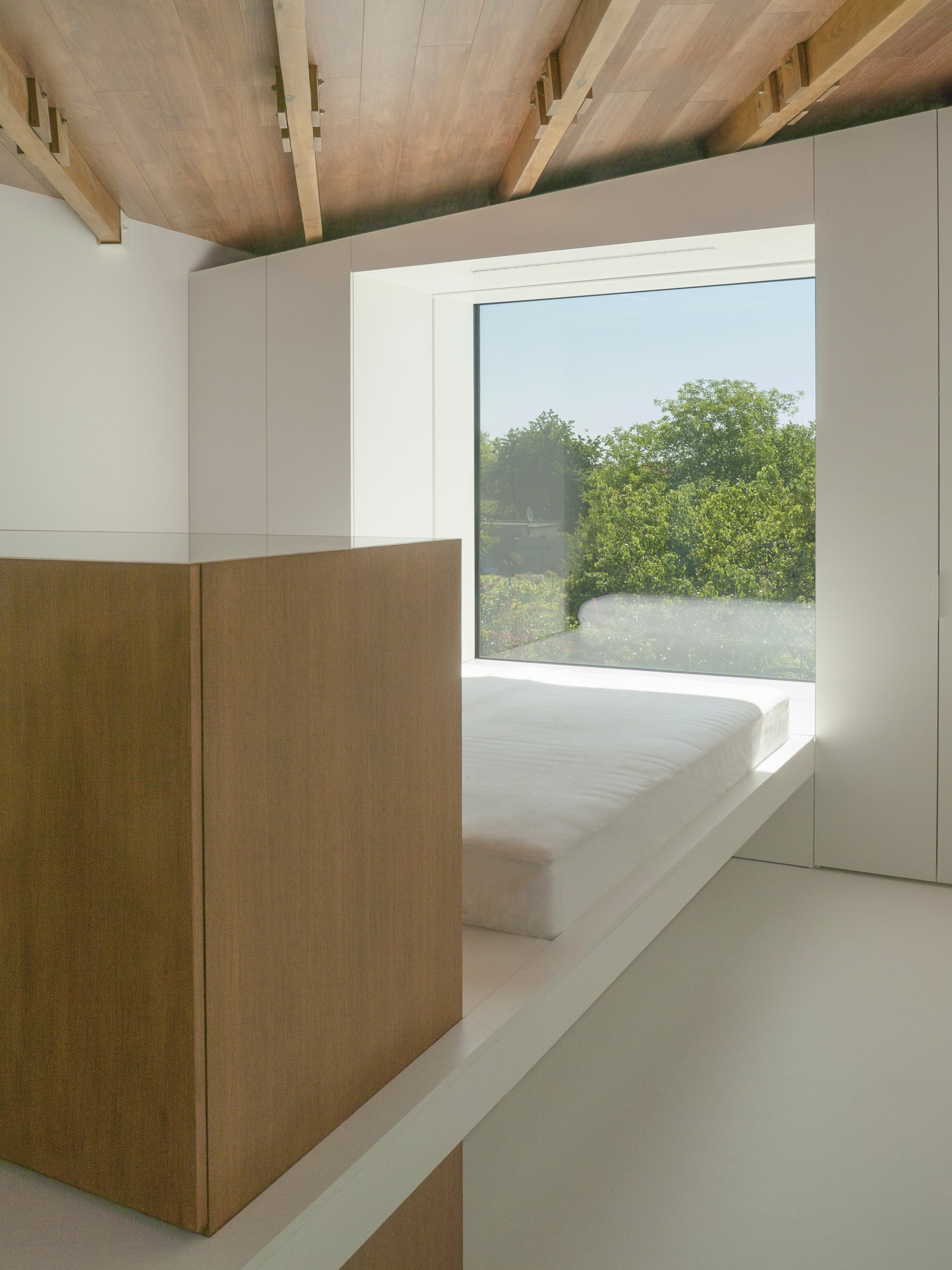 V interiéri je použitý sádrokartónový obklad stien a stropov s bielym matným náterom. Biela matná liata podlaha je miestami doplnená dubovým obkladom. Každá miestnosť má základnú bielu farebnosť. Na vybraných pozíciách je akcentovaná o drevený detail v podobe vloženej podlahy, obkladu, podhľadu, prípadne aj dreveného umývadla a sprchového kúta... Dôležité interiérové prvky (napr. sedenie a osvetlenie) sú doplnené formou transparentných objektov z číreho polyakrylátu.