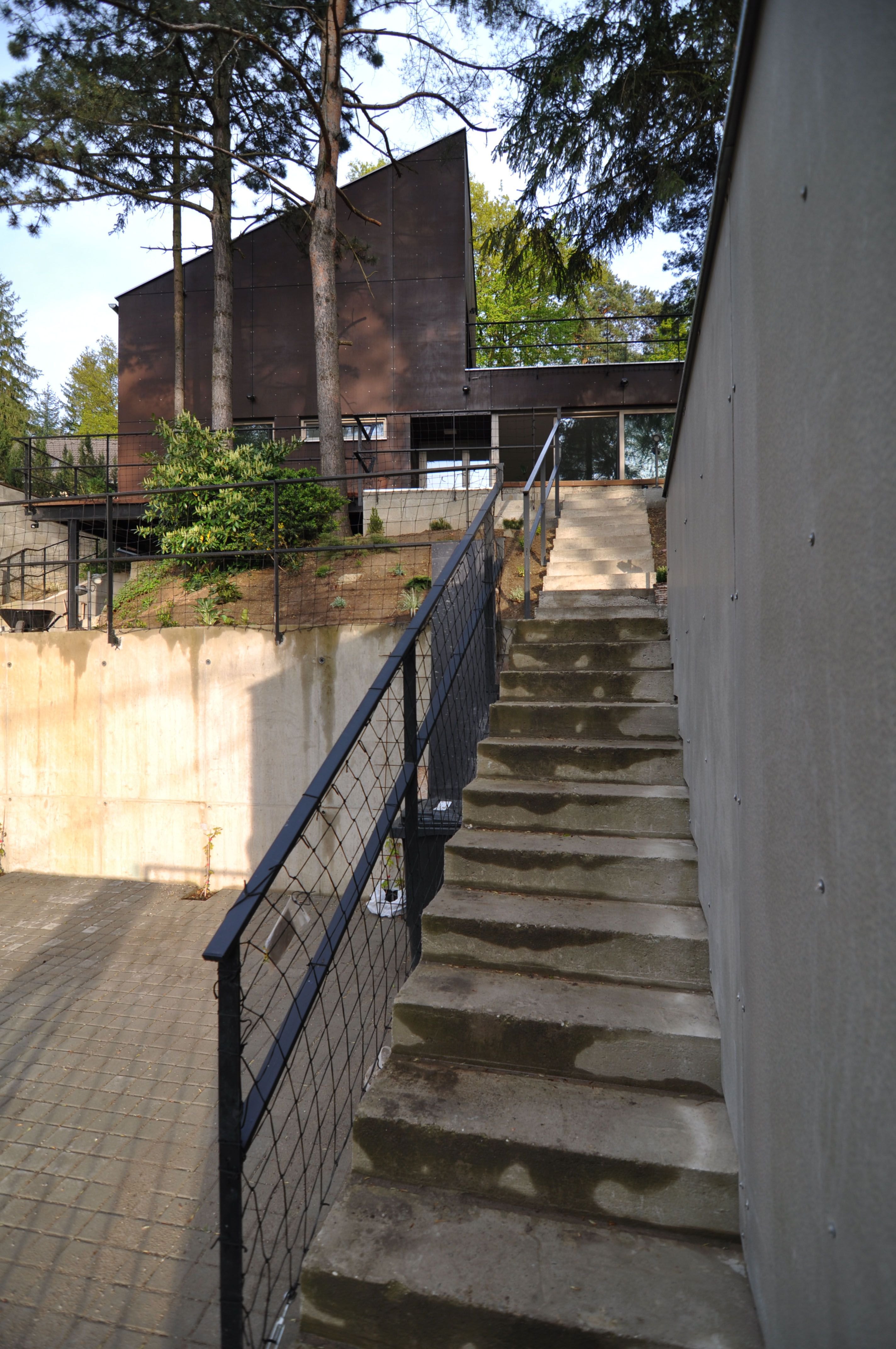 Na pozemku sa nachádzala murovaná čiastočne podpivničená chata a garáž. Garáž a pivnica ostali, chata bola zbúraná a na jej mieste postavený nový objekt. Vchod do objektu je cez drevenú terasu ktorú prerastajú stromy. Vchádza sa priamo do dennej časti - jedáleň, kuchyňa a obývacia izba. Priamo pri vstupe je hosťovské WC, šatník a hosťovská izba - momentálne detská herňa s vlastnou kúpeľňou. Celá dispozícia dennej časti je otvorená a prepojená s exteriérom presklenou stenou. A samozrejme v dome nesmie chýbať pec, v tomto prípade sme vsadili na nórsku kvalitu.