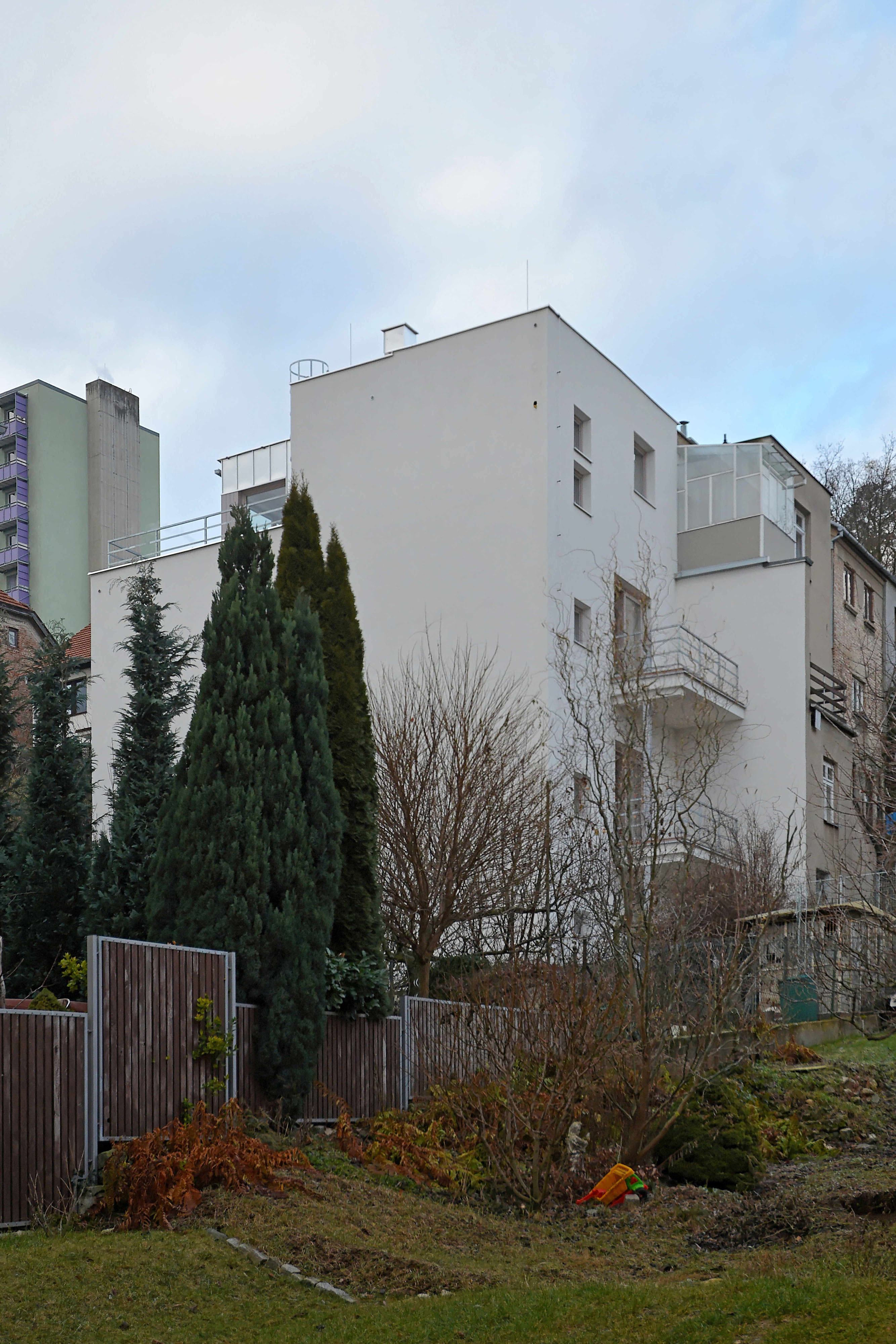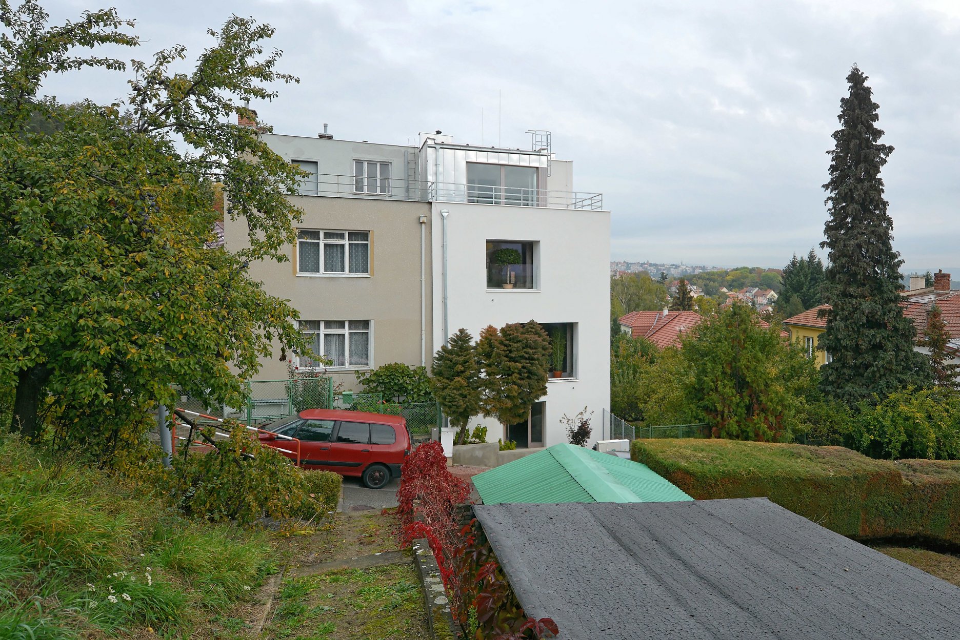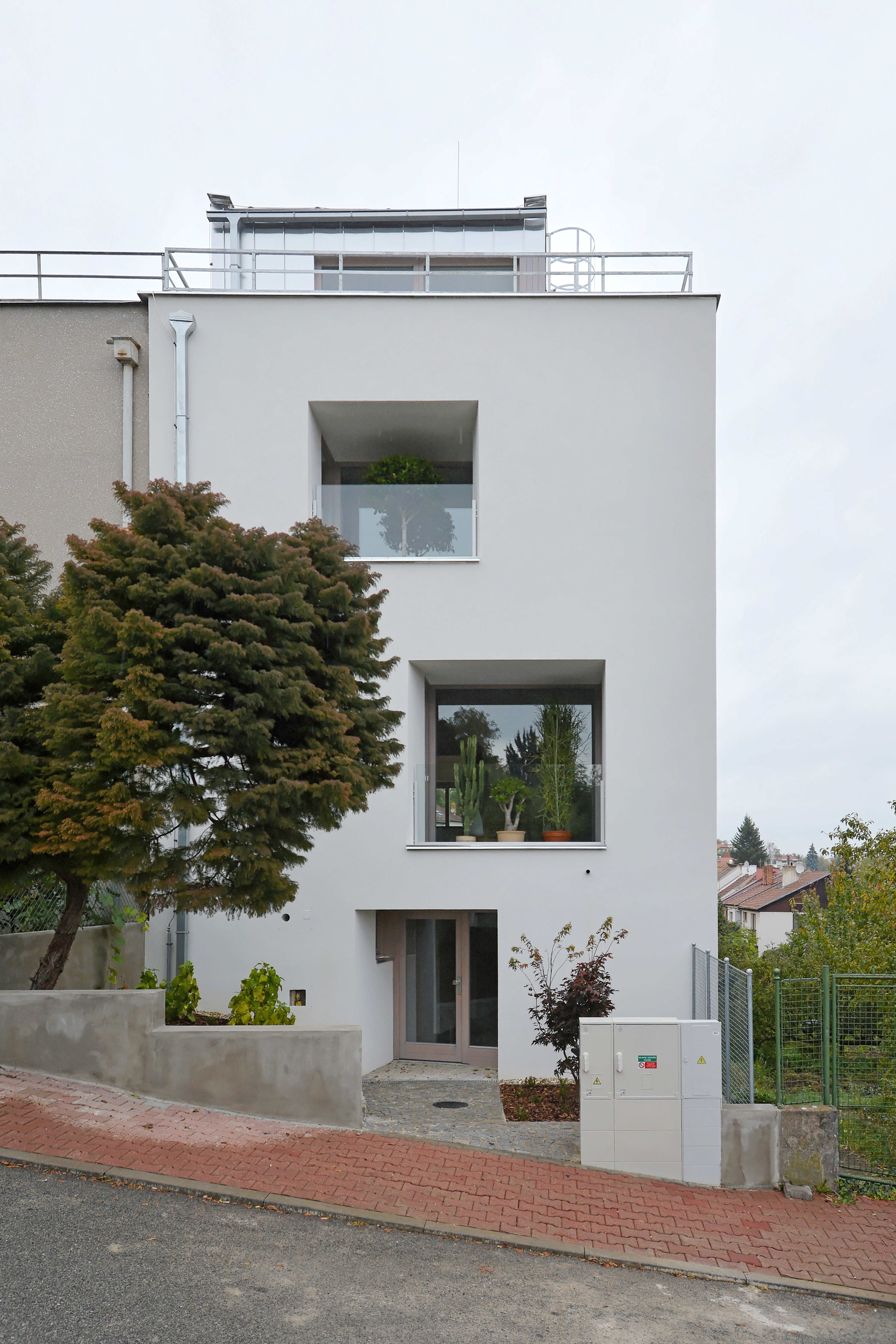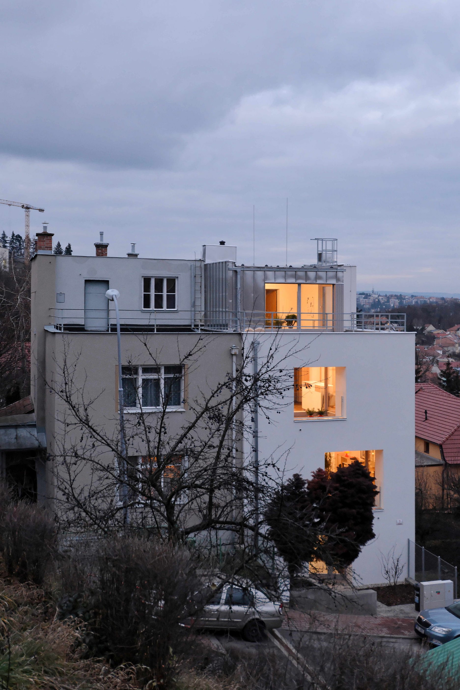 Rekonštrukcia sa týkala polovice staršieho dvojdomu s plochou strechou. Pôdorys objektu neprekročili pôvodnú zastavanú plochu, nové usporiadanie stavebných otvorov pomáha zlepšiť využite vnútorného priestoru. Na najvyššom podlaží pribudla ľahká drevená nadstavba opláštená titánzinkovým plechom.