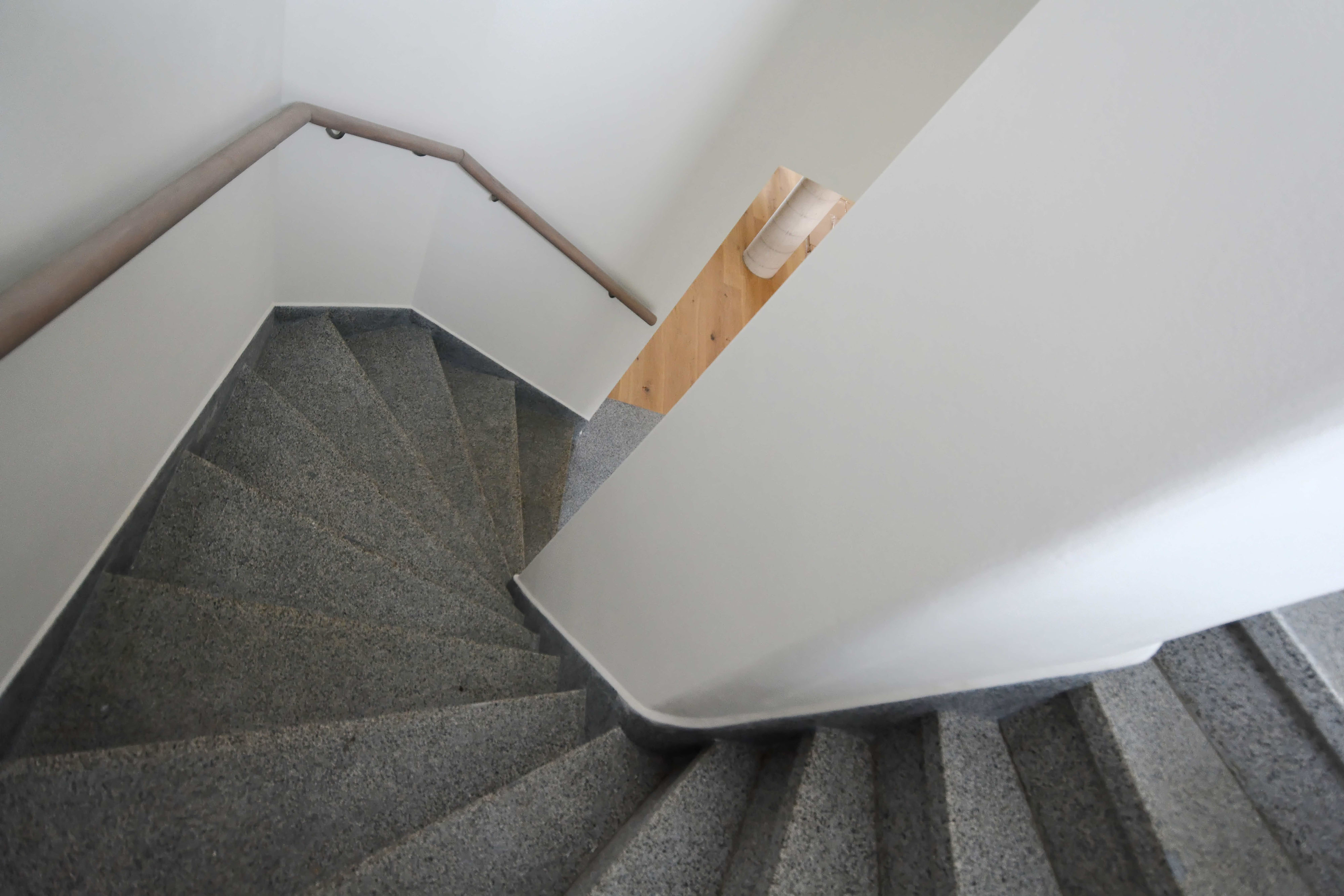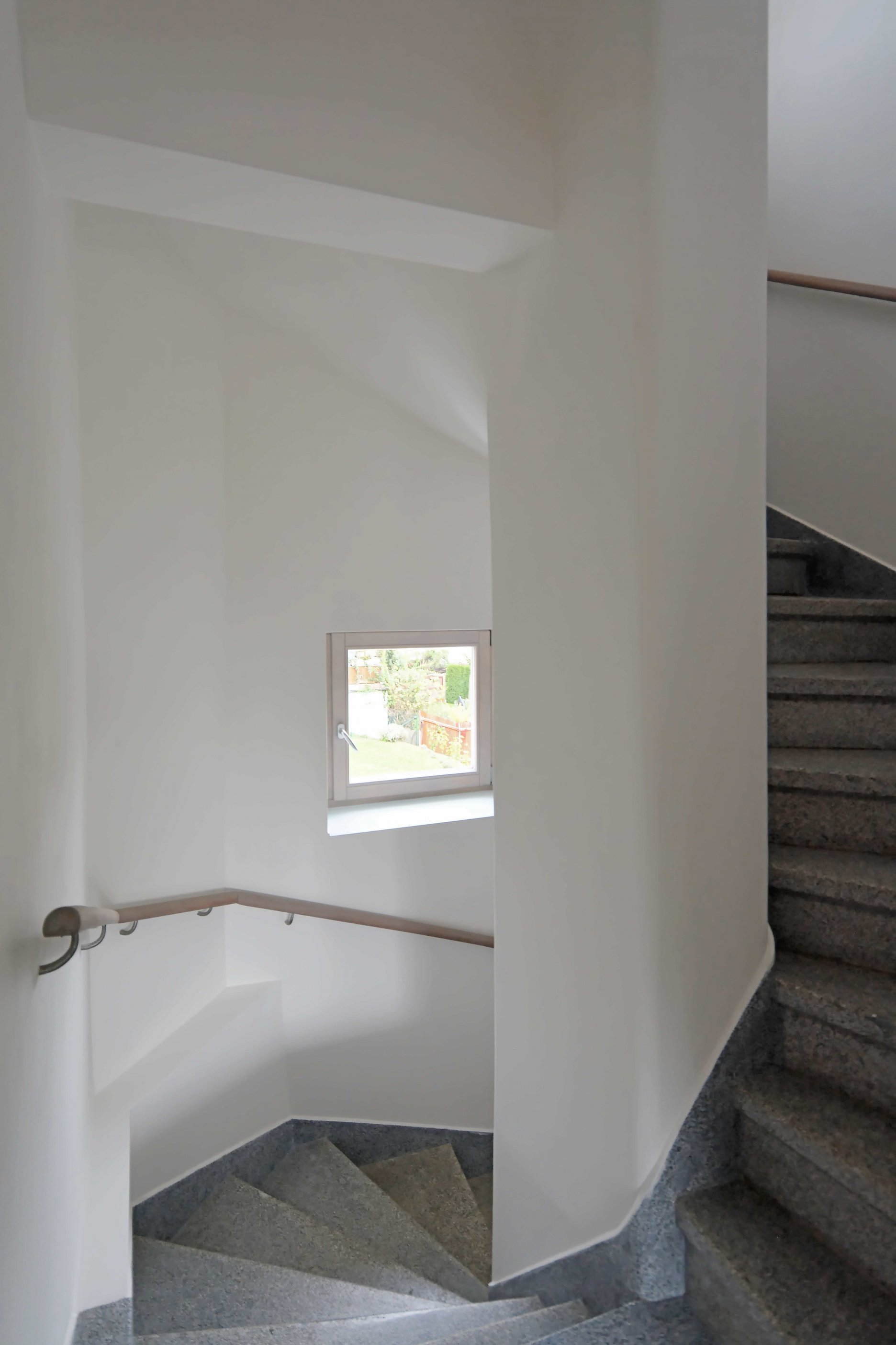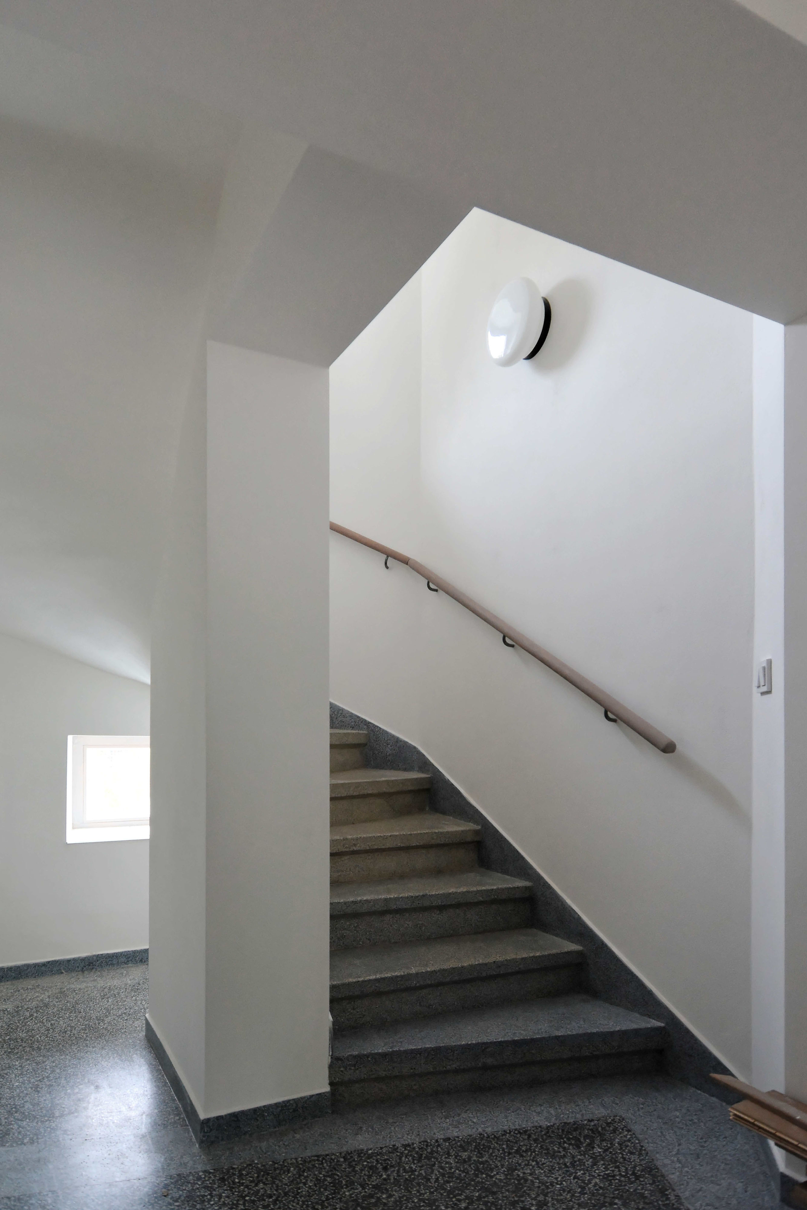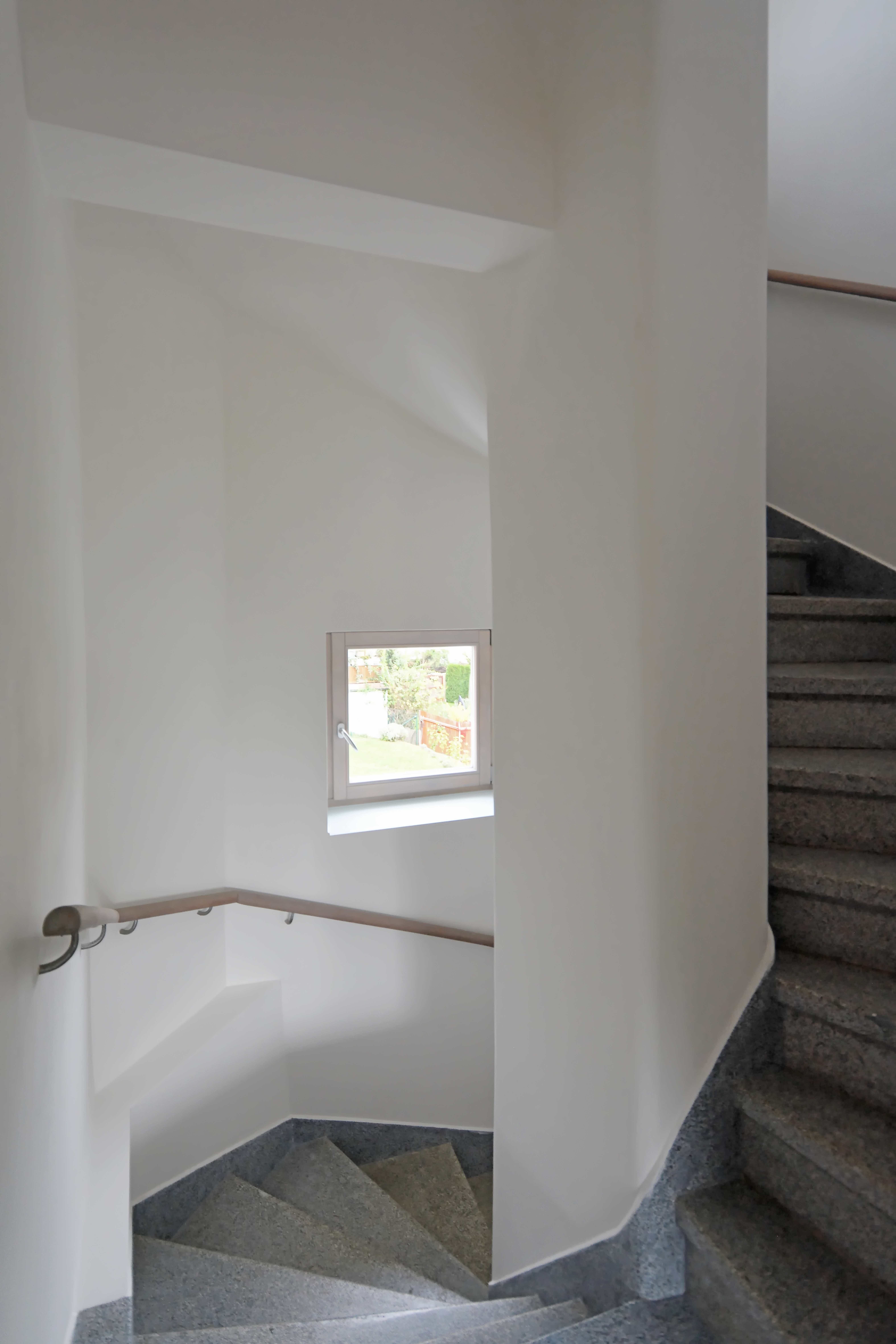 Podlažia sú prepojené repasovaným terrazzovým schodiskom, ktoré prebieha pozdĺž fasád orientovaných do záhrady. Posunutím vstupných dverí do chodby vzniklo zastrešené závetrie. Na vstupnú halu je napojený sklad, hygiena a technická miestnosť. Najďalej od vstupu je schodisko a pracovňa, cez ktorú sa prechádza na záhradu. Celé prízemie má podlahu z repasovaného terrazza.