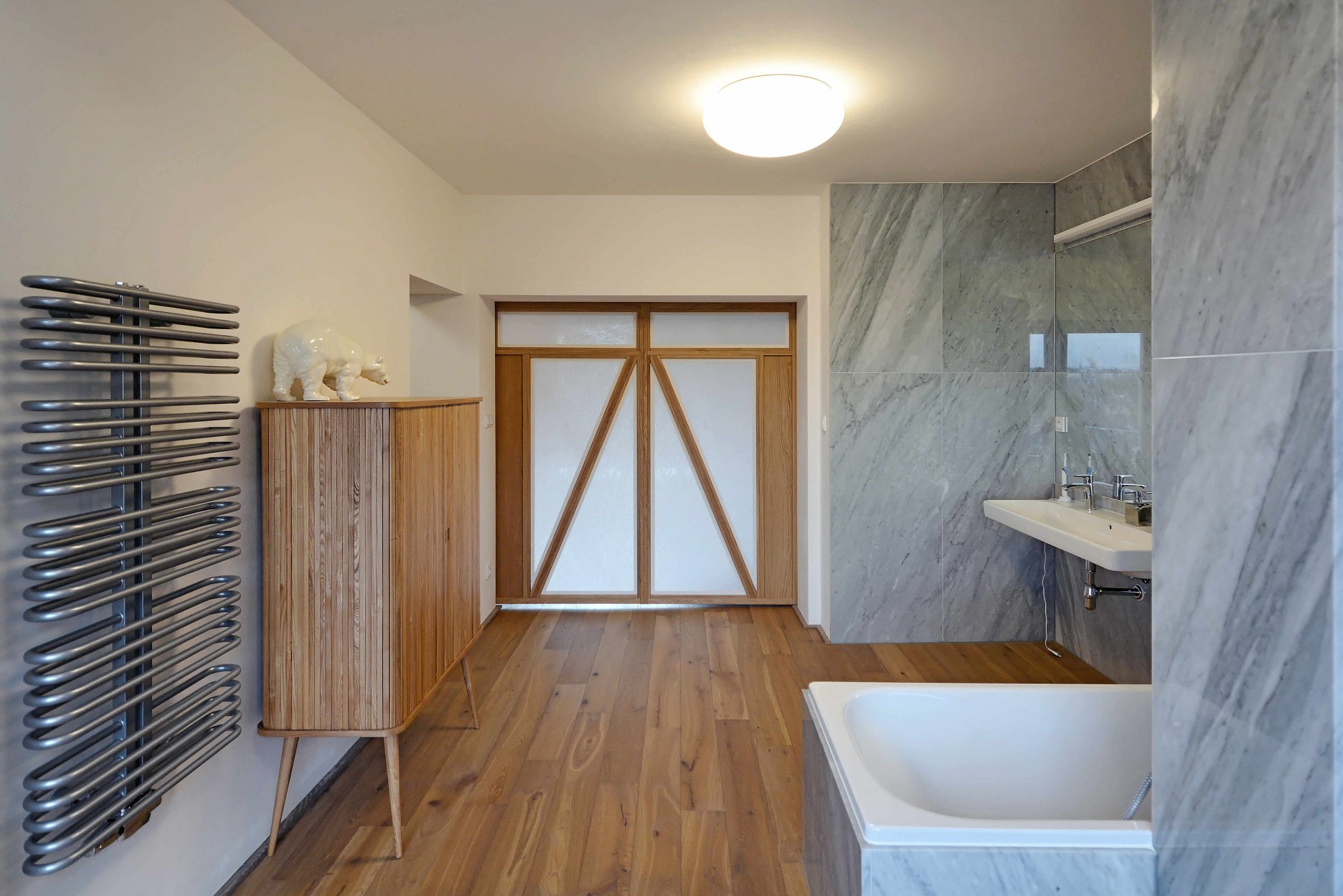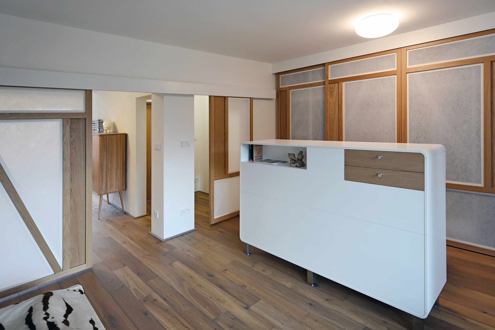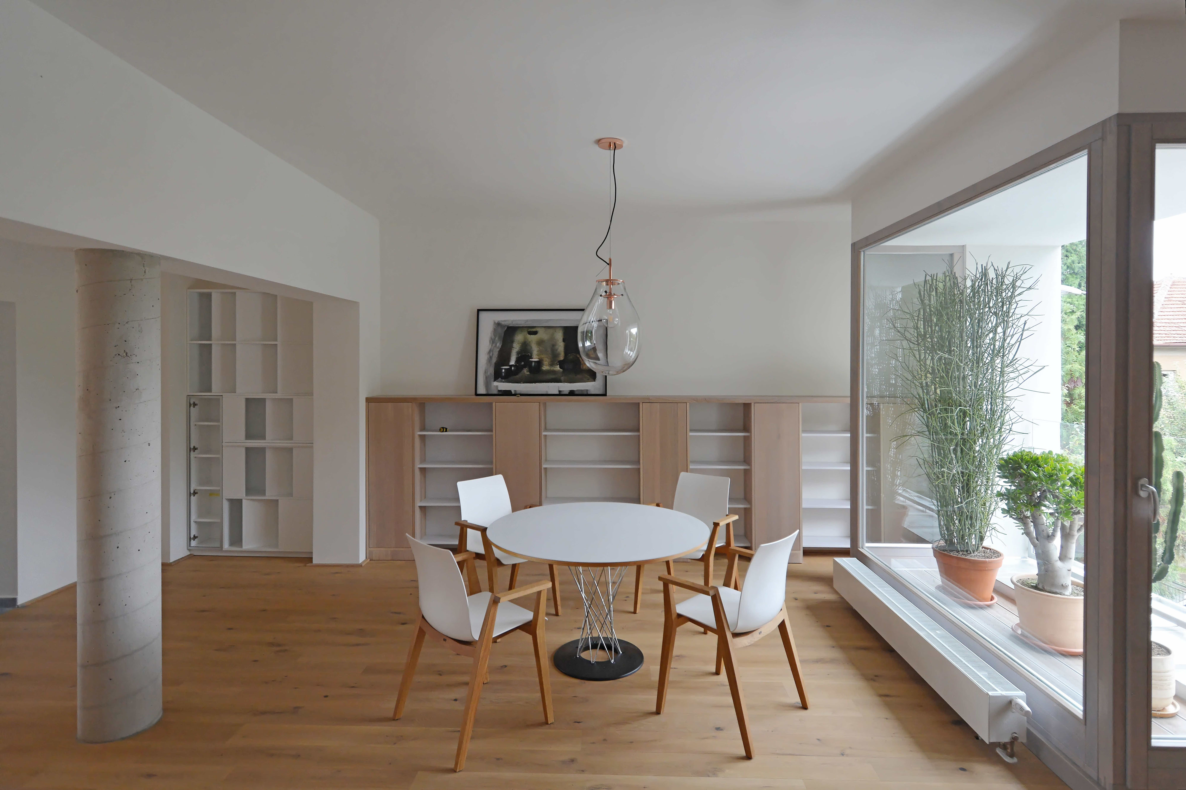 Na prvý pohľad neveľké zmeny. Obnovená fasáda, nové lodžie orientované do ulice, obytná plocha rozšírená o malý strešný ateliér... Vo výsledku komplexný autorský vklad. Malé stavebné zásahy výrazne prispeli k lepšiemu využitiu priestoru. Čo bolo dobré ostalo zachované (základná prevádzková schéma, pôvodné terrazzové schodisko...). Zvyšok nahradila nová funkčná a kvalitná vrstva.