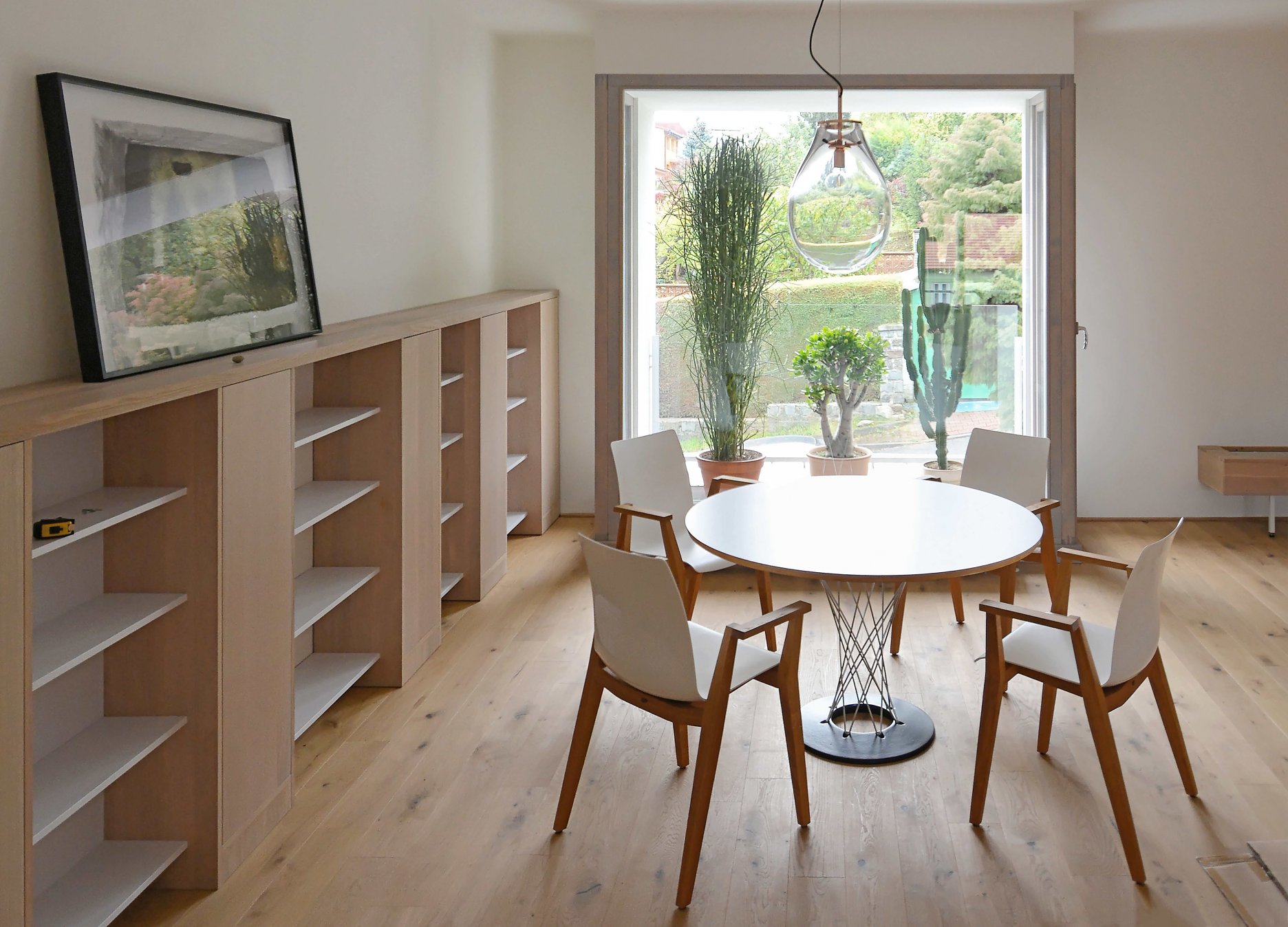 Z dôvodu nevyhovujúceho statického riešenia bolo nutné zmeniť priestorové usporiadanie vstupného podlažia. Do ortogonálneho rastra nosných stien boli vložené nové konštrukcie prebiehajúce v šikmom smere od vstupu až po schodisko. Dispozícia domu rešpektuje pôvodný priestorový koncept.