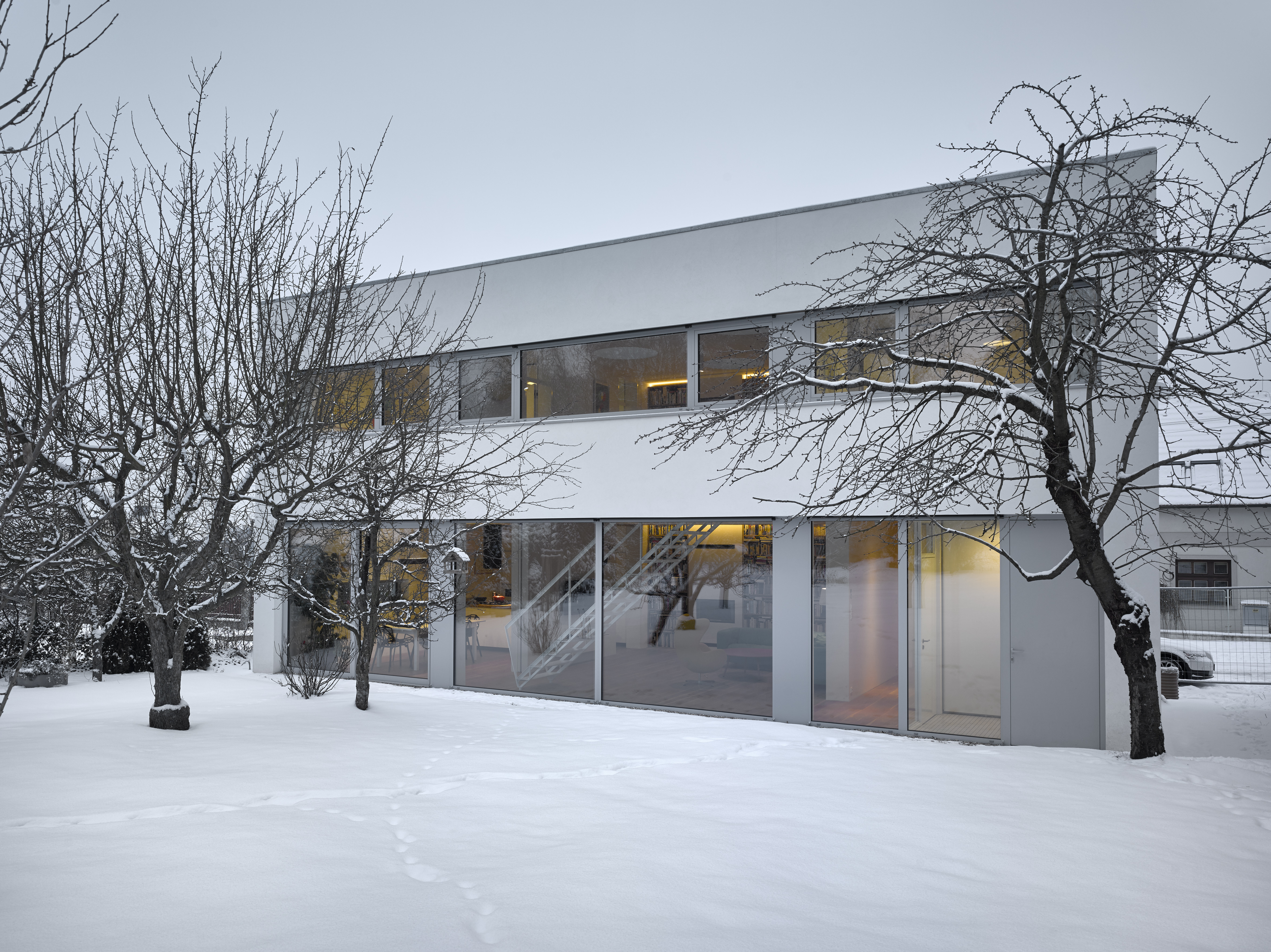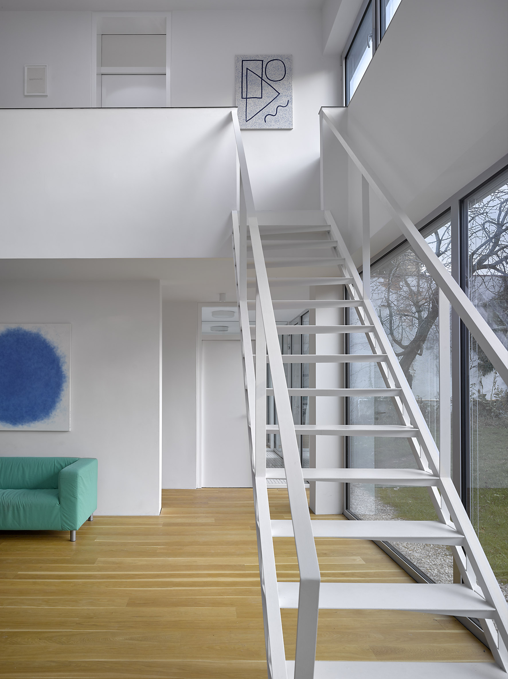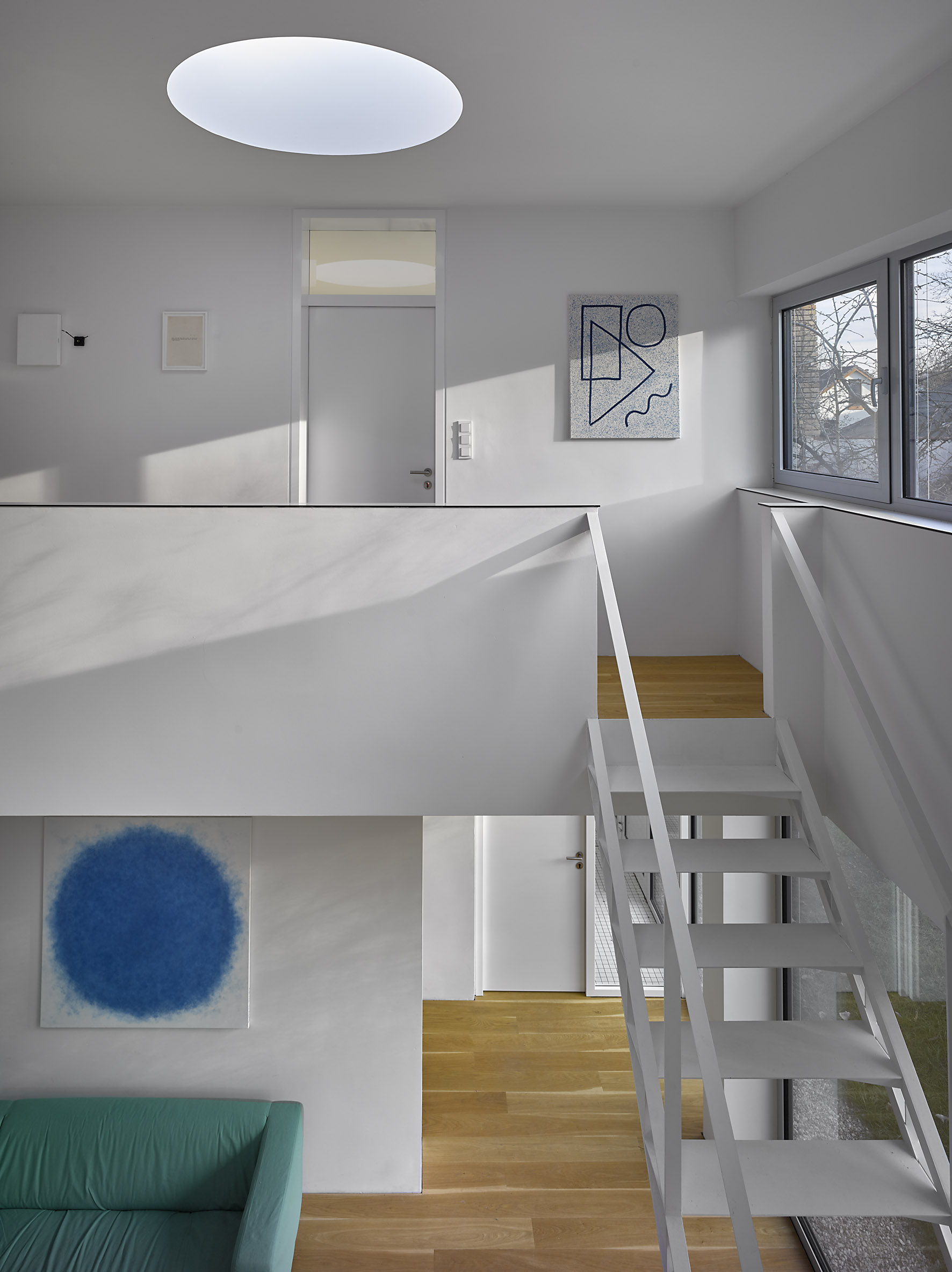 Hmotu rodinného domu tvorí exaktný biely dvojpodlažný kváder. "Projekt se vydal koncepcí hry s analogií bílého listu papíru, který si bude rodina postupně sama vybarvovat svou prací a sbírkou umění svých přátel výtvarníků", objasňujú autori.