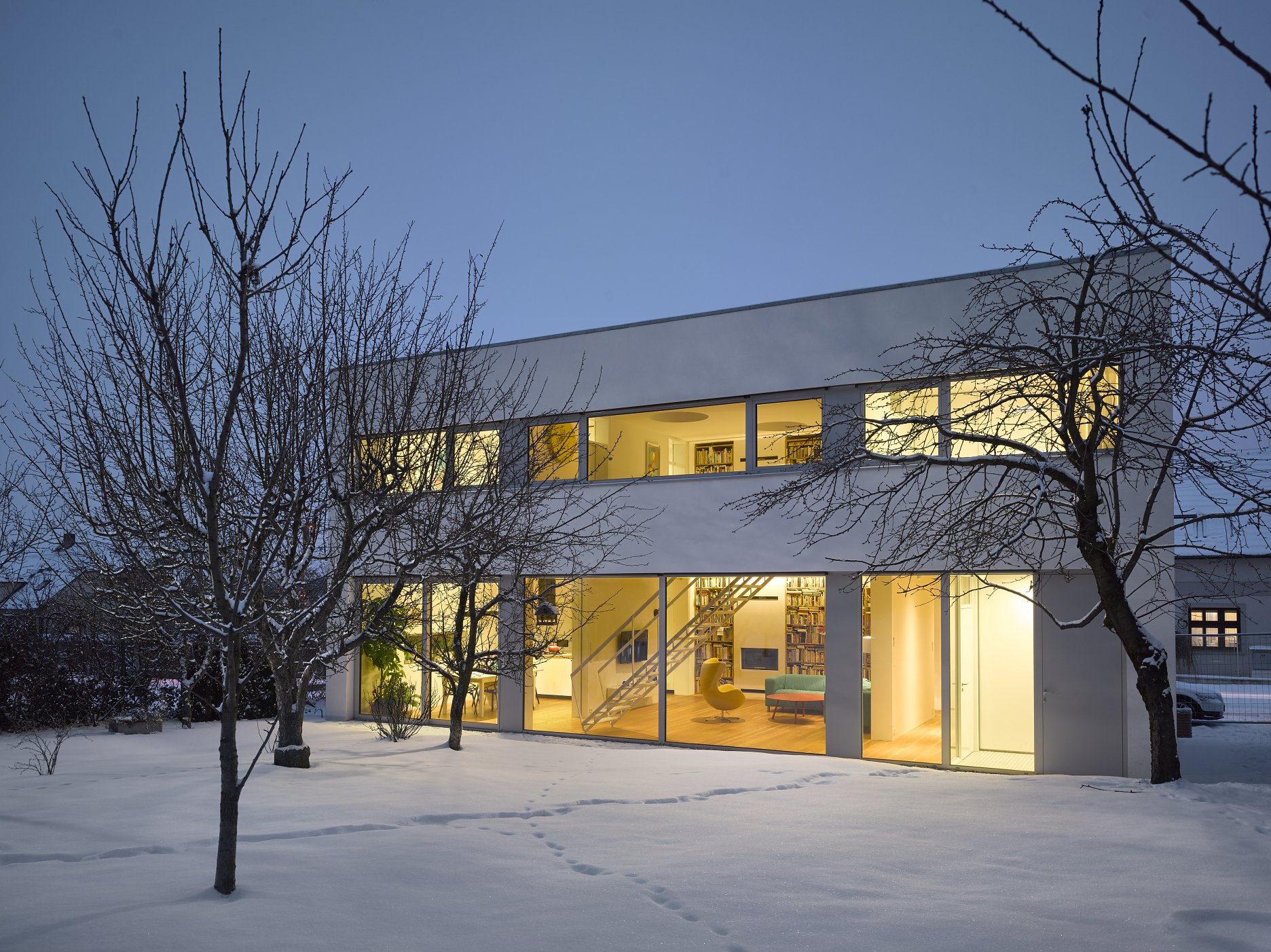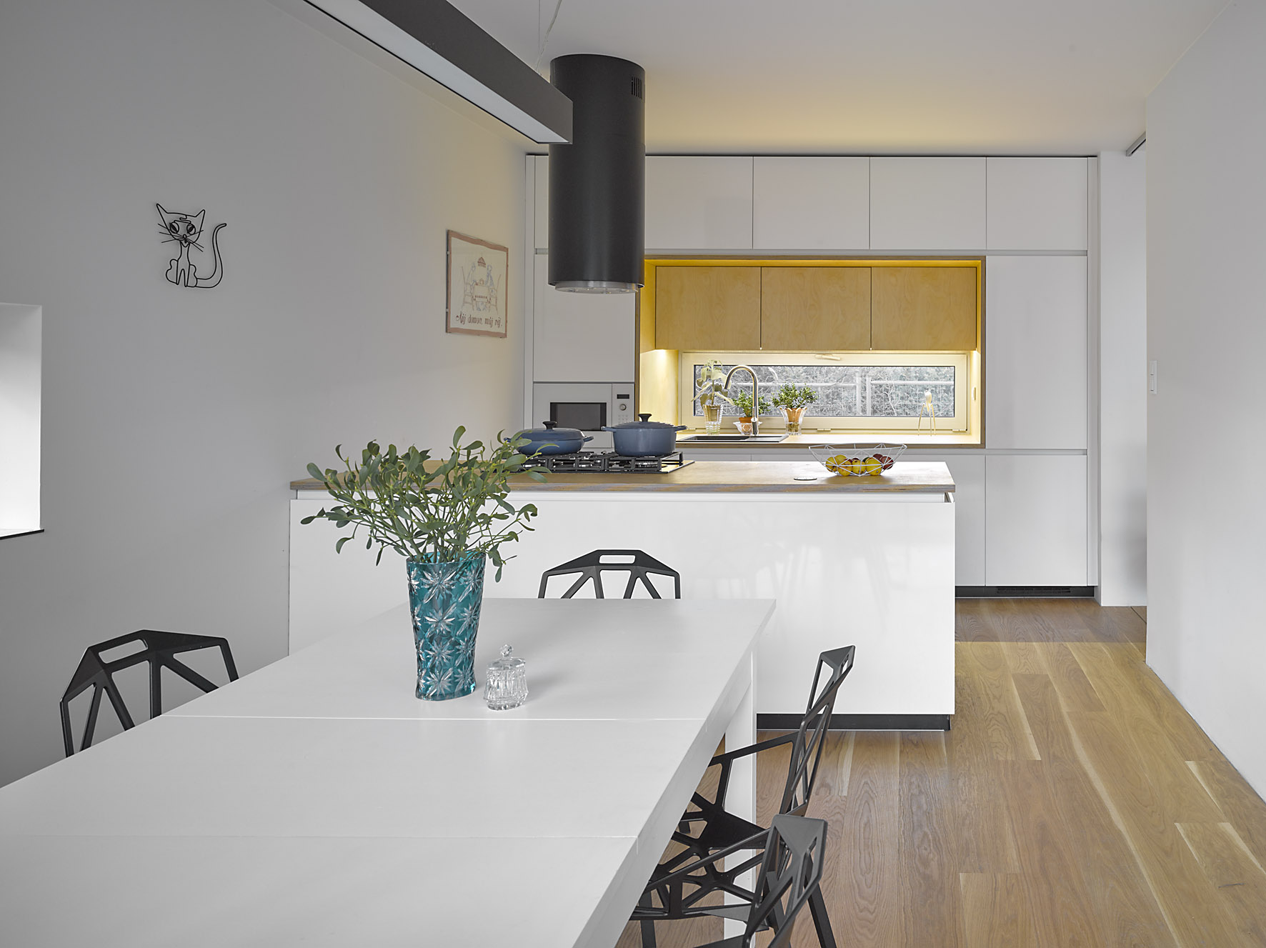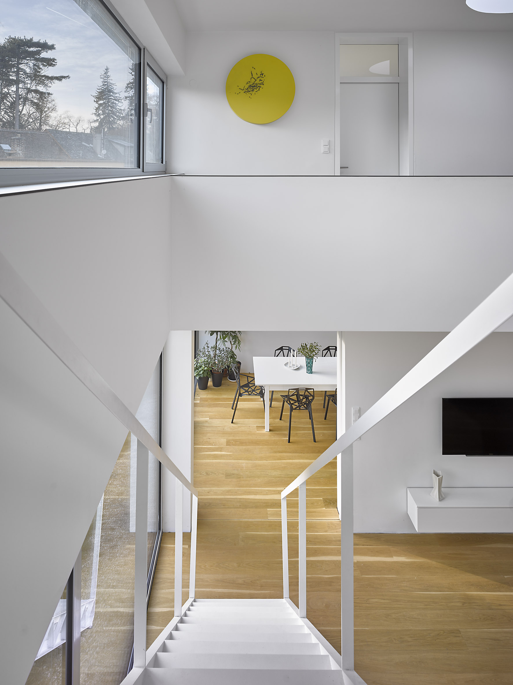 Hmotu rodinného domu tvorí exaktný biely dvojpodlažný kváder. "Projekt se vydal koncepcí hry s analogií bílého listu papíru, který si bude rodina postupně sama vybarvovat svou prací a sbírkou umění svých přátel výtvarníků", objasňujú autori.