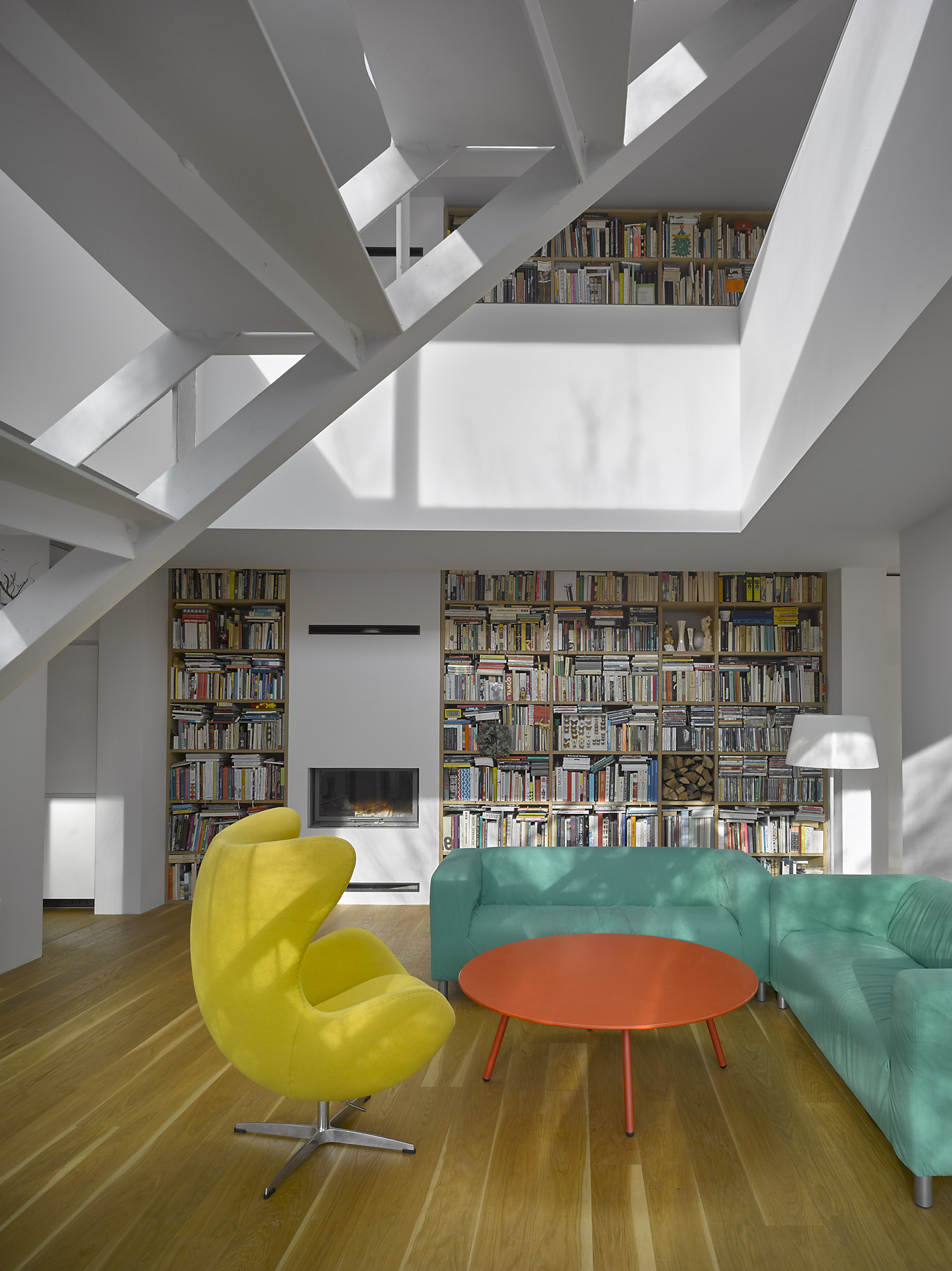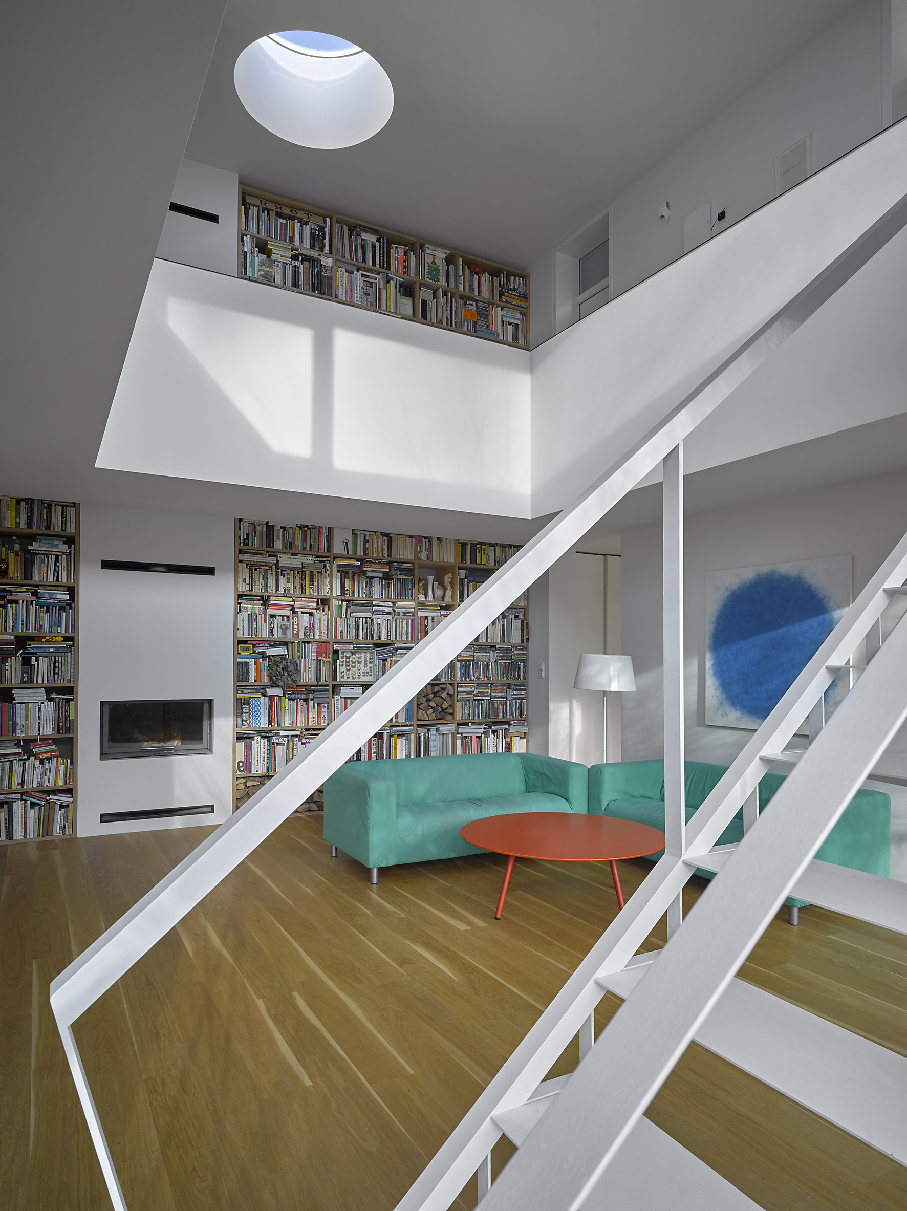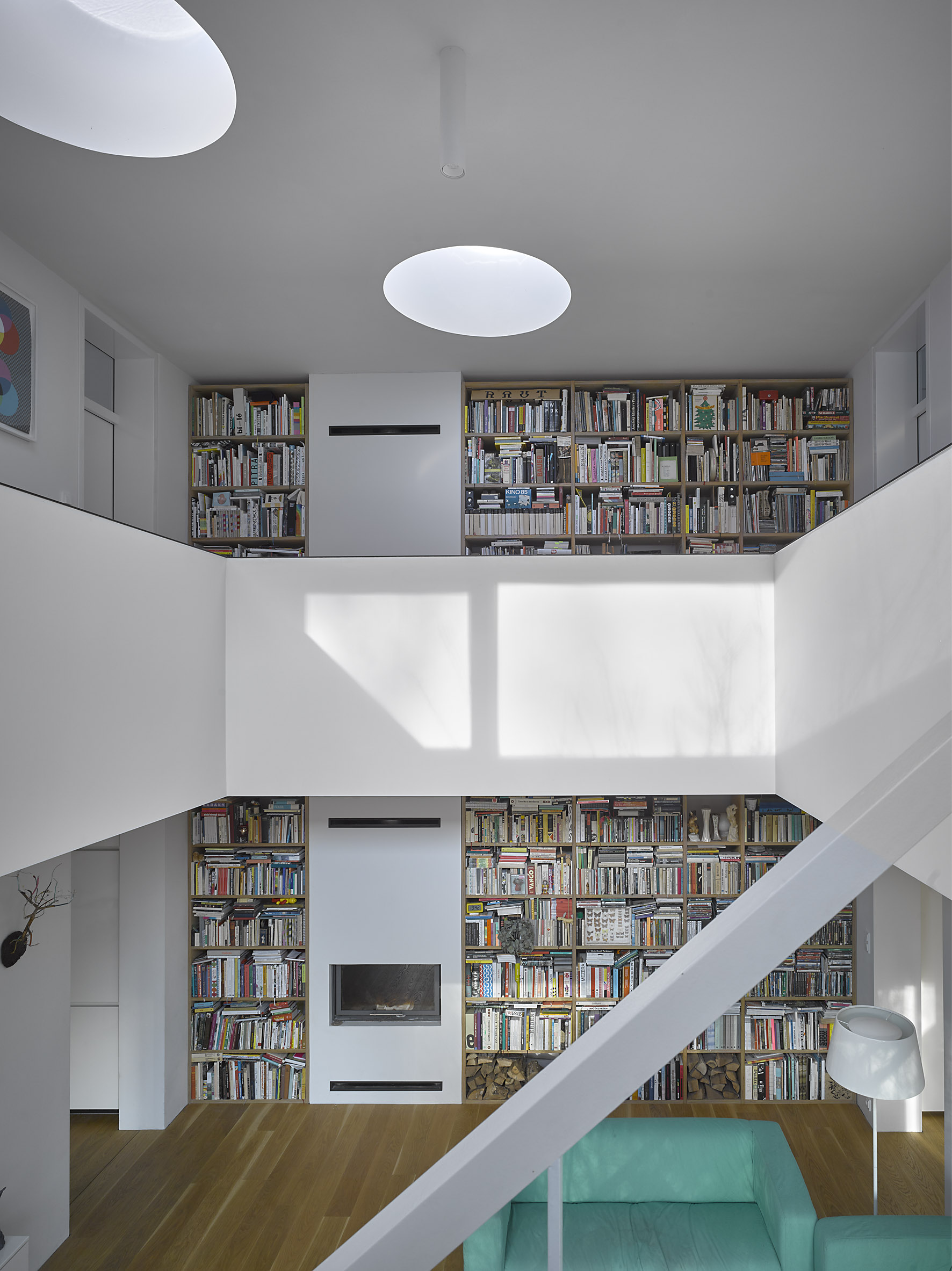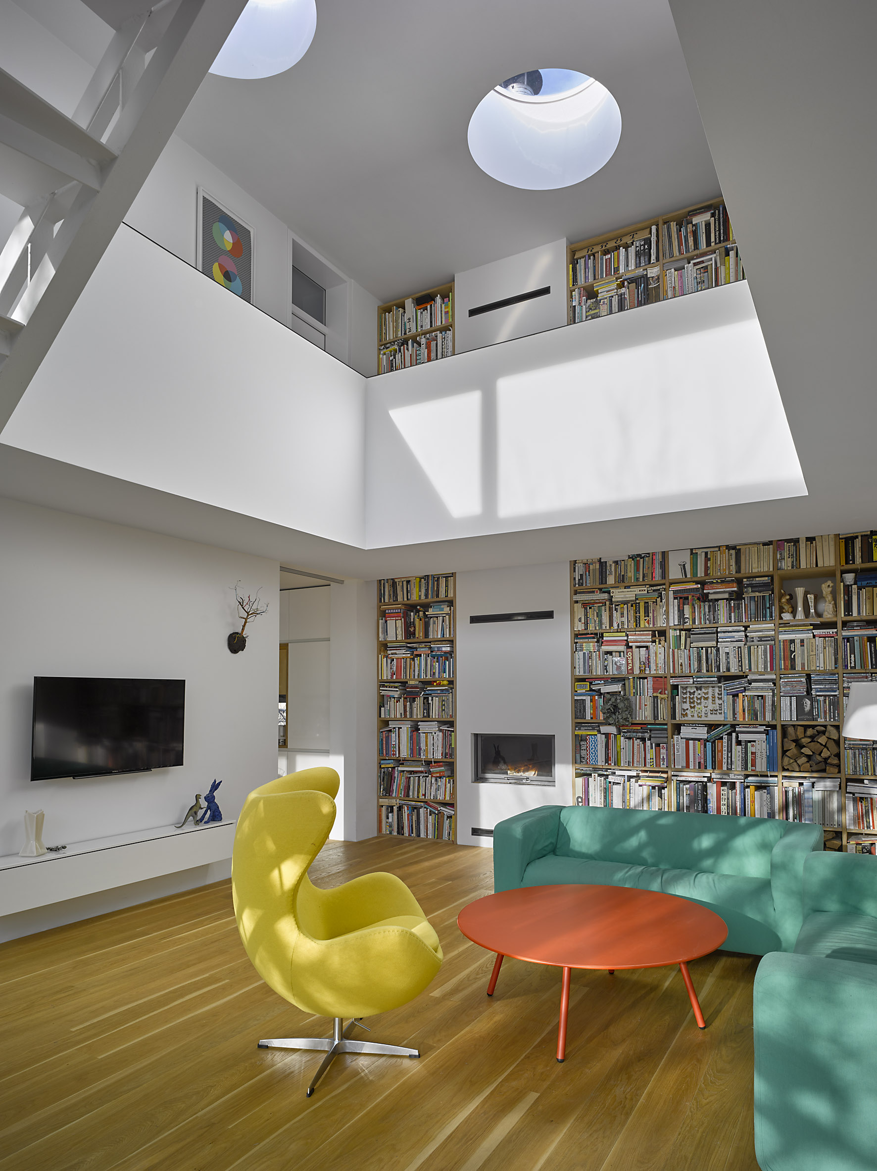 Dominantu hlavného obytného priestoru prebiehajúceho cez dve podlažia domu tvorí knižnica so vstavaným krbom a tri kruhové svetlíky na strope. Knižnica slúži zároveň aj ako skladový priestor pre palivové drevo, alebo vitrína pre umelecké diela vyrobené domácou paňou. Svetlíky privádzajú do domu viac denného svetla, zároveň umožňujú rodine nočné priehľady na hviezdnu oblohu z pohoviek pod nimi. Ich počet tvorií analógiu s členmi rodiny žijúcimi v dome.