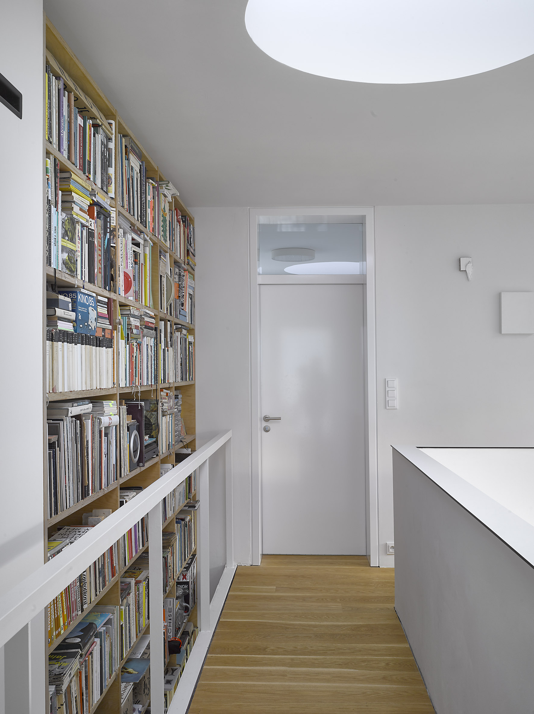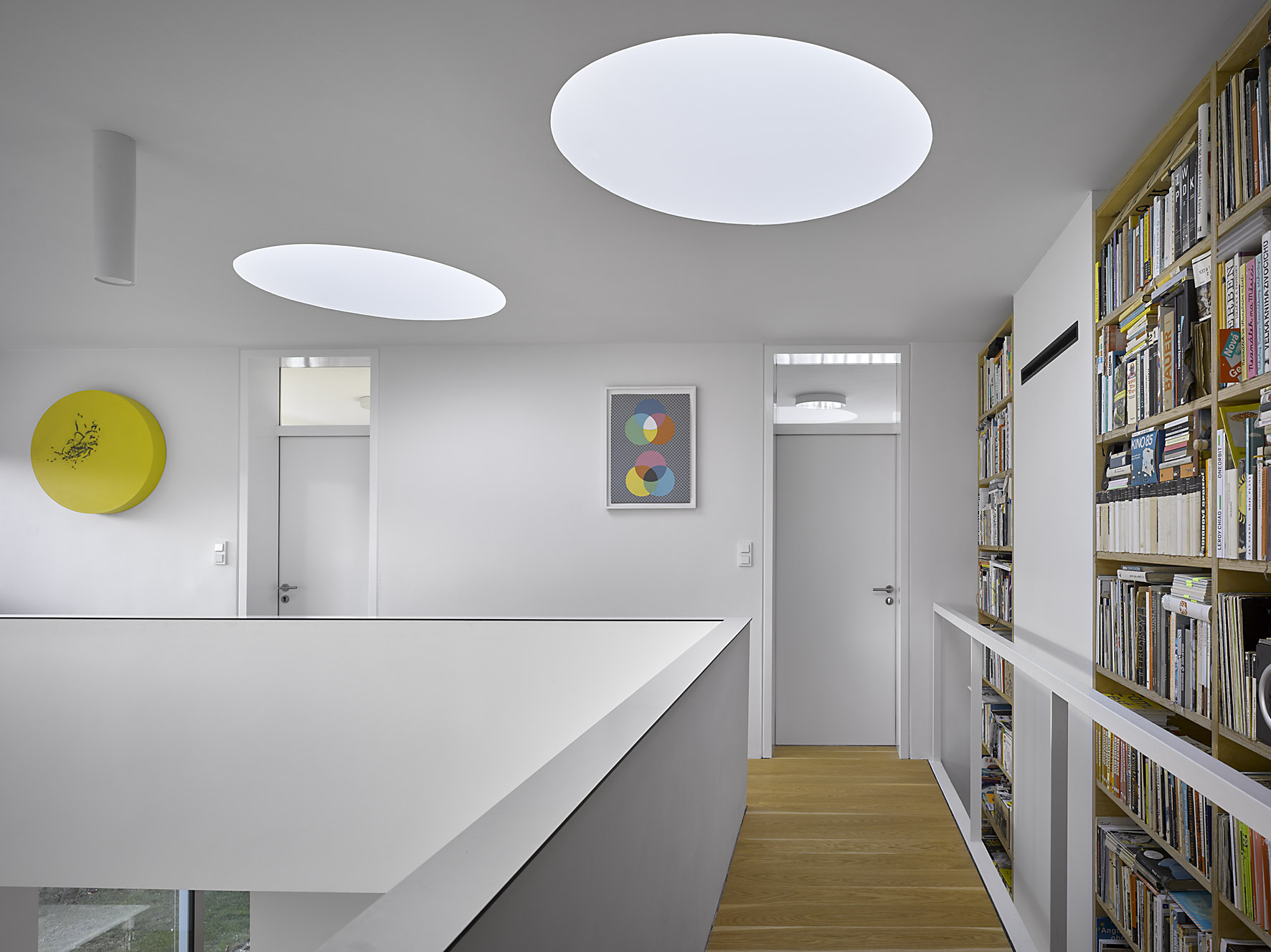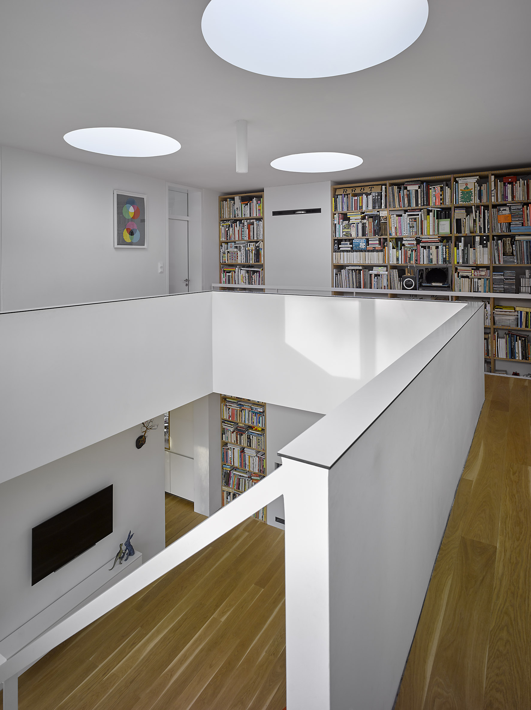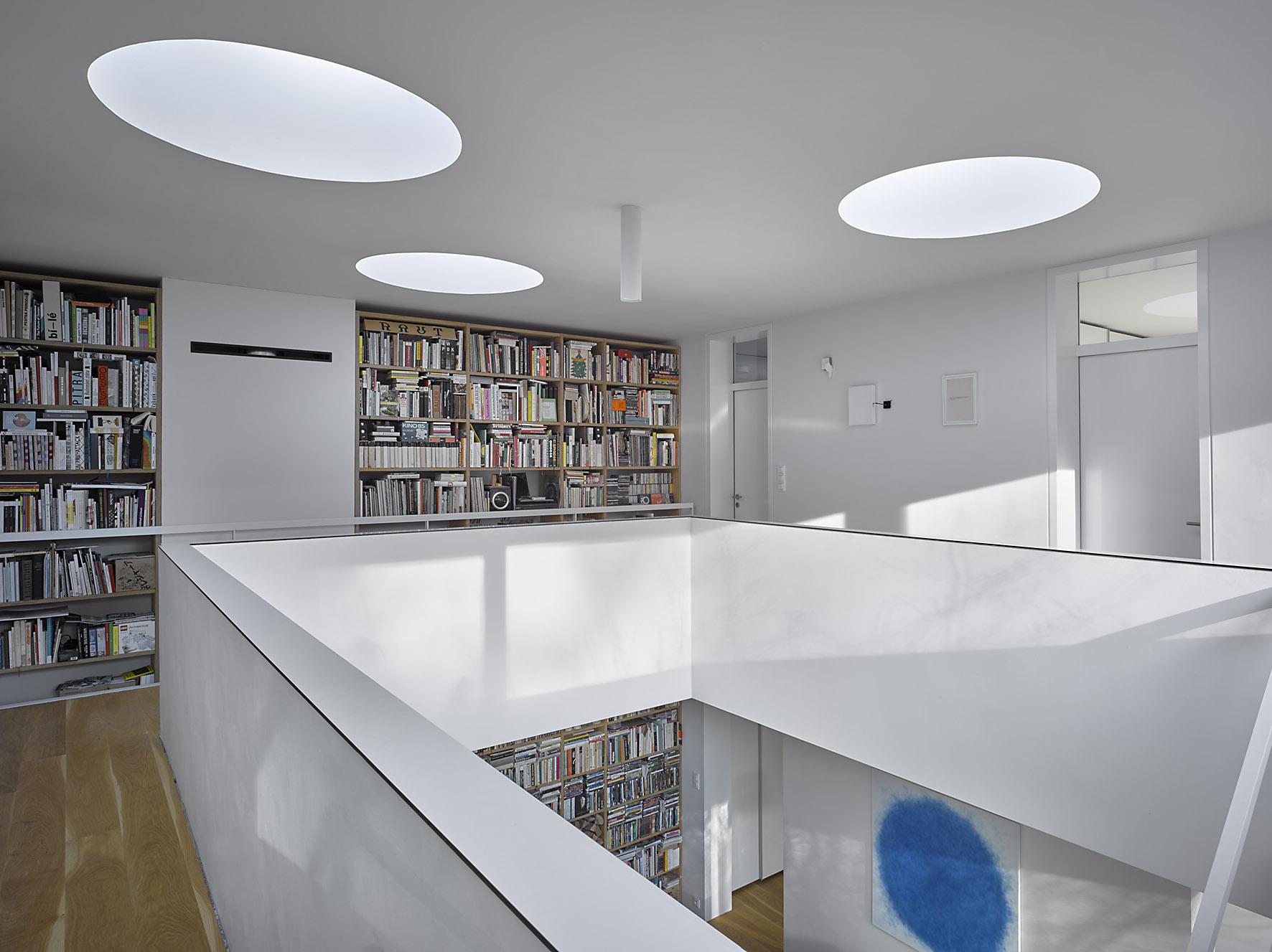 Dominantu hlavného obytného priestoru prebiehajúceho cez dve podlažia domu tvorí knižnica so vstavaným krbom a tri kruhové svetlíky na strope. Knižnica slúži zároveň aj ako skladový priestor pre palivové drevo, alebo vitrína pre umelecké diela vyrobené domácou paňou. Svetlíky privádzajú do domu viac denného svetla, zároveň umožňujú rodine nočné priehľady na hviezdnu oblohu z pohoviek pod nimi. Ich počet tvorií analógiu s členmi rodiny žijúcimi v dome.