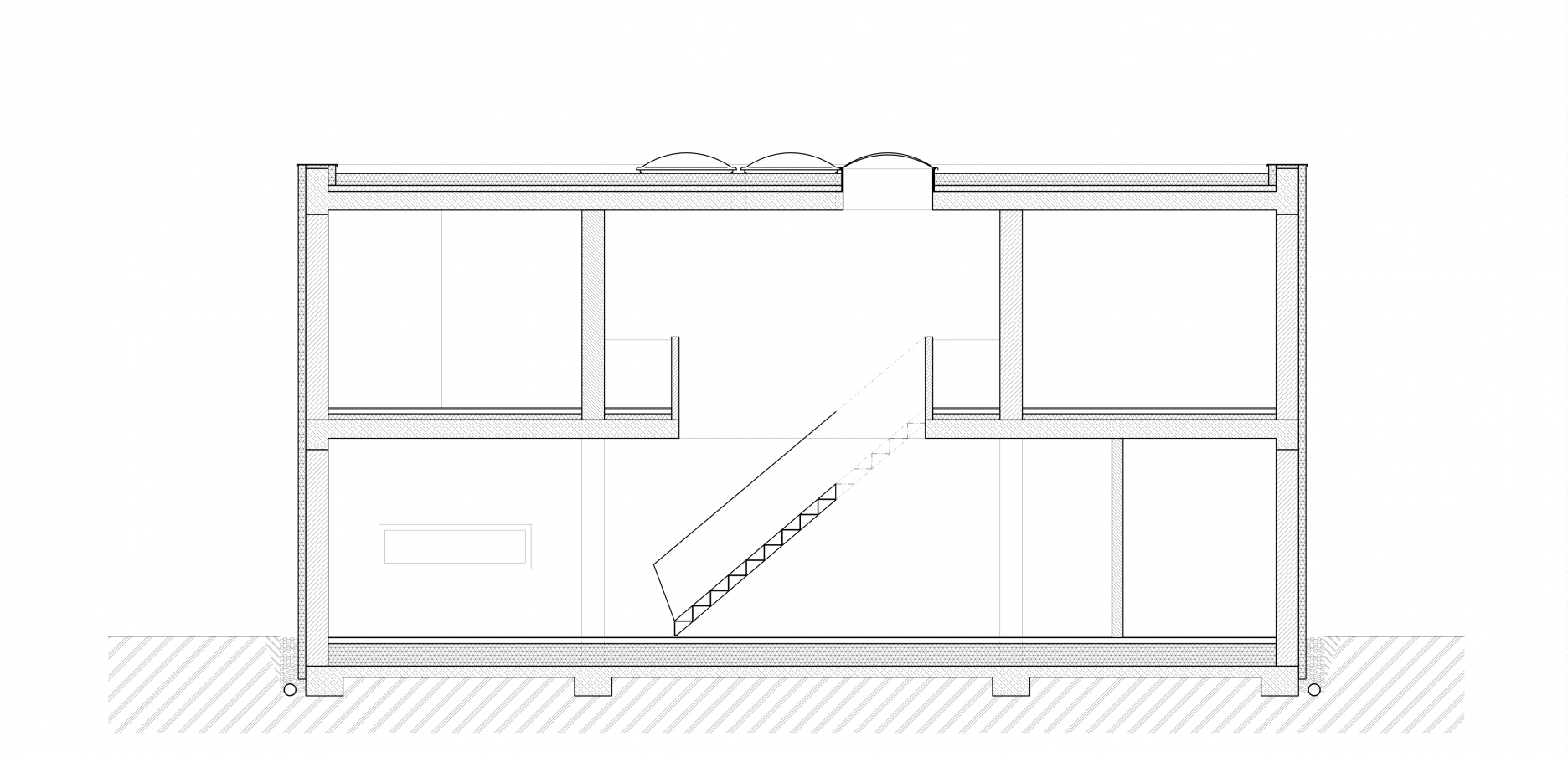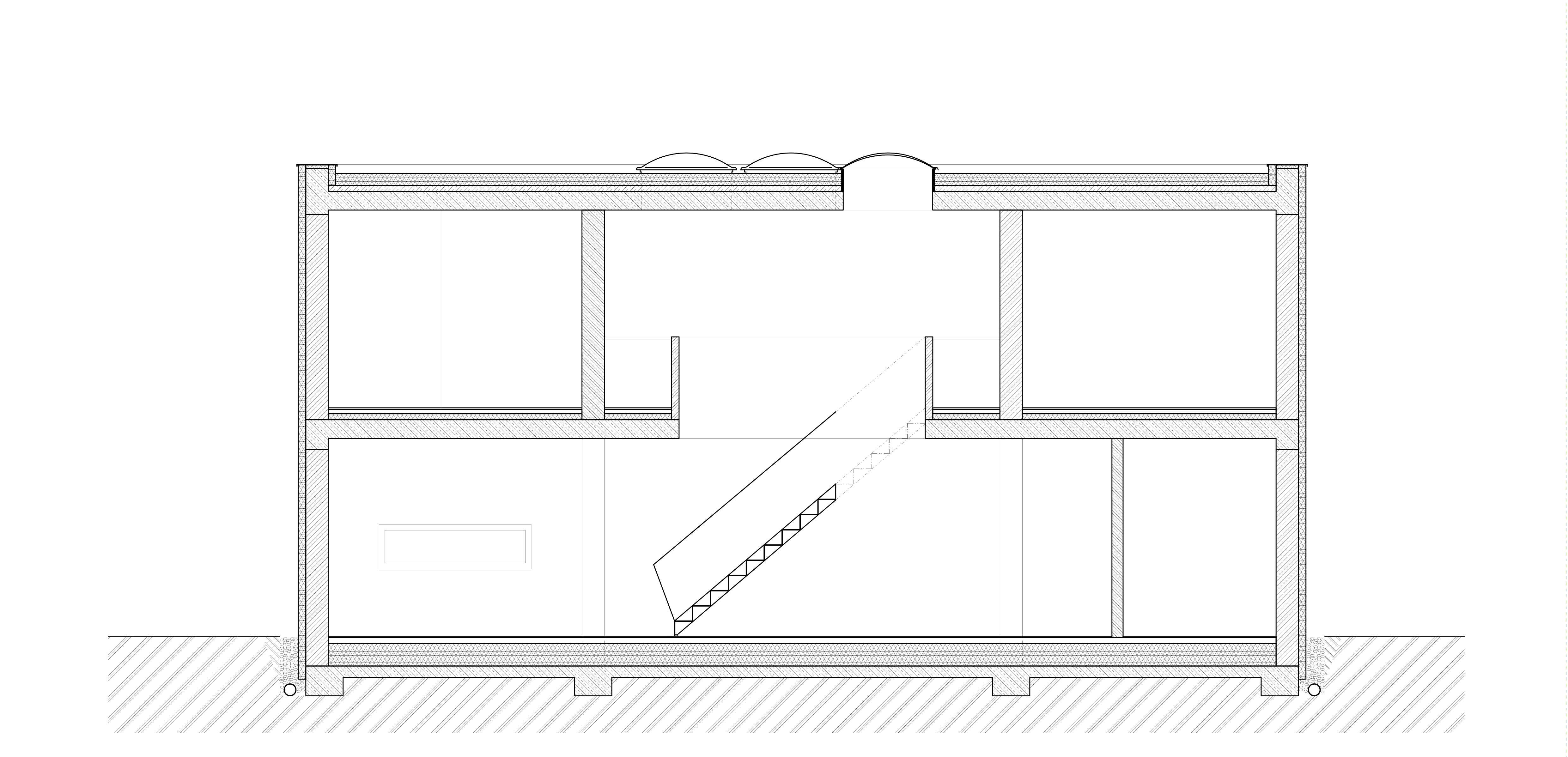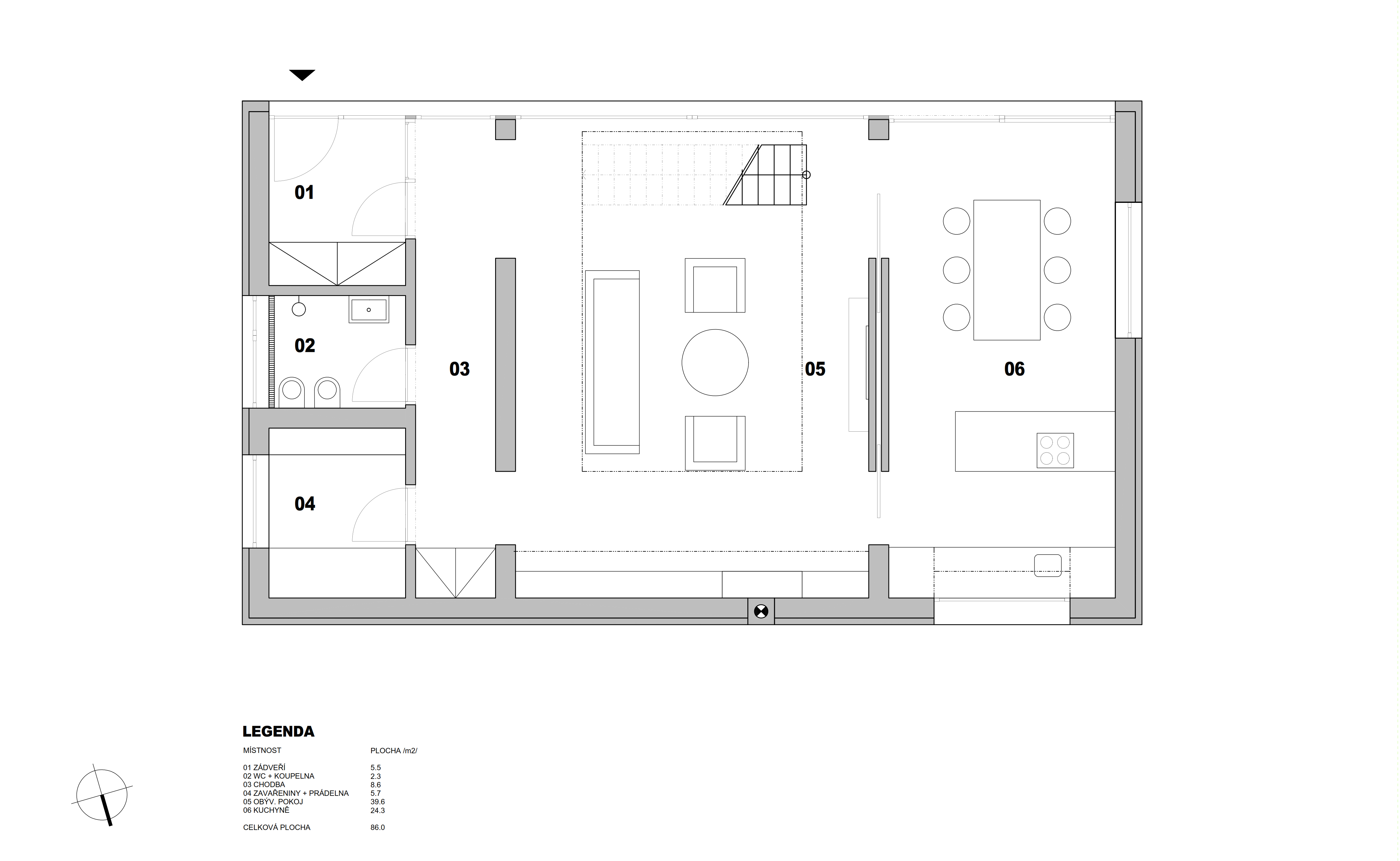 Na prízemí sa nachádza kuchyňa s jedálňou nadväzujúcou na hlavný obytný priestor, ktorý je možné posuvnými dverami opticky oddeliť. Ďalej je tu práčovňa, sklad a malá kúpeľňa s WC. Celé podlažie je v optickom kontakte so záhradou a ovocnými stromami.