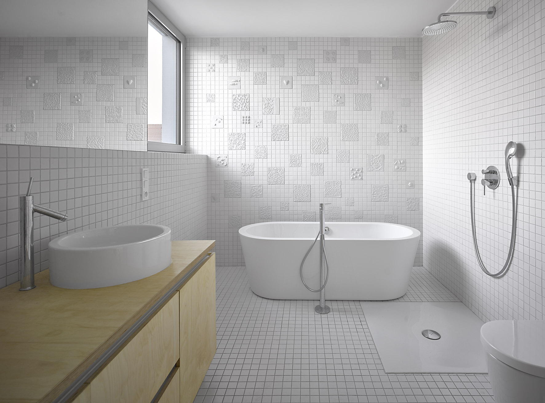 Na poschodí sú dve spálne, pracovňa a druhá väčšia kúpeľňa s originálnymi reliéfnymi obkladmi navrhnutými a vyrobenými majiteľkou. Kúpeľňa využíva integrovaný zhod bielizne do práčovne v prvom podlaží.