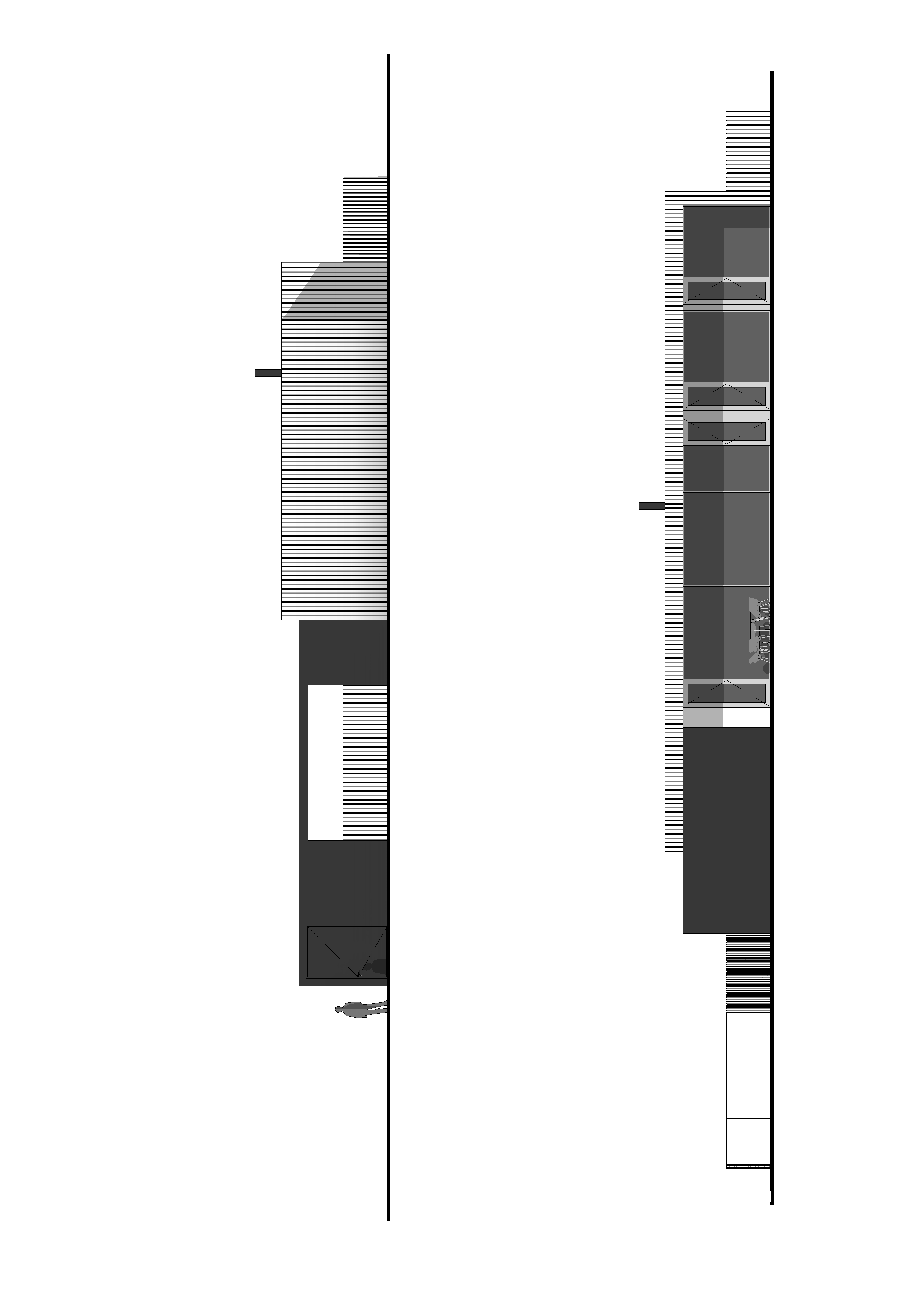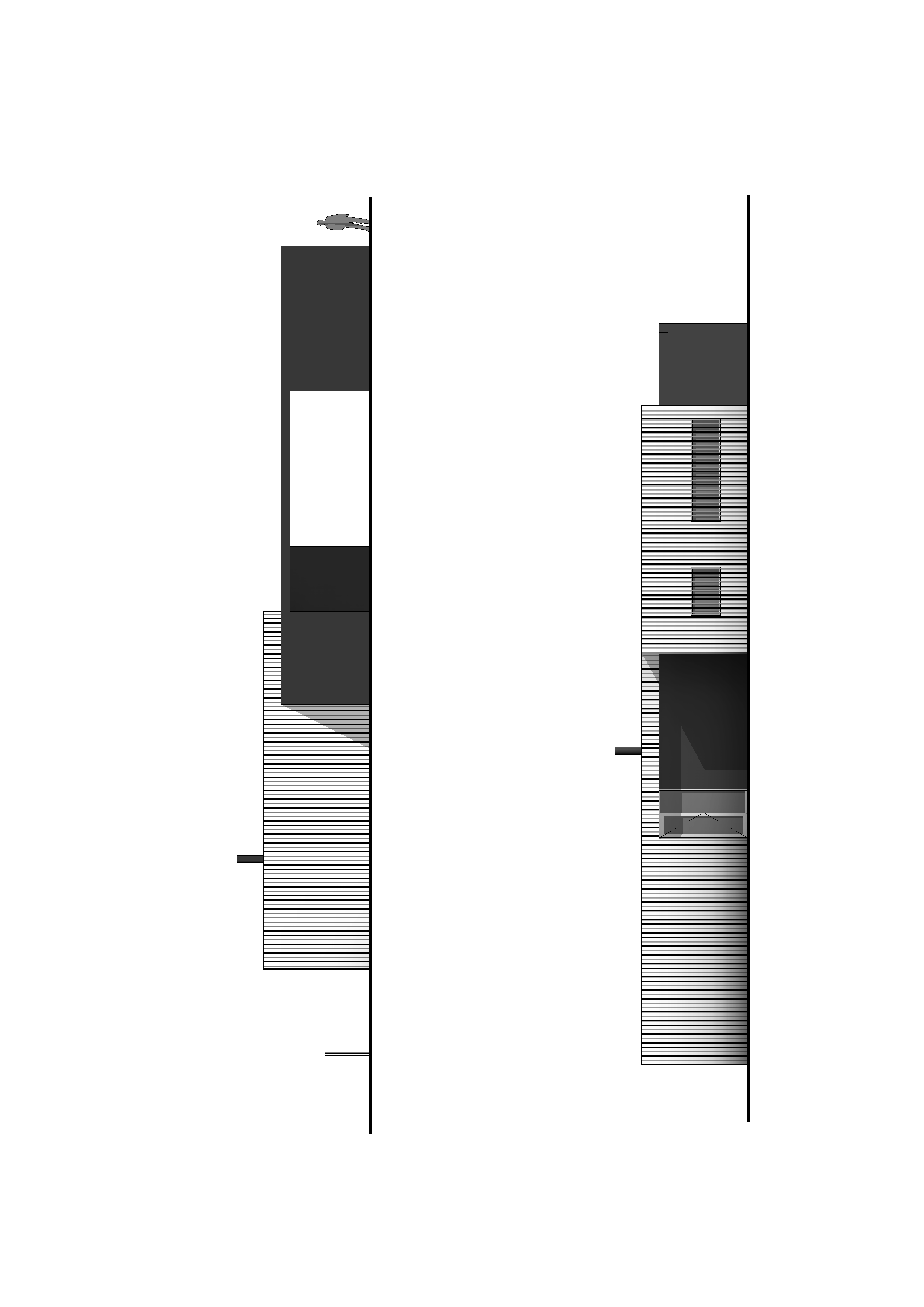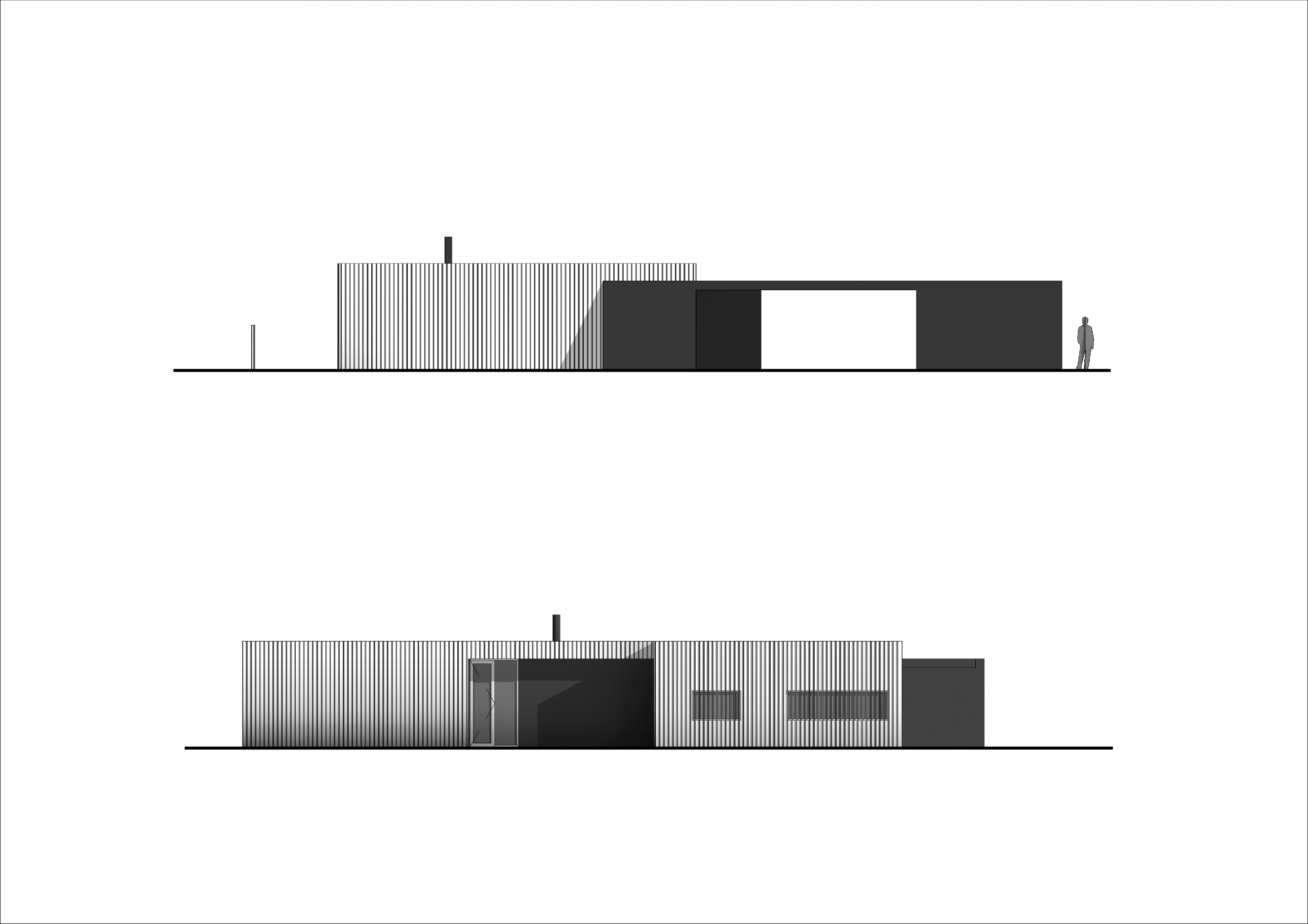Kompozícia dvojice výškovo a materiálovo odlíšených hmôt reflektuje prevádzkové členenie domu. Mohutnejší blok s drevenou odvetranou fasádou obsiahol obytnú časť domu. Pridružené funkcie ako parkovacie miesta pre autá, dielňu a sklad situovali architekti do kompaktného celku s tmavým fasádnym obkladom.