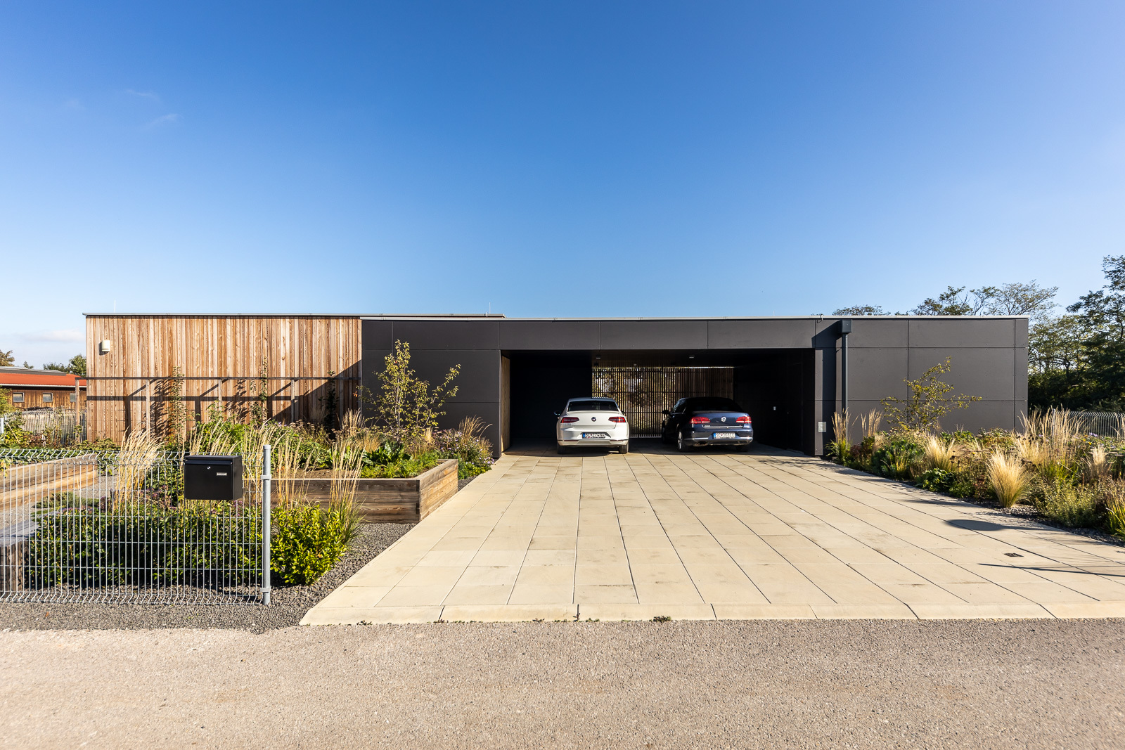 Hlavný vstup a príjazdová cesta sú prístupné zo strany ulice. Sekundárny vstup, ktorí slúži ako príležitostný privátny vchod pre majiteľov domu, vedie z bočnej strany pozemku. Spevnená plocha príjazdu plynule prechádza pod kryté státie pre dve autá.