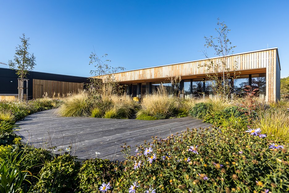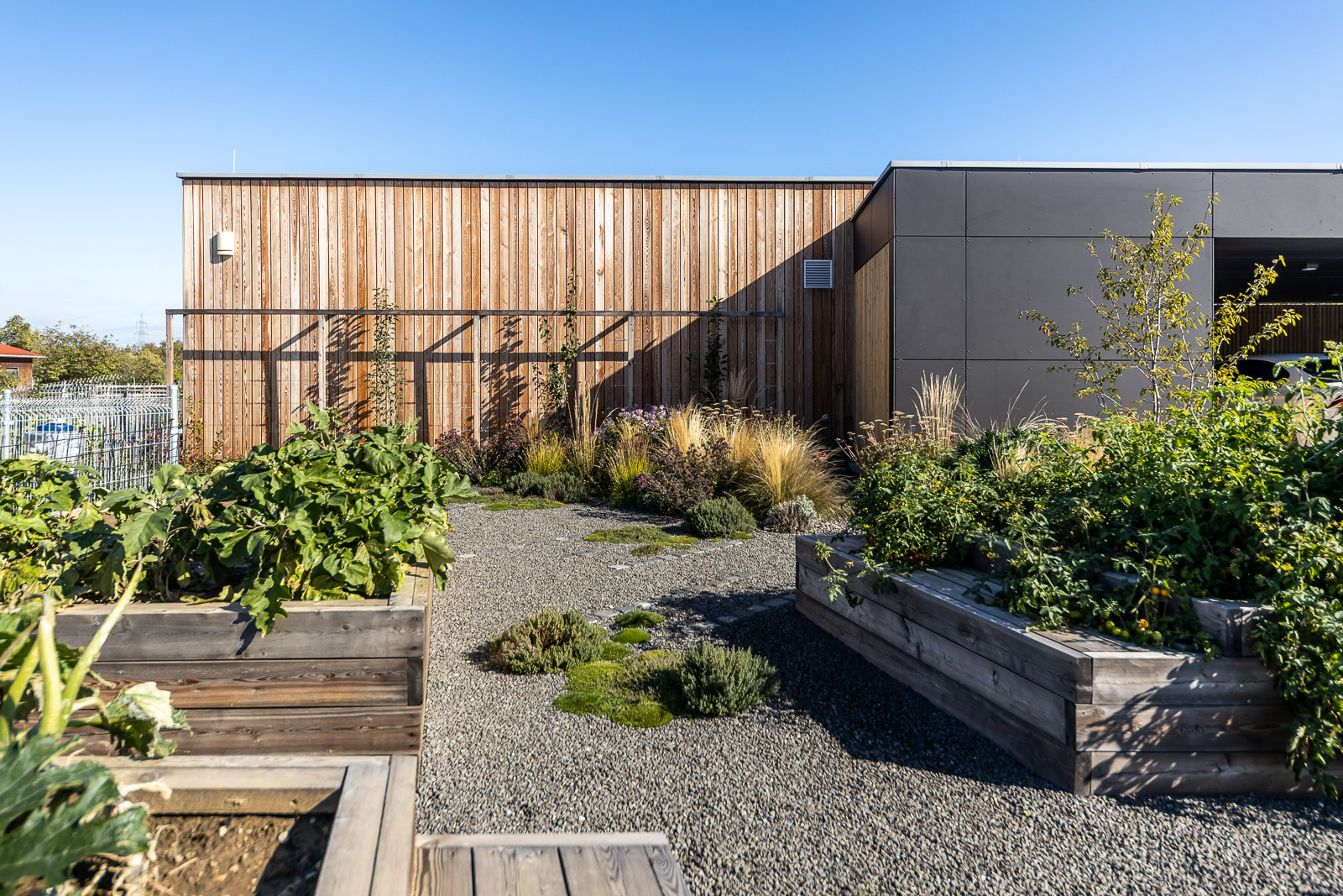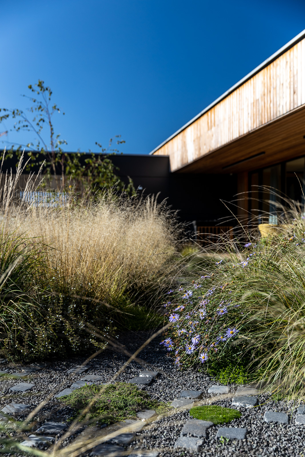 Interiér je v plnej miere prepojený s rozmanitou záhradou záhradou s trvalkami a okrasnými trávami. Jej súčasťou sú tiež vyvýšené úžitkové záhony a ovocné kry, netradične situované smerom do ulice, aby podporovali rozvíjanie susedských vzťahov.