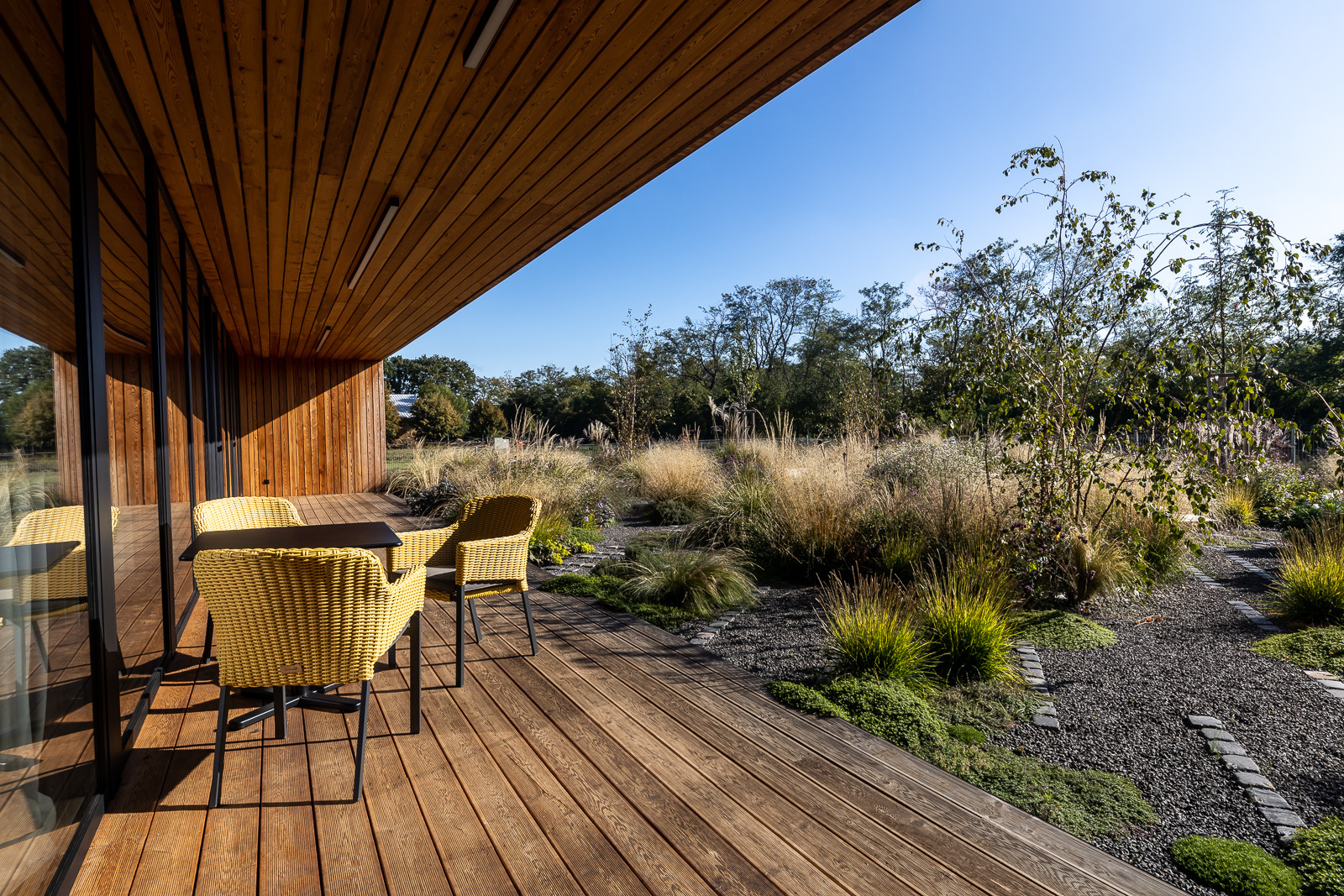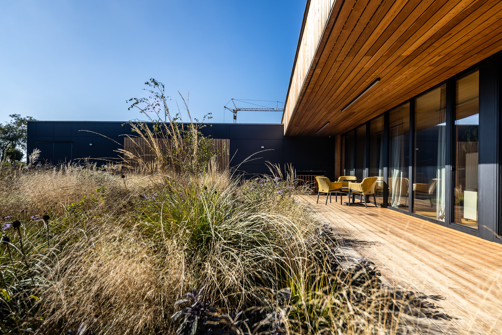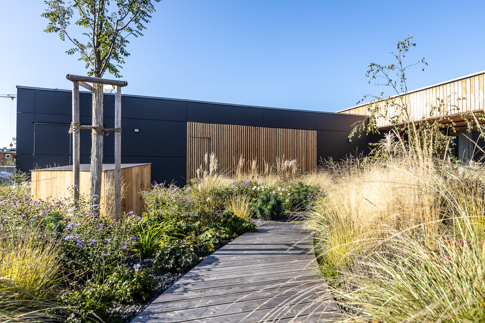 Interiér je v plnej miere prepojený s rozmanitou záhradou záhradou s trvalkami a okrasnými trávami. Jej súčasťou sú tiež vyvýšené úžitkové záhony a ovocné kry, netradične situované smerom do ulice, aby podporovali rozvíjanie susedských vzťahov.