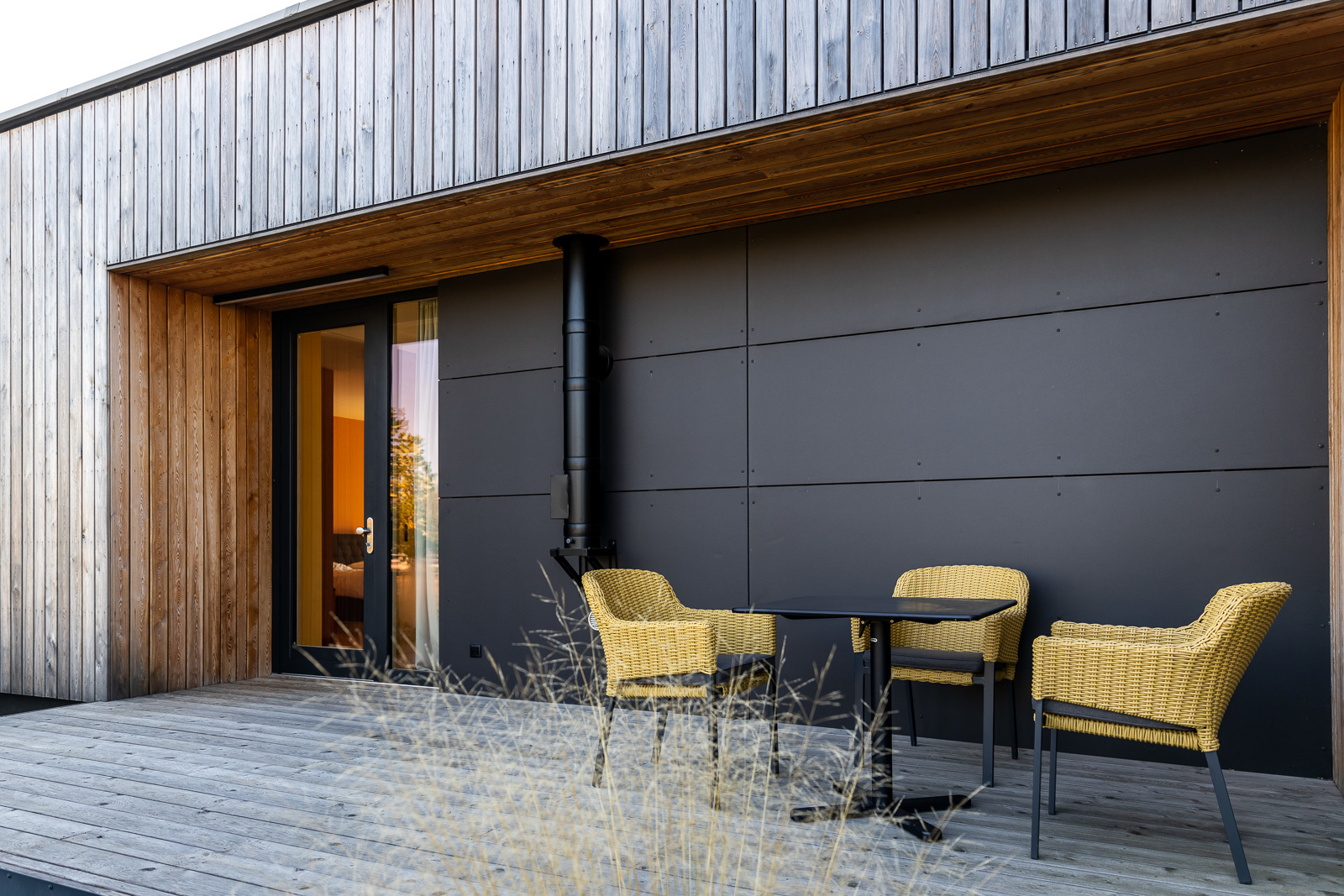 Odvetraná fasáda: Drevovláknitá tepelná izolácia STEICO P+D, hr. 60 mm, (súčiniteľ tepelnej vodivosti λD 0,042 W.m-1.K-1, Kombinácia zvislej fasády z hobľovaných dosáka zo sibírskeho smrekovca s cementovláknitými doskami Ethernit Natura