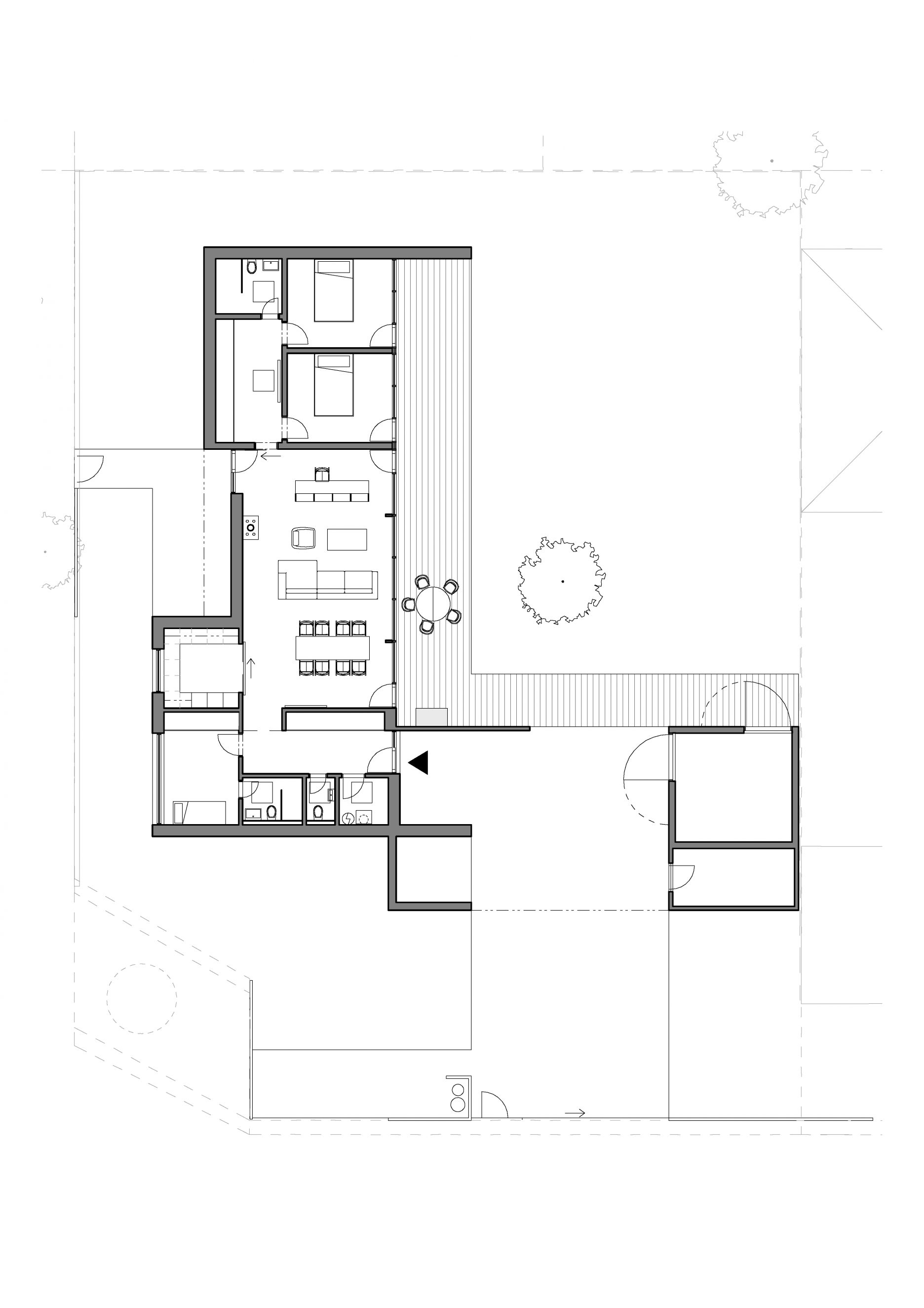Dom stojí na pozemku, ktorý je súčasťou nového obytného súboru v drobnej rakúskej obci Friedrichshof. Rožný pozemok susedí s novými parcelami. V blízkosti sa nachádza areál kaštieľa, s priľahlým parkom a hospodárskymi budovami. Urbanistické a architektonické riešenie objektu vychádza z požiadaviek stanovených regulatívmi. Prízemný dom s plochou strechou pri pohľade s ulice výškovo nadväzuje na okolitú zástavbu.