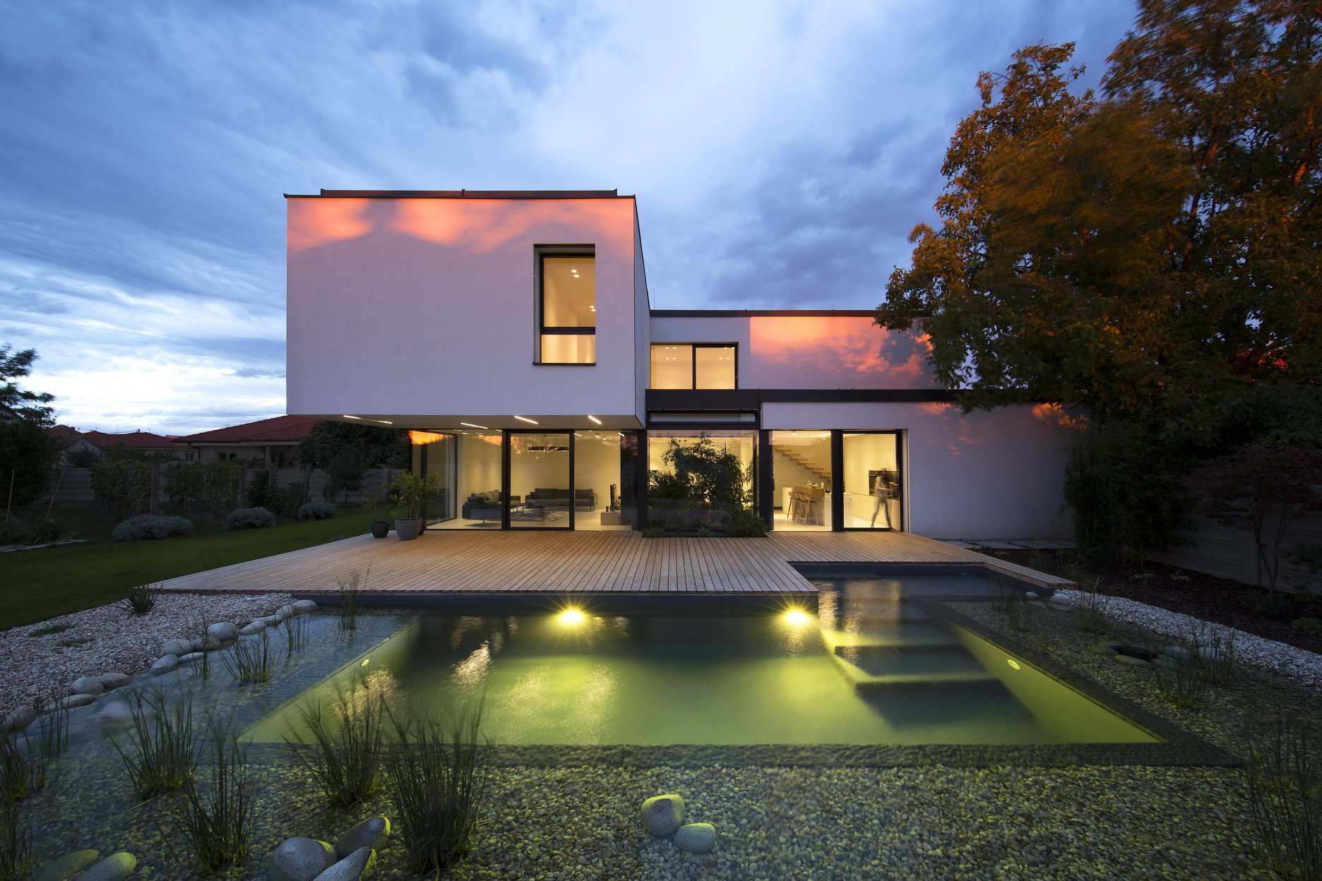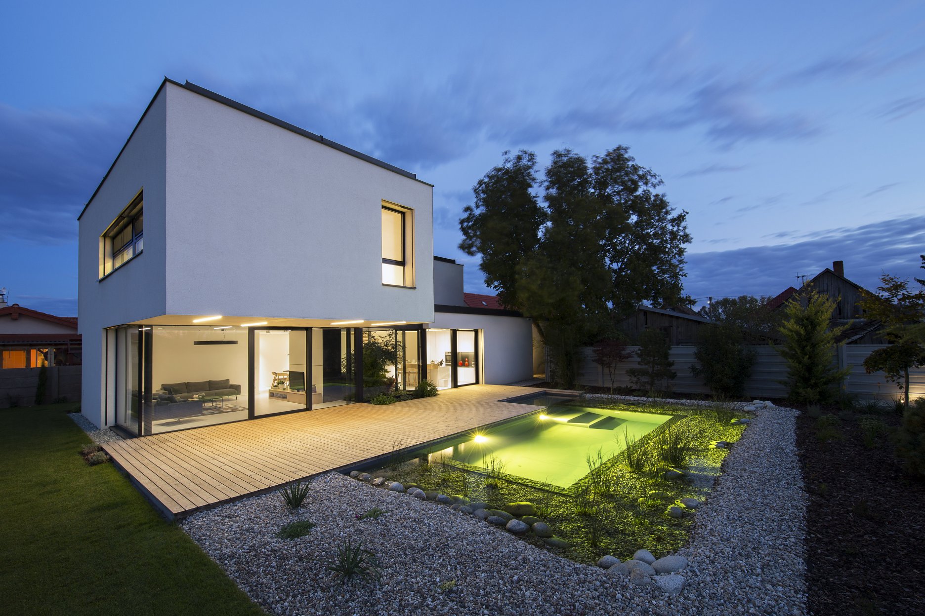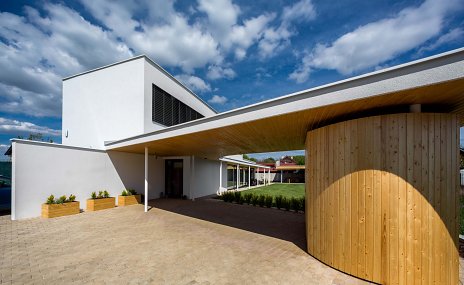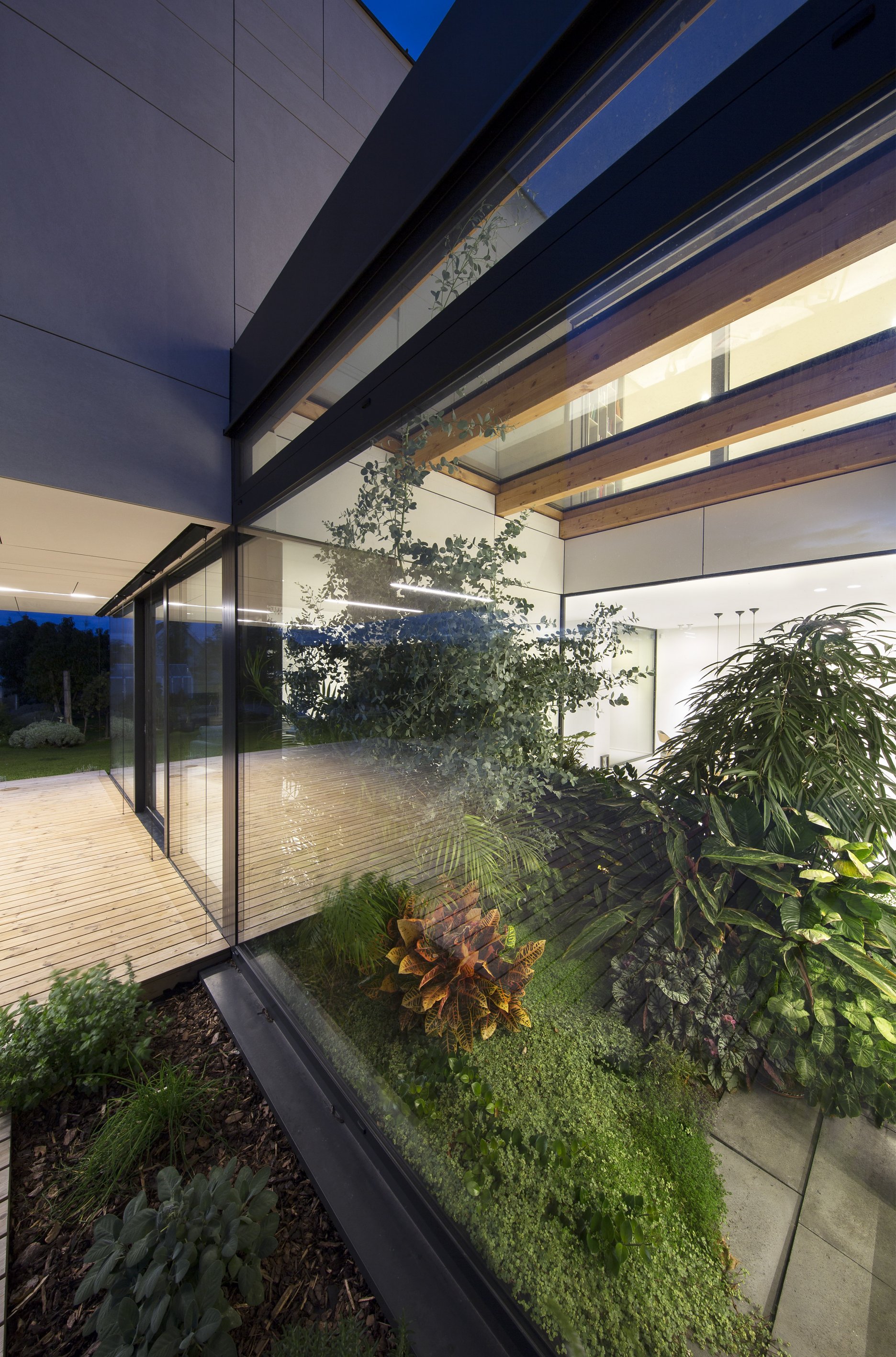 Výborné je aj prepojenie interiéru a exteriéru, ktoré má rôzne formy (priame, nepriame, zimná záhrada, krytá terasa chránená časťou konzolovito vysunutého poschodia, voľná terasa ako pokračovanie obytných častí, kontakt s vodnou plochou, plávacím jazierkom a záhradou…). Veľmi príjemný priestor na bývanie. V profánnej dedinskej zástavbe vznikol nový mikrosvet. Bez kolízií s okolím, naopak vhodne ho dopĺňajúci. Ukazujúci, kde by sa kvalita bývania na dedine dala posunúť želaným smerom.