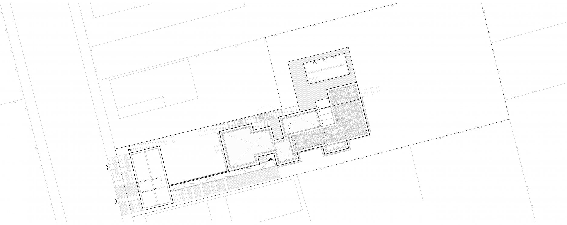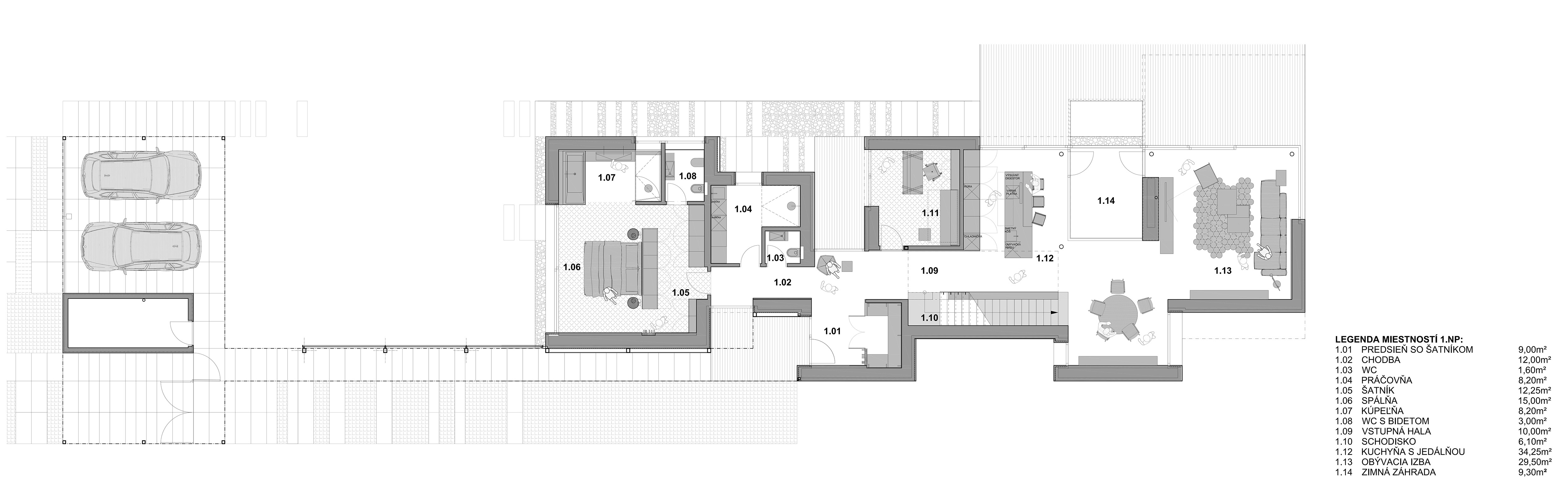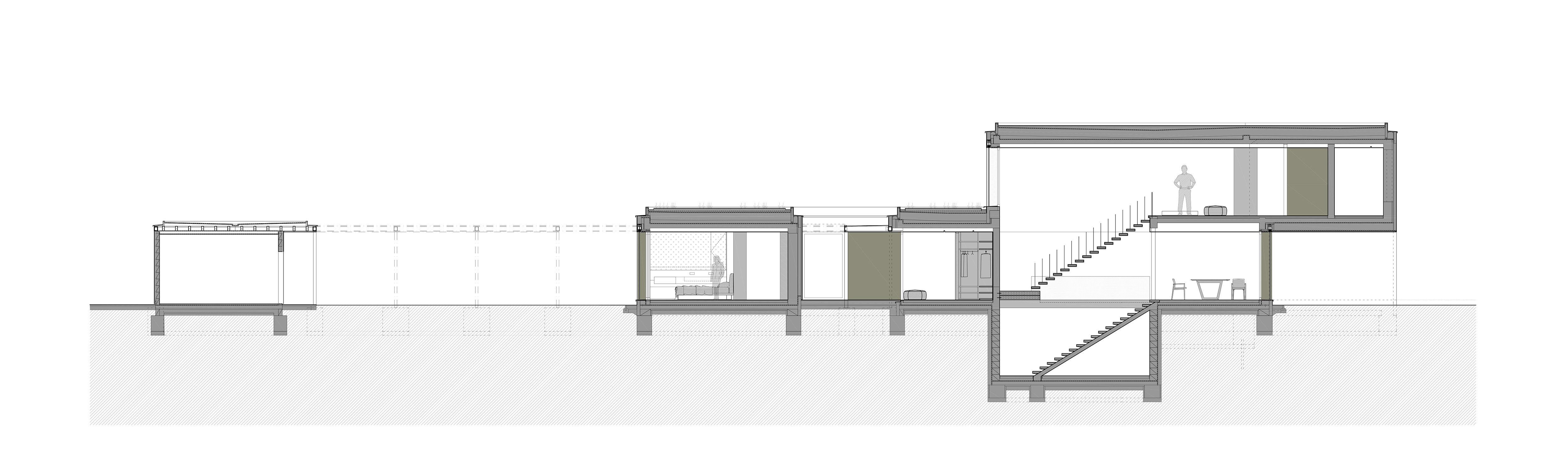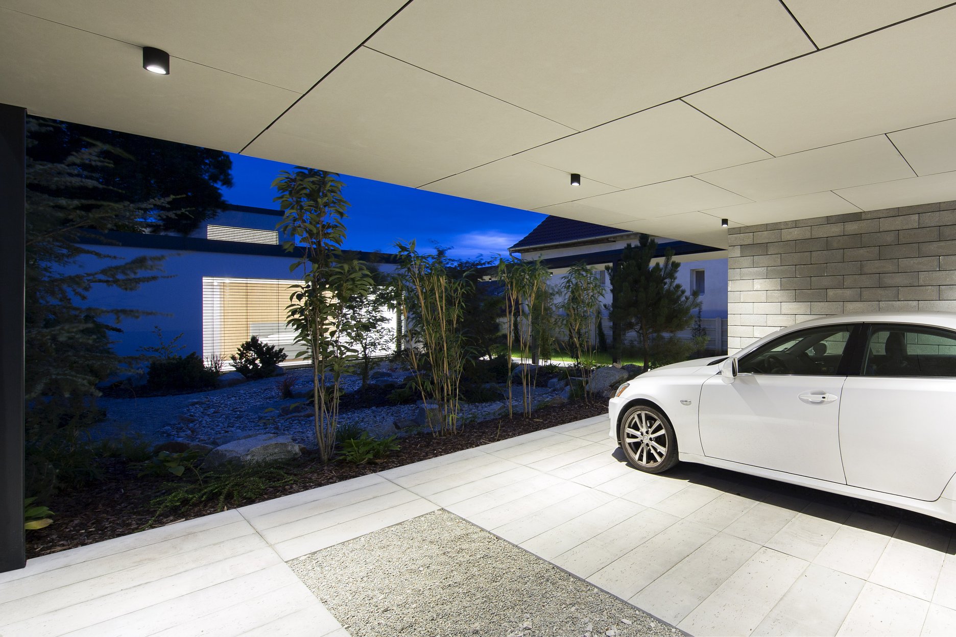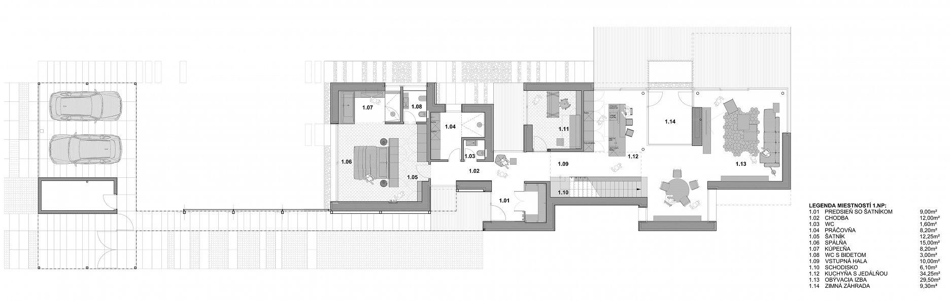 Prirodzené odčlenenie prístrešku pre autá s integrovaným skladom a miestom pre domový odpad odbremeňuje zvyšné časti pozemku od statickej dopravy. Táto subtílna časť zároveň tvorí oplotenie a uzatvára uličnú frontu. Spojenie s majoritnou časťou objektu tvorí kolonáda/pergola s popínavou zeleňou na pozinkovanom ráme. Zeleň sa vo viacerých obdobách a intervaloch objavuje aj na fasáde a v interiéri domu. Stavba je zo strany záhrady ukončená konzolovito vysunutou hmotou poschodia, ktorá chráni časť bazénovej terasy. Konzola dominantným spôsobom akcentuje stavbu v kľúčovom mieste, kde sa odohráva väčšina života rodiny. Dom svojim členením, osadením a hrou s ľudskou mierkou vytvára príjemné zákutia. Tieto priestory sú navzájom prepojené cez zaujímavé priehľady. Život rodiny sa odohráva na dvoch nadzemných a jednom podzemnom podlaží. Prízemie využité ako denná zóna rodinného domu spĺňa náročné požiadavky na dostatok komfortu a priestoru. Doplnením o rodičovský apartmán, pracovňu a práčovňu sa stáva plnohodnotným podlažím pre život manželov v budúcnosti. Vtiahnutie prírody do interiéru, nielen cez zasklenie, ale aj formou zimnej záhrady je príjemným bonusom.