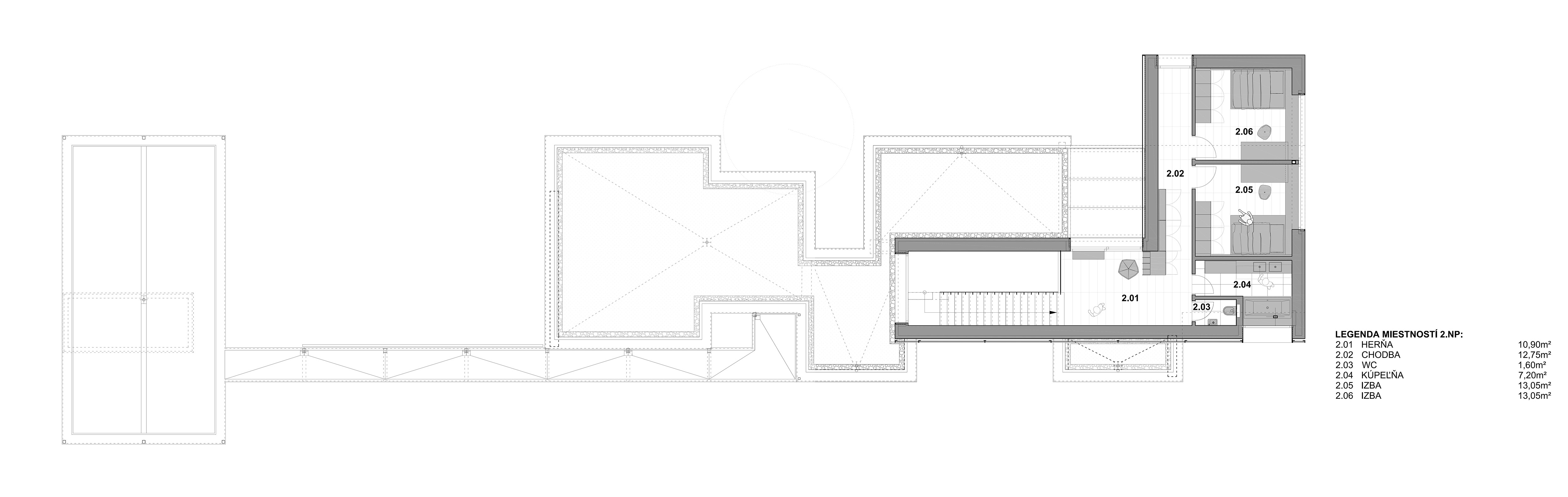 Poschodie rodinného domu je prístupné votknutým schodiskom zo vstupnej haly so svetlou výškou cez dve podlažia. Hala slúži na presvetlenie všetkých troch podlaží domu, ale aj na jeho prirodzené vetranie. Izby detí dopĺňa hygiena a praktická herňa s výhľadom do vstupnej haly a zimnej záhrady. Optické prepojenie podlaží zvýrazňuje majestátnosť už beztak atraktívneho obytného priestoru. Strecha nad prízemím je vegetačná, pre vytvorenie príjemnej klímy v každom ročnom období.