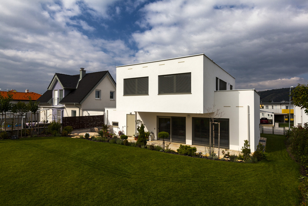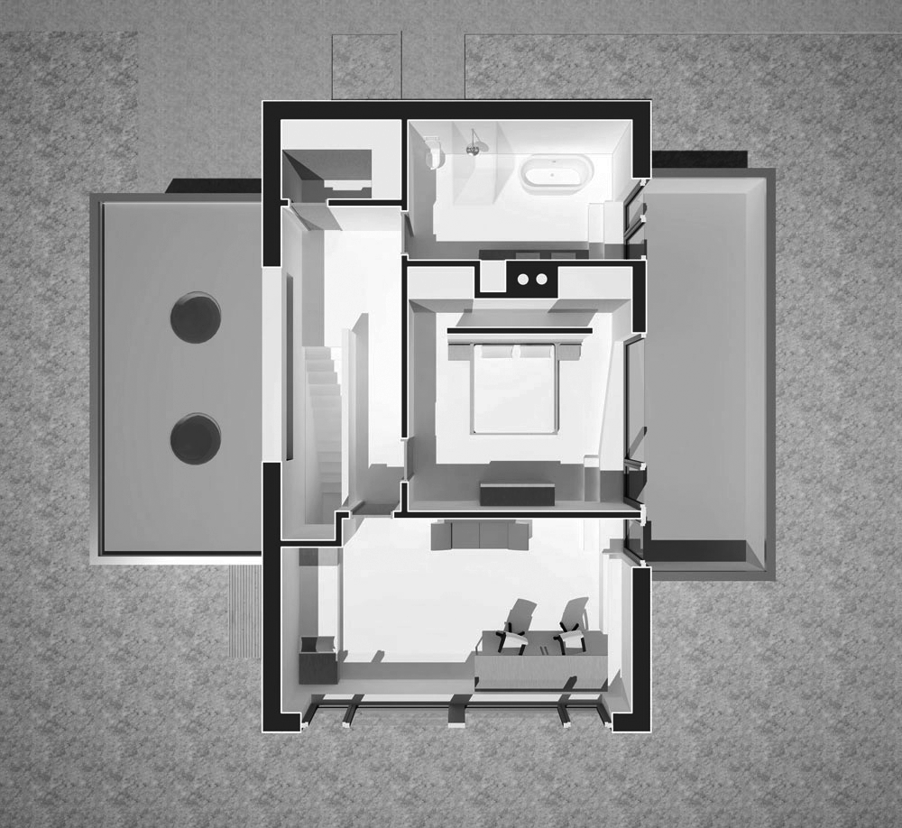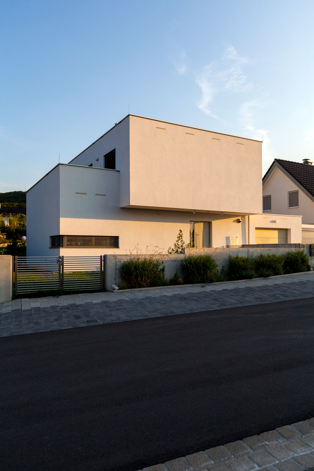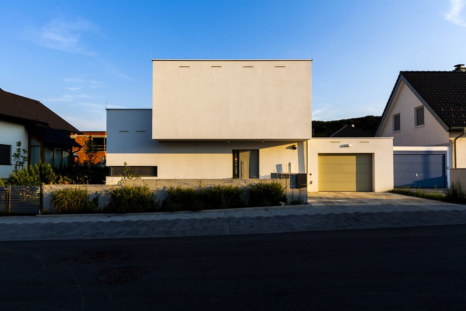 Vzhľadom na určitú mieru živelnosti rozvoja daného územia, bolo najnáročnejšou úlohou architekta dosiahnuť želanú mieru intimity budúcich obyvateľov domu. Cieľ bol naplnený krížovou kompozíciou 2 hlavných hmôt, dennej časti na prízemí a spální na poschodí. Táto priestorová figúra garantuje intimitu na juh orientovaných priestorov (spolu s prekrytím/tienením odvážnou konzolou) na prízemí. Na východ orientované spálne na poschodí sú obslúžené vonkajšou terasou s plnoatikovým zábradlím.