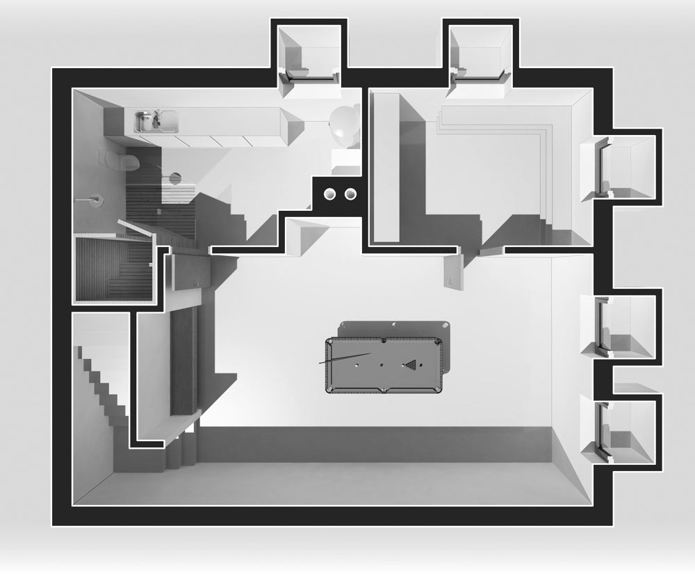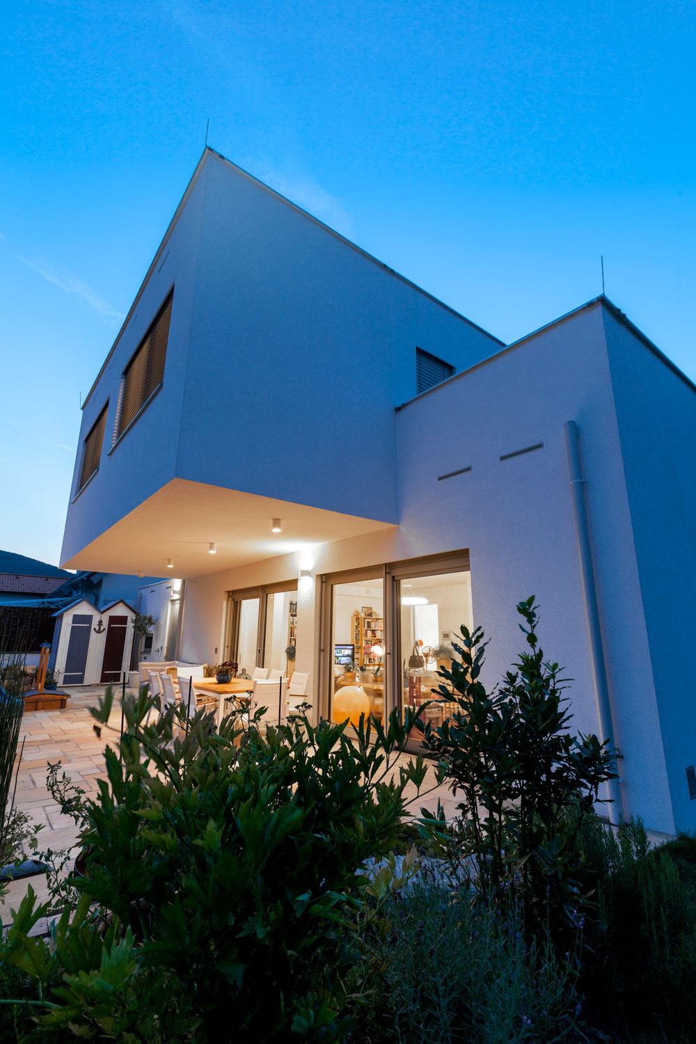 Odvážne konzolové vysunutie poschodia (3 metre) nielen demonštruje konštrukčné možnosti drevostavby, ale zároveň vytvára prirodzené prestrešenie južnej terasy. Vizuálnu ochranu spální na poschodí pred domom na východnej parcele sme docielili vytvorením strešnej terasy na priľahlej východnej strane a vytiahnutím atikových múrov na zodpovedajúcu výšku, čím sme nahradili zábradlie a dosiahli potrebnú intimitu. Výškový rozdiel na spáde parcely sme využili pre čiastočné zakopanie južnej terasy, čím sme posilnili možnosť nerušeného pobytu v záhrade. V suteréne domu sa nachádza spoločenská miestnosť, strojovňa, sklad a hygienické zázemie.