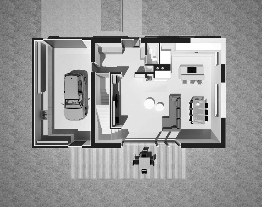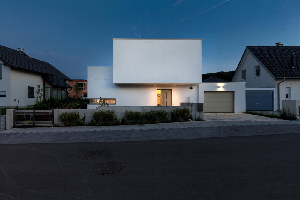 Náš návrh limitujúce podmienky zapracoval do architektonického konceptu tak, že hmotu prízemia (garáž + denná časť domu) sme orientovali lineárne s priamym napojením na susednú garáž na hranici parciel s podporením držania línie uličnej čiary. Na prízemí má náš dom do ulice (na sever) len kontaktné okno z kuchyne a hlavnú presklenú stenu do záhrady (na juh), smerom k obom susedom po stranách (východ a západ) nemá žiadne okenné otvory. Orientovať nočnú časť na poschodí výlučne na juh do záhrady považujeme štandardne (z hľadiska udržania teplotnej pohody) za chybu, preto sme hmotu poschodia voči prízemiu otočili o 90 stupňov. Benefitom je východné slnko svietiace ráno do oboch spální.