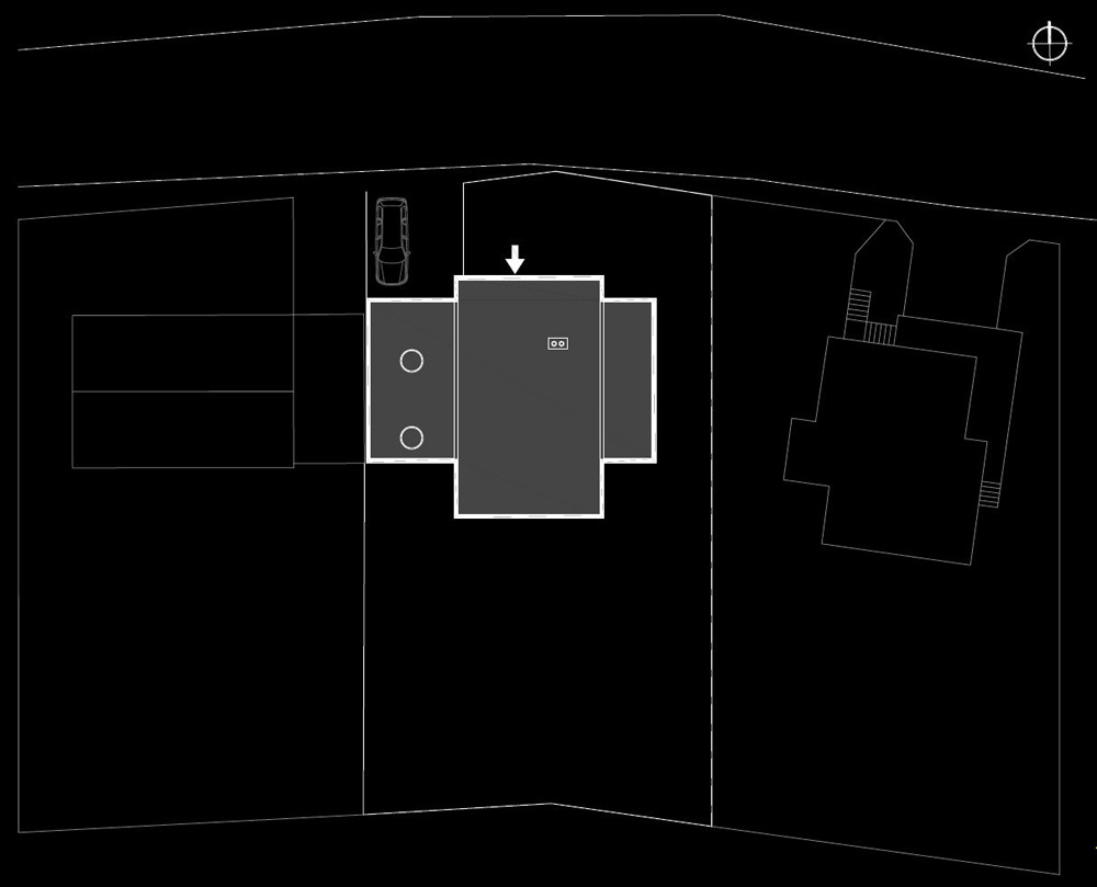 V podobnom kontexte sa udial aj príbeh tohto domu. Dom sa nachádza na parcele typickej pre v súčasnosti developované územia, výmera cca 700 m2, orientácia sever/juh – ulica/dvor. Pre návrh priestorového konceptu boli určujúce nasledovné faktory – stavebne obsadené obe susedné parcely (na západnej strane rodinným domom s garážou na hranici nášho pozemku a na východnej strane rodinný domom, ktorého hlavné okenné otvory a exteriérové priestory boli orientované smerom k nášmu pozemku) a severný spád nášho pozemku s výškovou diferenciou cca 1,5 – 2,0 m od úrovne komunikácie.