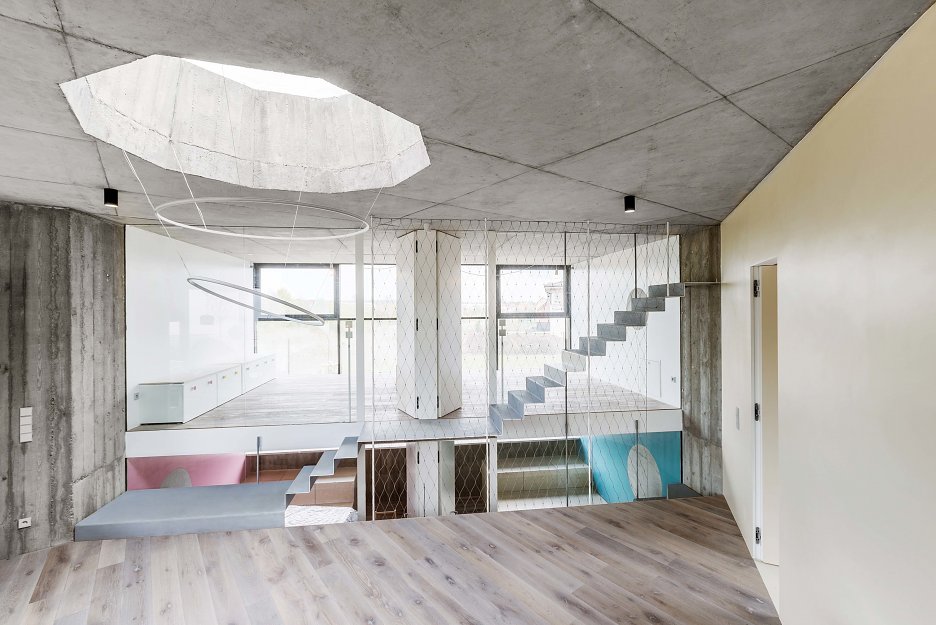 Vstupný dvojpodlažný blok tvorí spálňa rodičov na prízemí, šatňa, kúpeľňa a technické zázemie v suteréne. Na vstup nadväzuje do krajiny otvorený blok obývačky a kuchyne a "priehľadný" dvojposchodový blok so štyrmi detskými izbami. V strede domu, pod osemstenným svetlíkom je umiestnený jedálenský stôl. Ten slúži ako miesto stretnutia členov domácnosti. "Dům semkne rodinu dohromady, a zároveň nabídne soukromé prostory pro každého z nich," dopĺňa autorka.