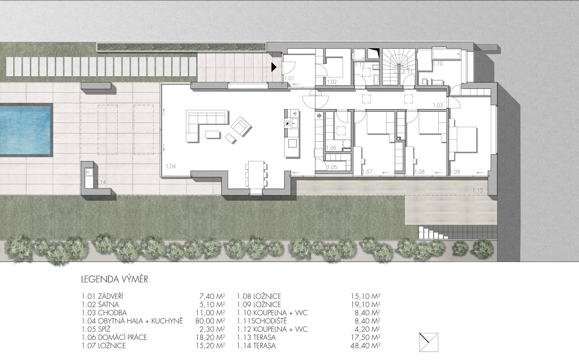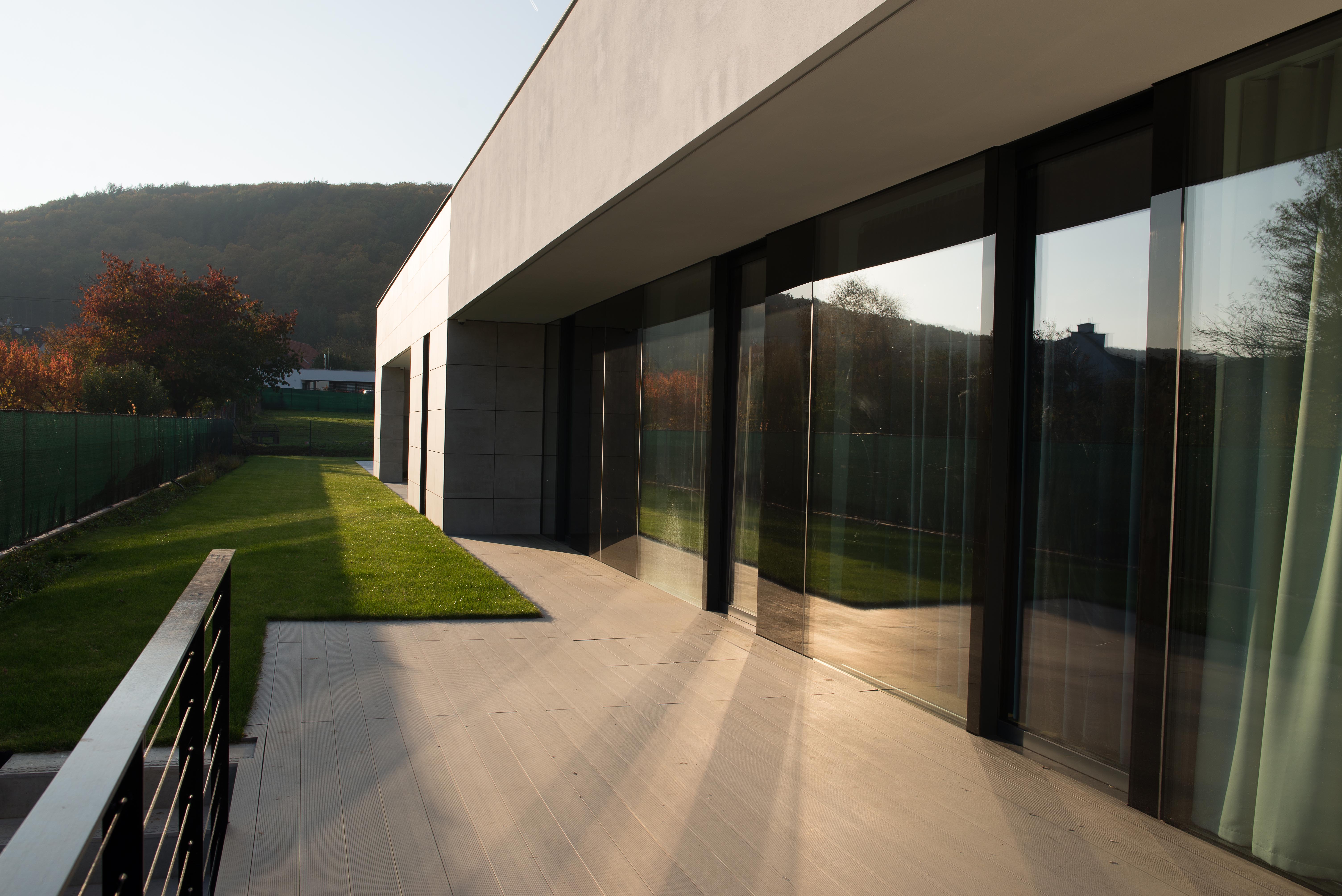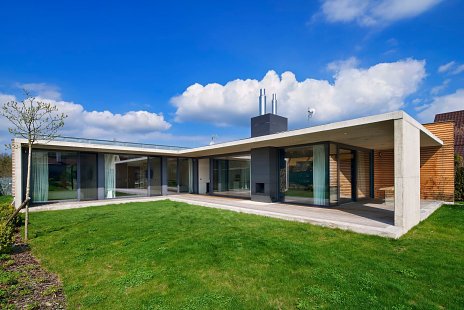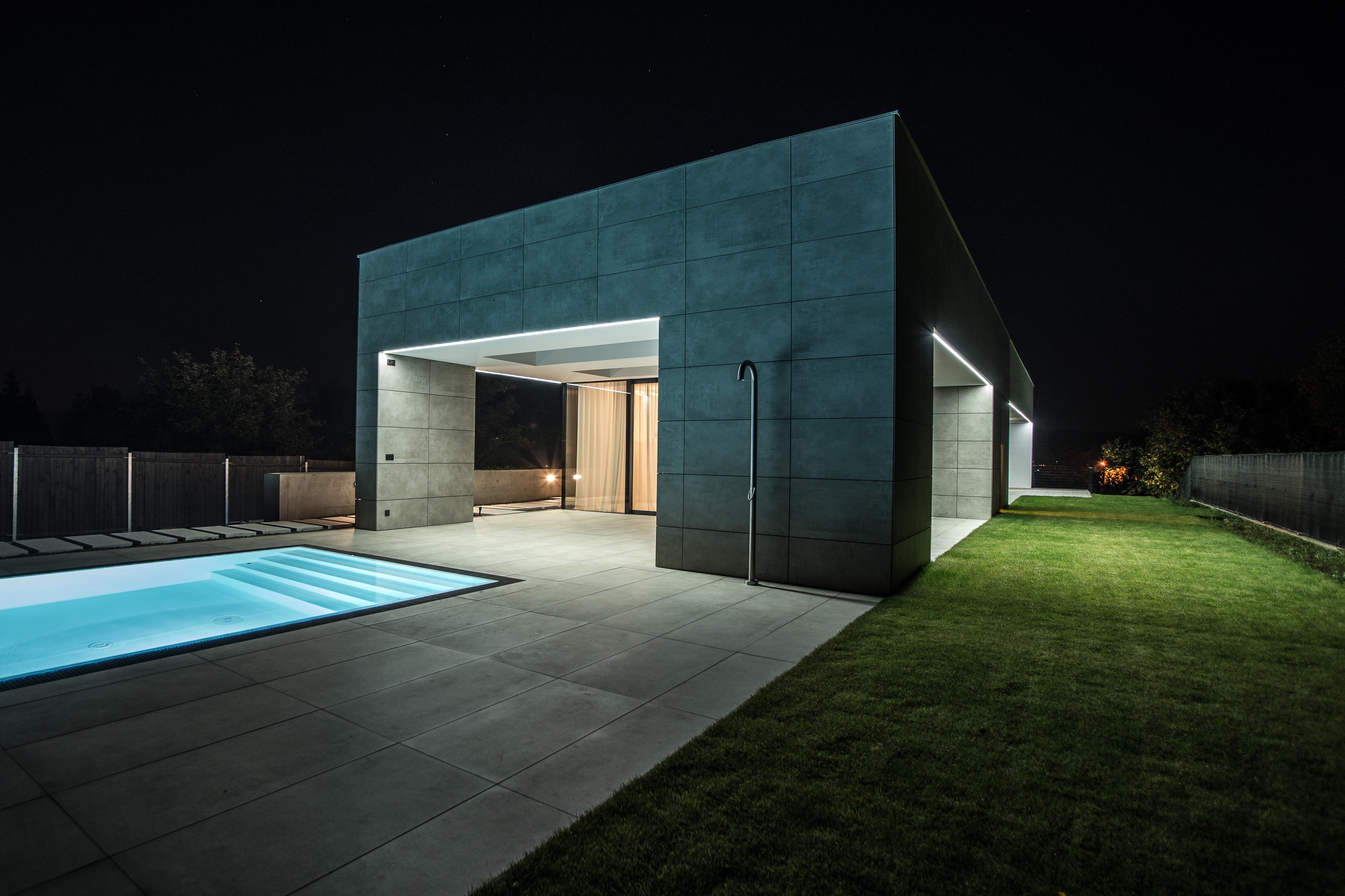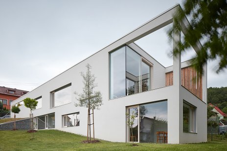 „Pro pocit bezpečí a intimity jsem část budovy, respektive střechu předsadil před líc domu, tím vznikl zastřešený prostor, který v letních měsících zvětšuje pobytovou plochu interiéru o další atraktivní prostor, který je však díky masivním nosným pilířům a vhodně zvolenou výsadbou zeleně krytý před zraky potencionálních pozorovatelů.“ vysvetľuje koncept architekt Petr Skrušný.
