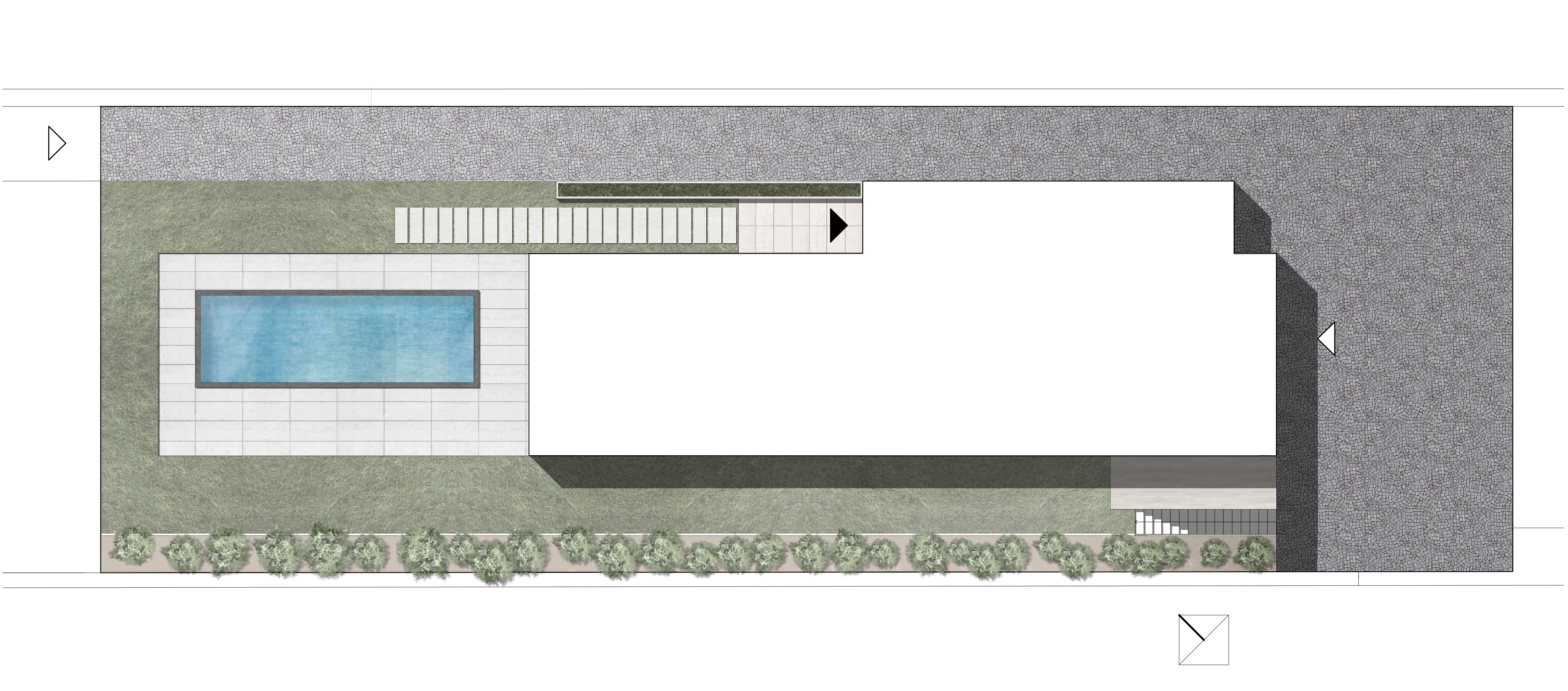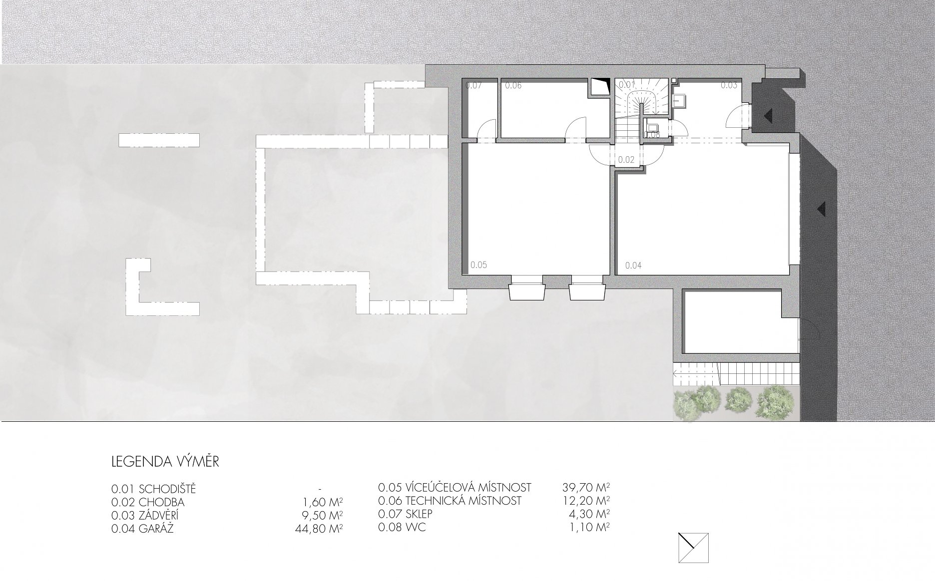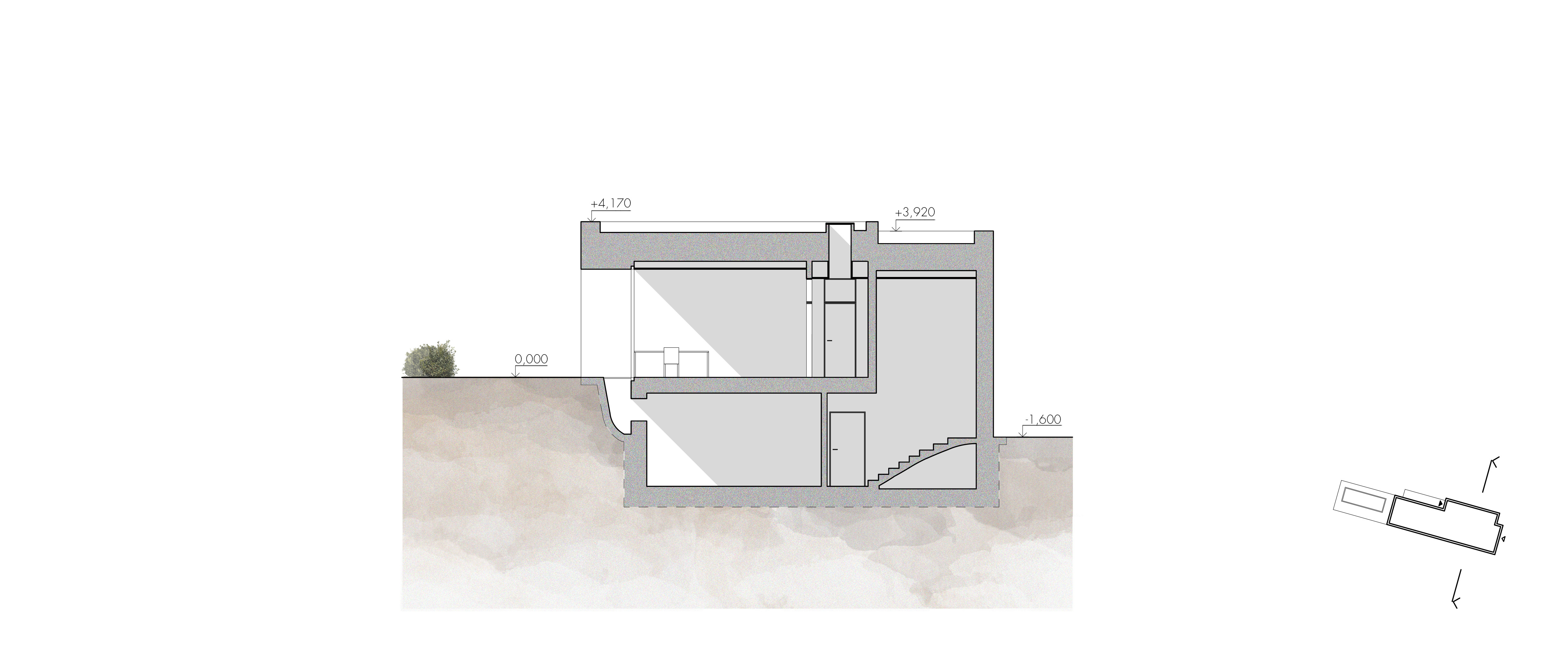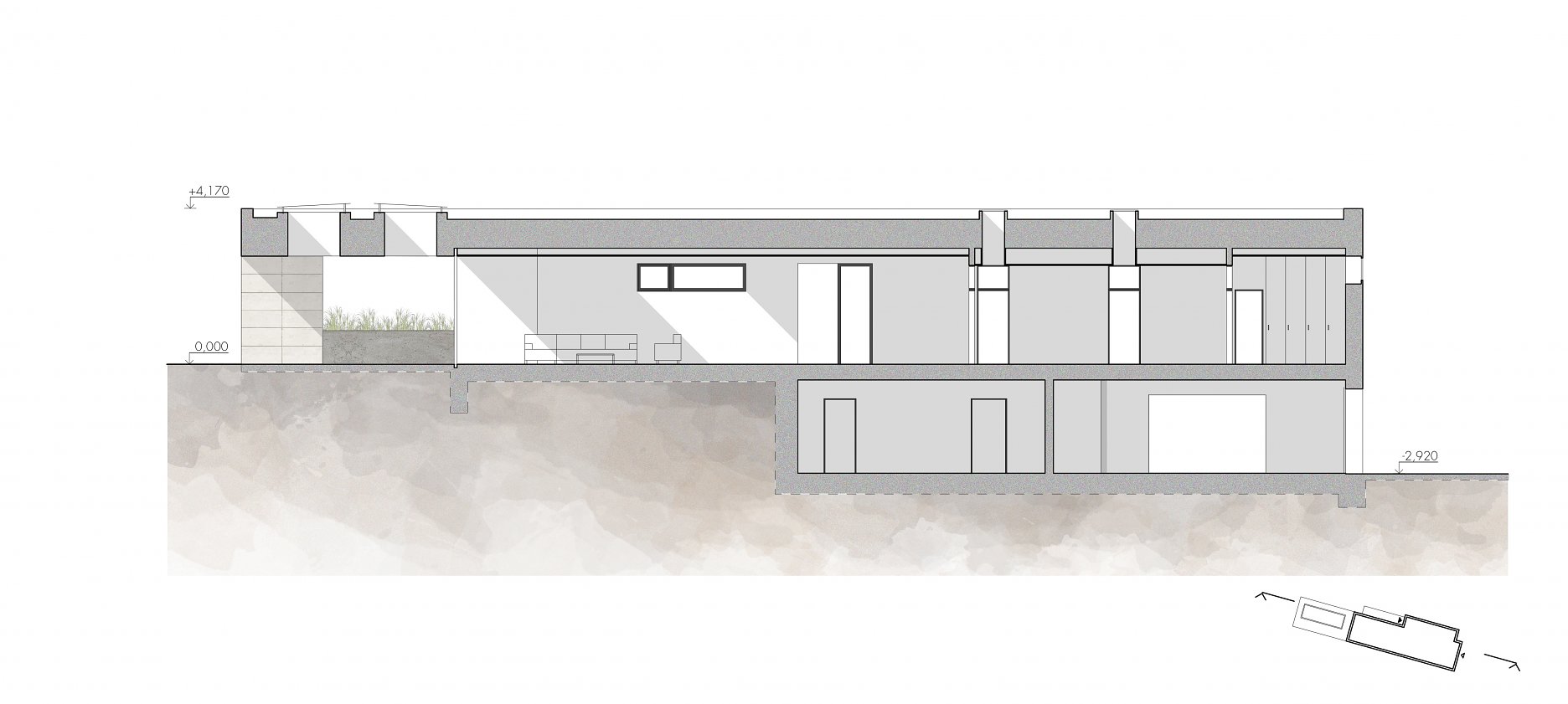 „Pro pocit bezpečí a intimity jsem část budovy, respektive střechu předsadil před líc domu, tím vznikl zastřešený prostor, který v letních měsících zvětšuje pobytovou plochu interiéru o další atraktivní prostor, který je však díky masivním nosným pilířům a vhodně zvolenou výsadbou zeleně krytý před zraky potencionálních pozorovatelů.“ vysvetľuje koncept architekt Petr Skrušný.