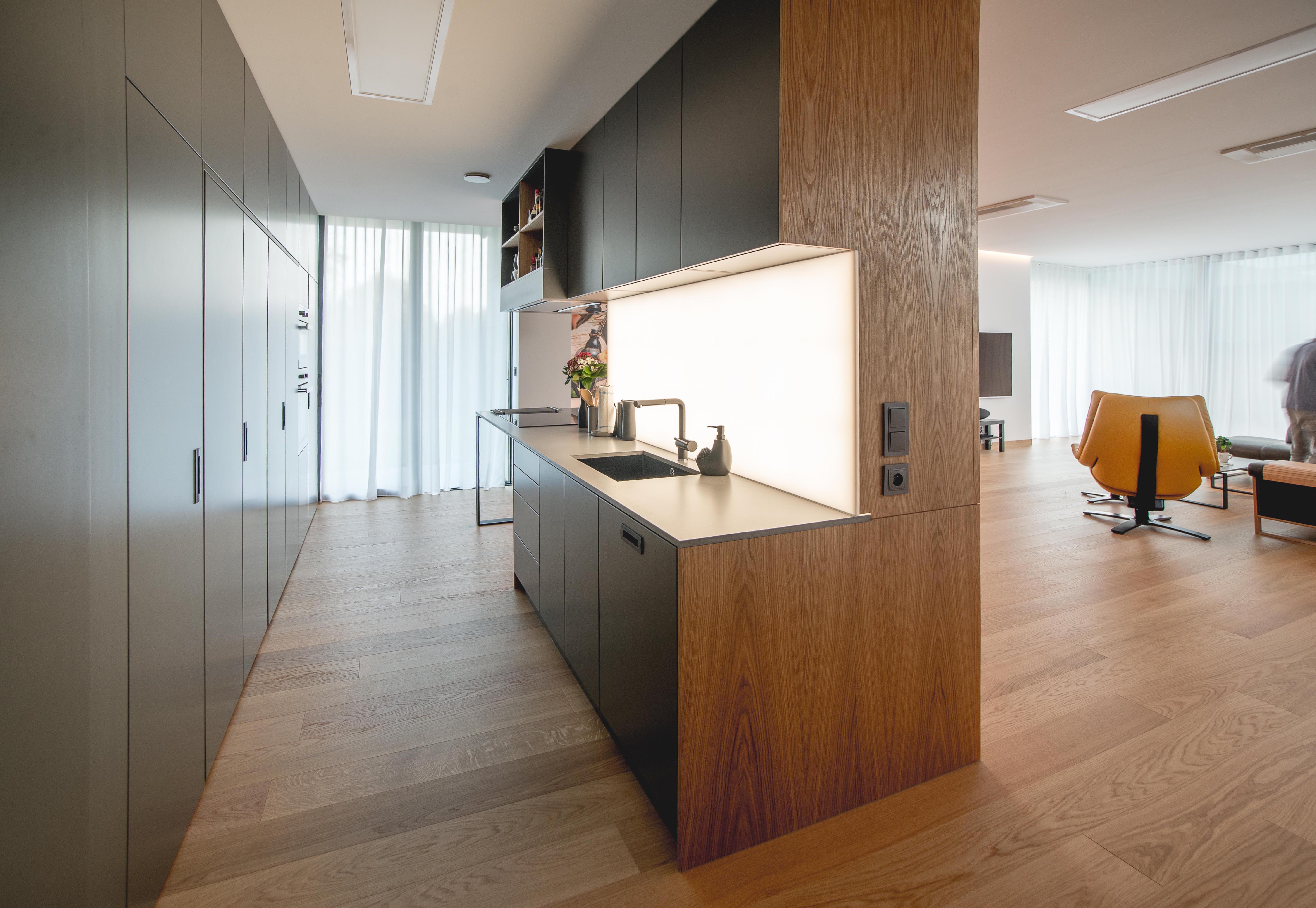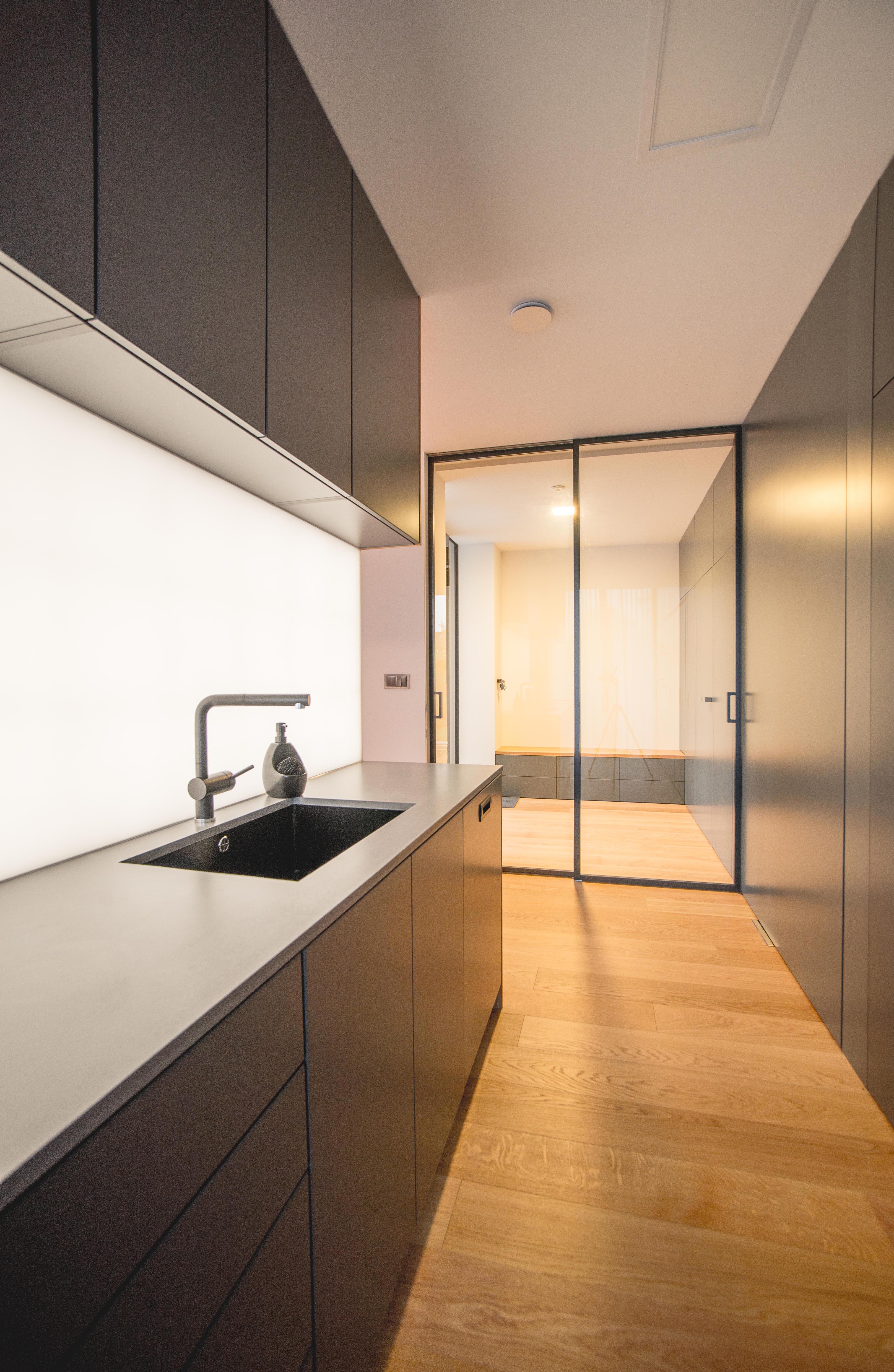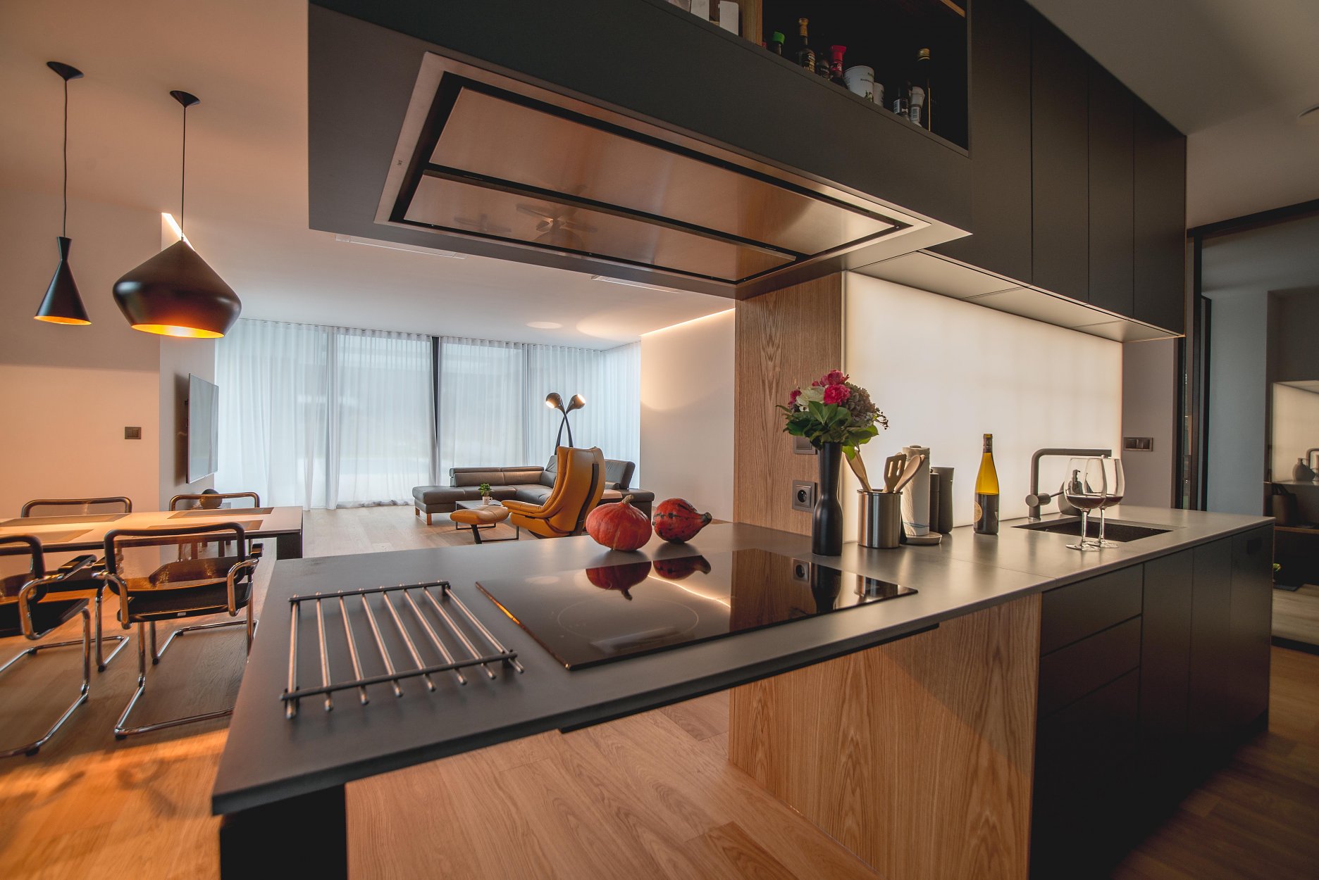Na pracovnej doske v kuchyni, jedálenskom stole a konferenčnom stolíku sú použité subtílne betónové dosky tmavosivej farby. Zaujímavý je spôsob osvetlenia pracovnej dosky. Veľkoformátový LED svetelný panel zabezpečuje rovnomerné difúzne svetlo potrebné pri práci v kuchyni. K čistote architektonického riešenia prispievajú dvierka posuvných stien, ktoré je vďaka špeciálnym kovaniam možné zasunúť do roviny obkladu.Atypickým riešením je tiež kyvná deliaca stena medzi obytným priestorom a chodbou ku spálni. Kyvný mechanizmus je zabudovaný do podlahy a stropu, nevystupuje do priestoru.