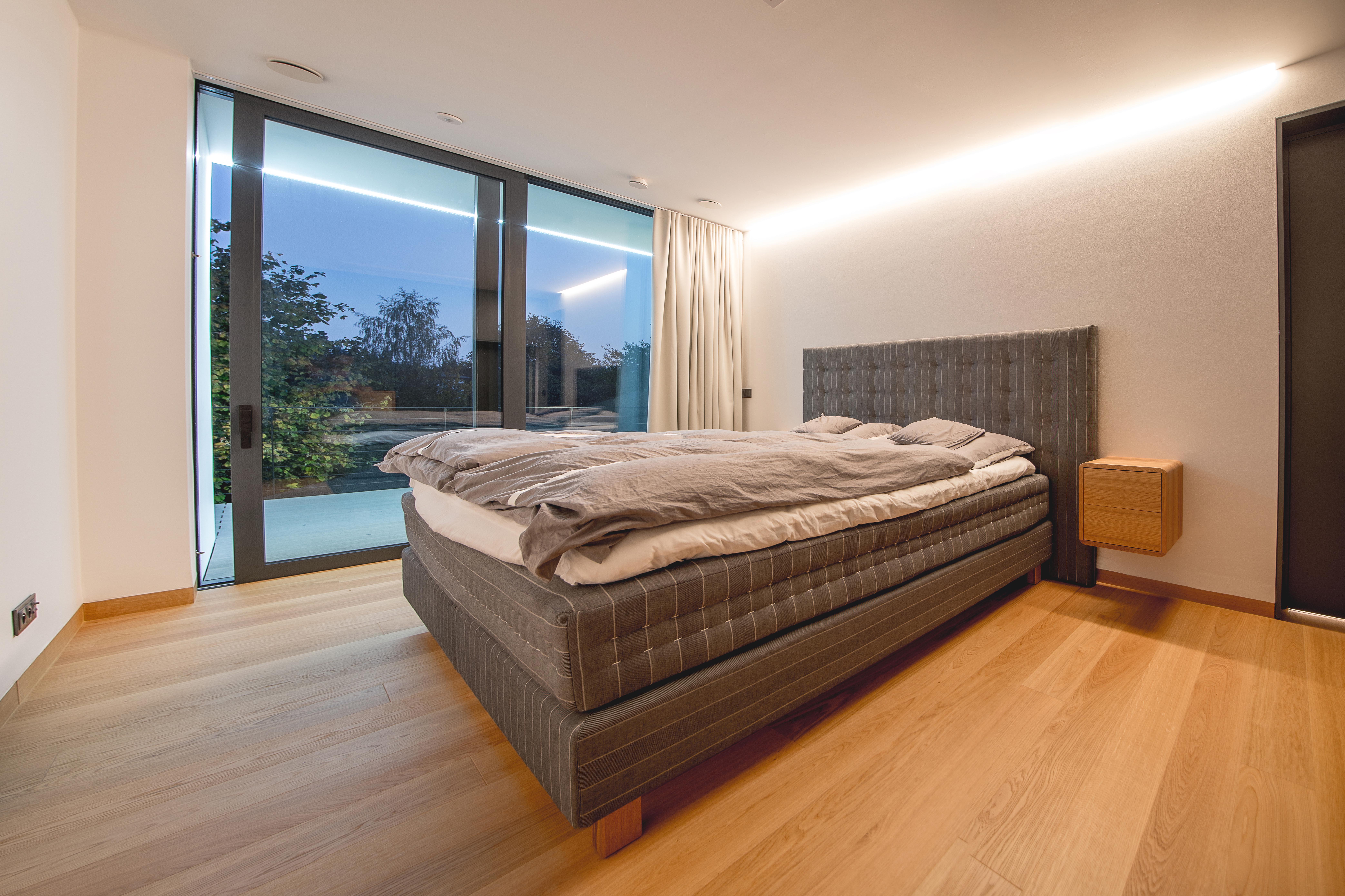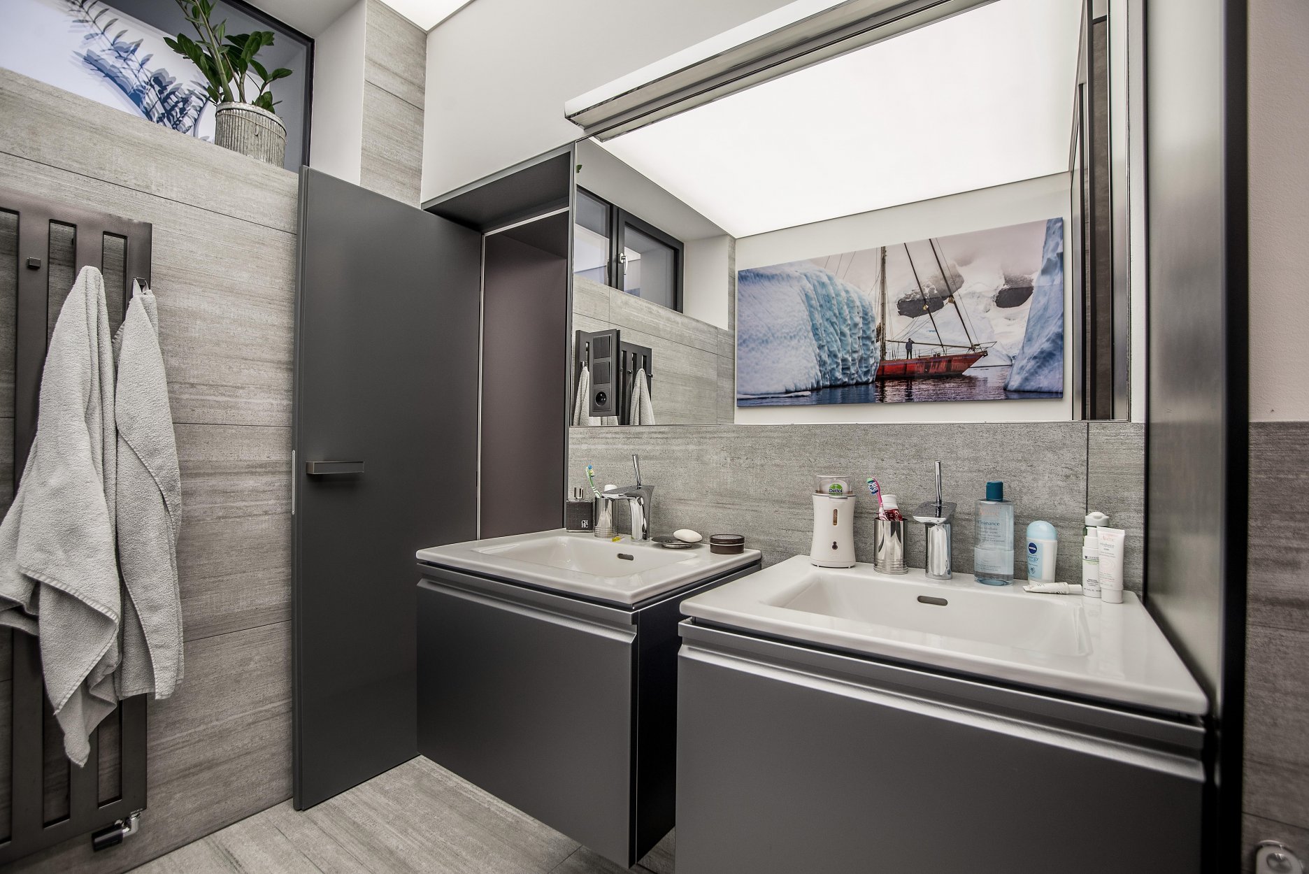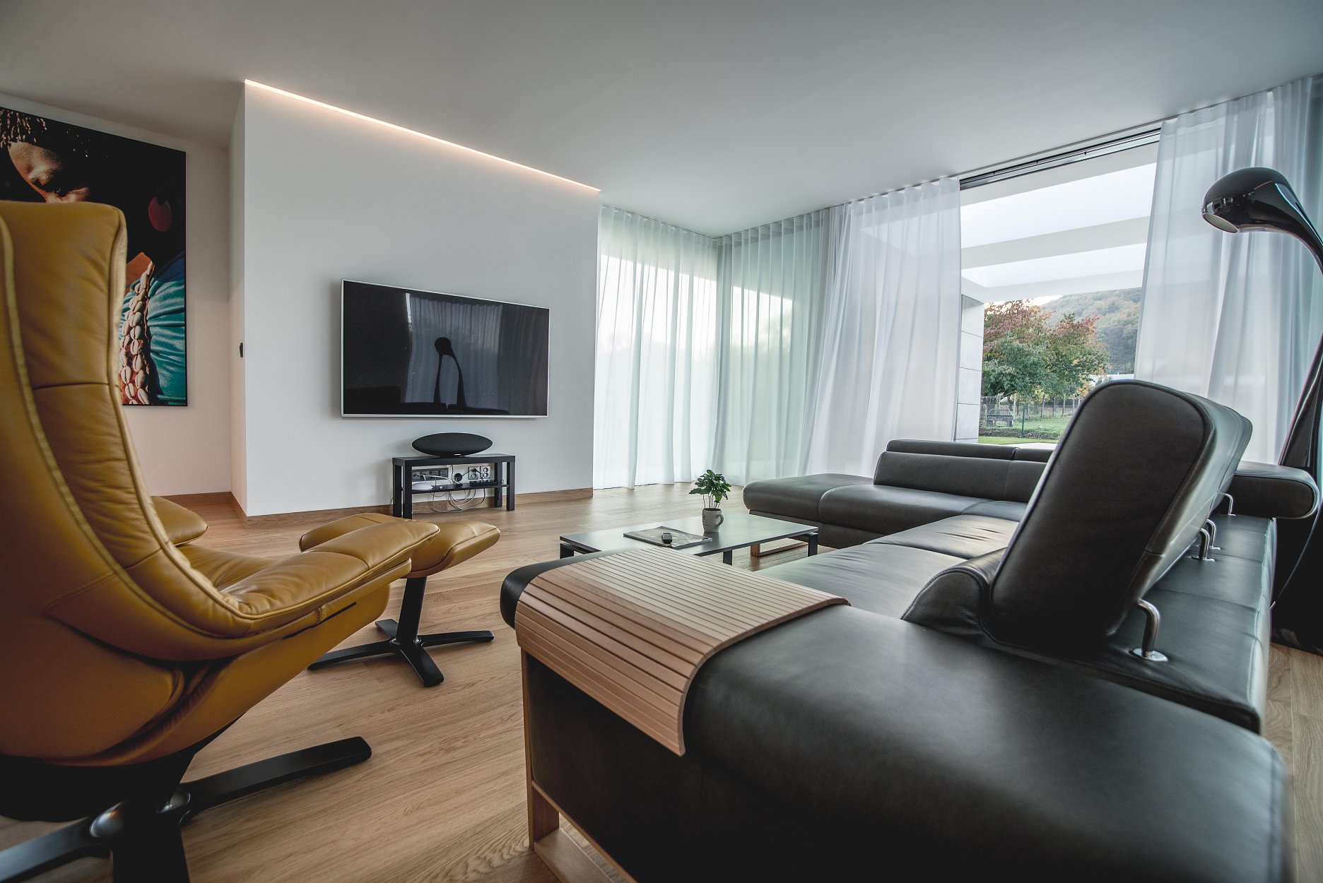 Na pracovnej doske v kuchyni, jedálenskom stole a konferenčnom stolíku sú použité subtílne betónové dosky tmavosivej farby. Zaujímavý je spôsob osvetlenia pracovnej dosky. Veľkoformátový LED svetelný panel zabezpečuje rovnomerné difúzne svetlo potrebné pri práci v kuchyni. K čistote architektonického riešenia prispievajú dvierka posuvných stien, ktoré je vďaka špeciálnym kovaniam možné zasunúť do roviny obkladu.Atypickým riešením je tiež kyvná deliaca stena medzi obytným priestorom a chodbou ku spálni. Kyvný mechanizmus je zabudovaný do podlahy a stropu, nevystupuje do priestoru.