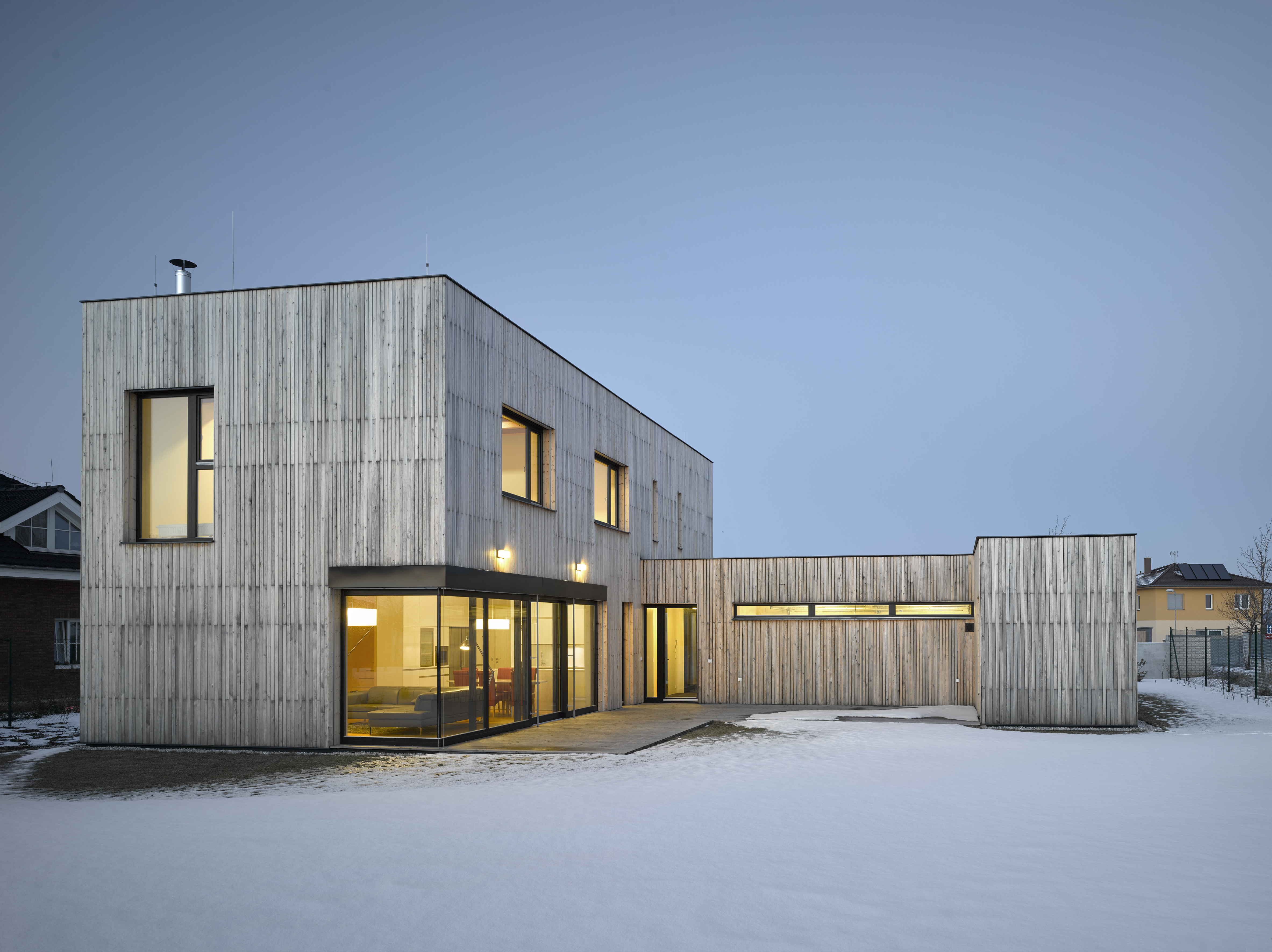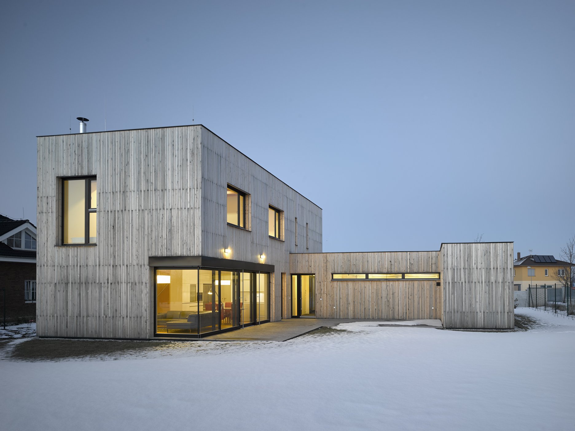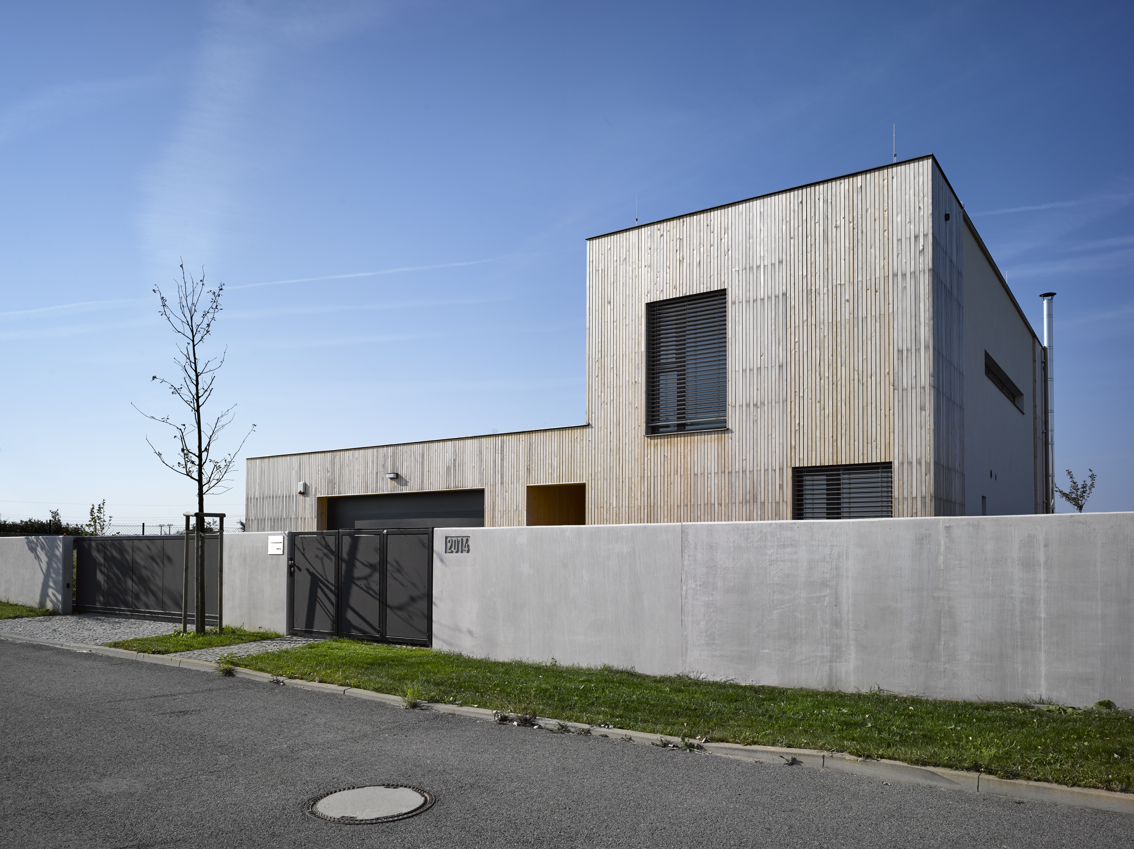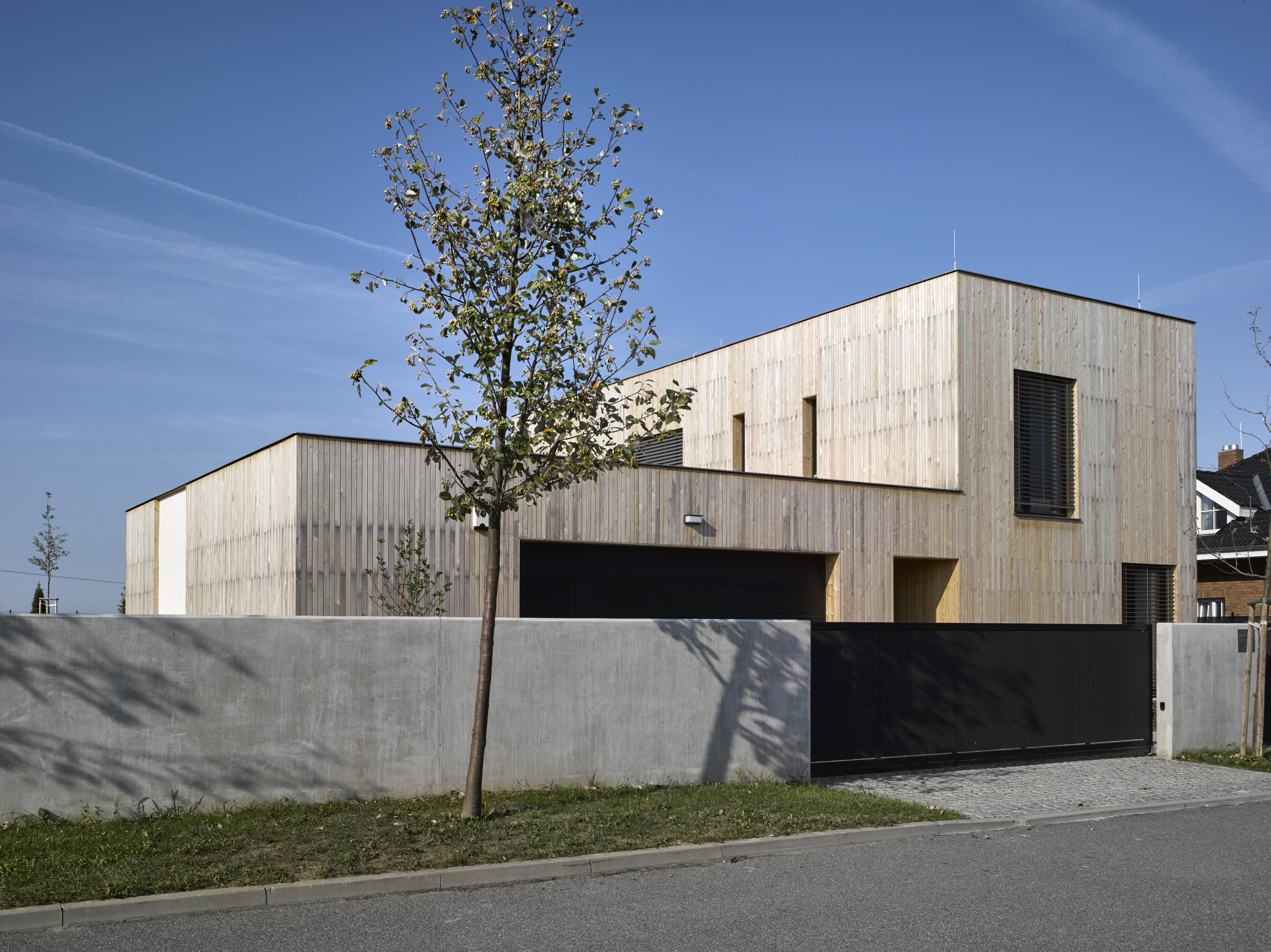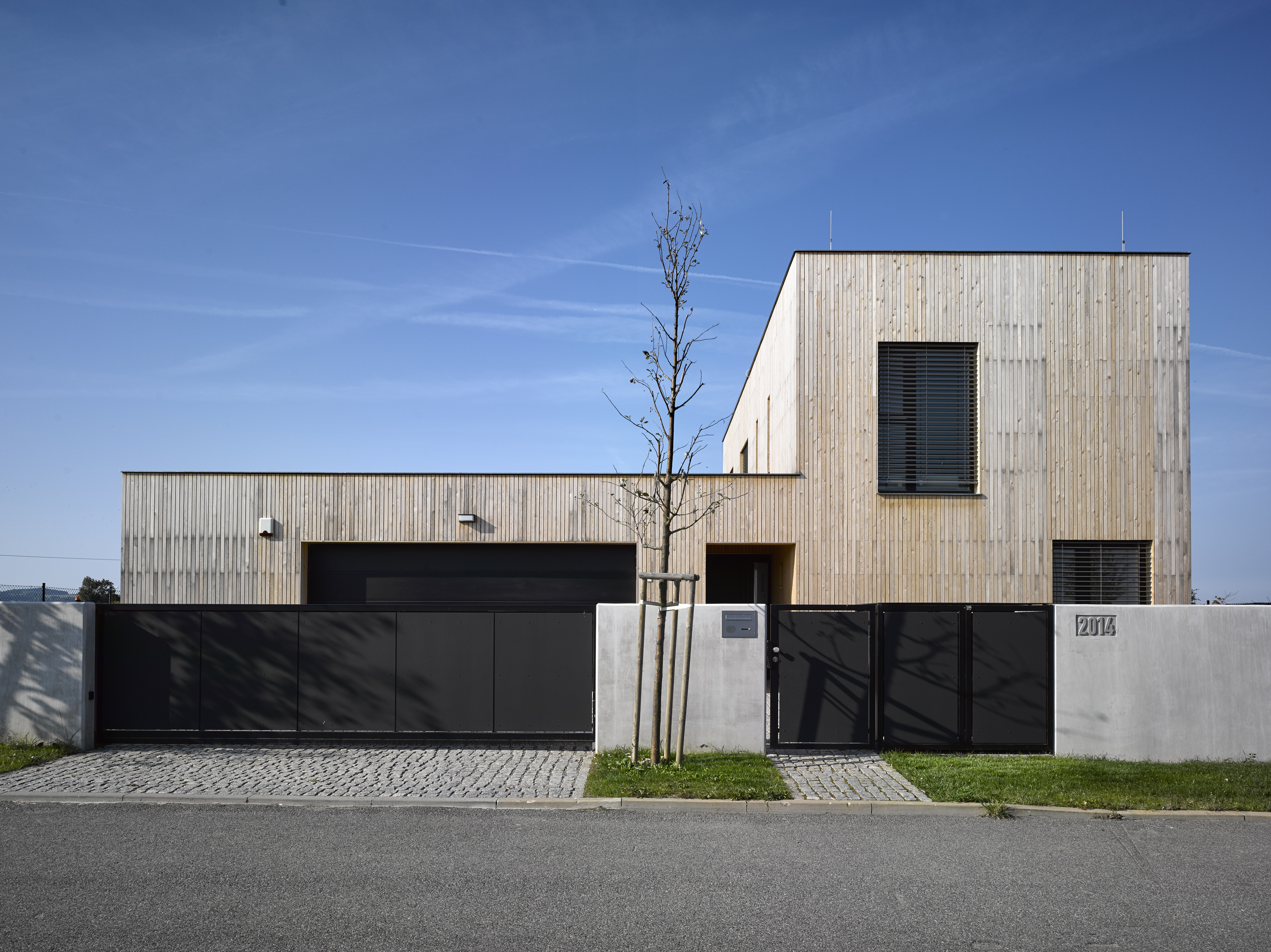 Pri pohľade z ulice môžeme vnímať linku betónového oplotenia, ktoré dôsledne integruje priestor pre odpadky a poštovú schránku. Pevné betónové časti striedajú tmavé otváravé segmenty. Drevom obložená fasáda domu je členená dôsledne komponovanými stavebnými otvormi. Aj v tomto prípade bol použitý tmavý antracitový odťieň okenných rámov, ktorý podporuje tektoniku riešenia.