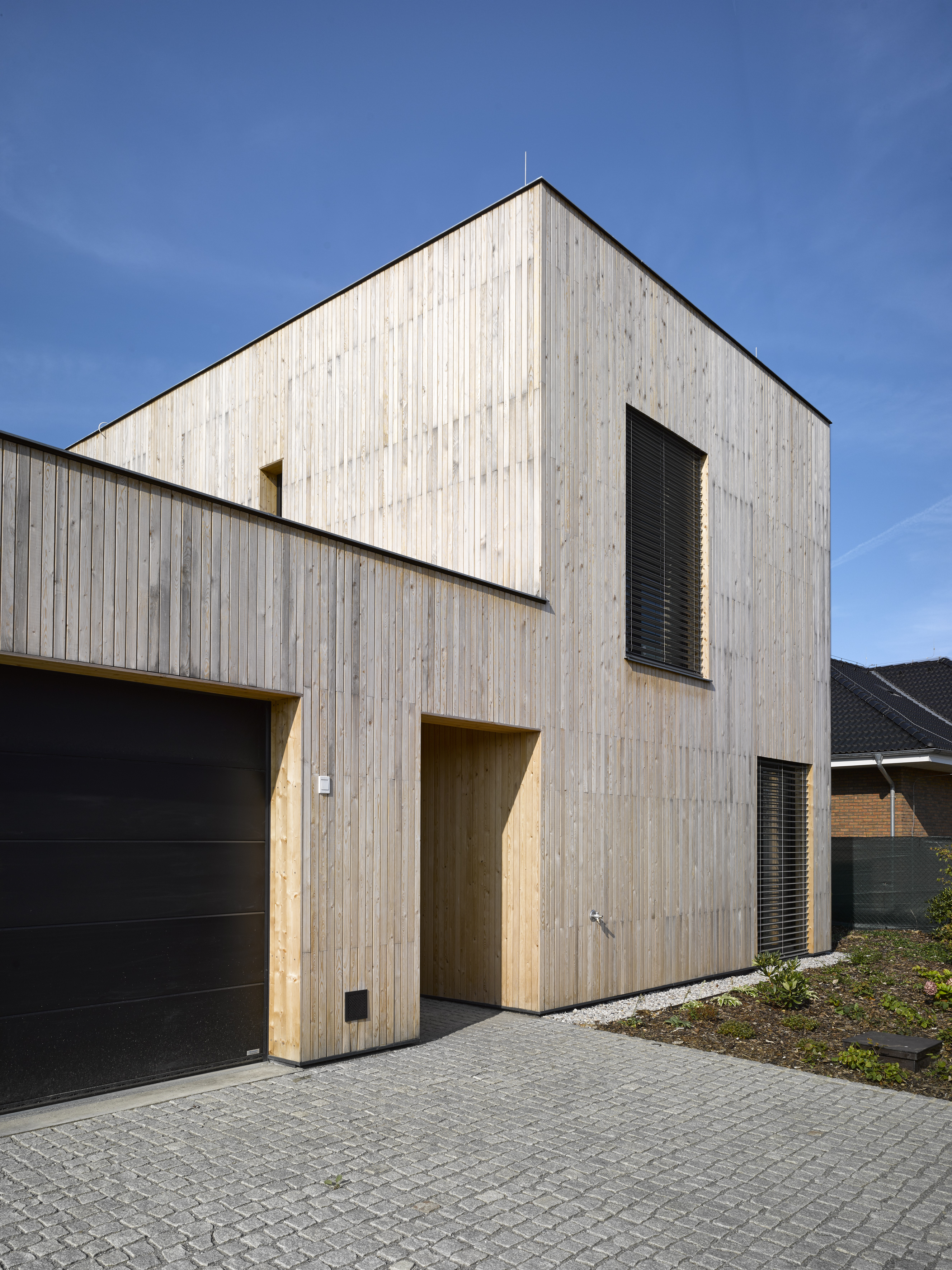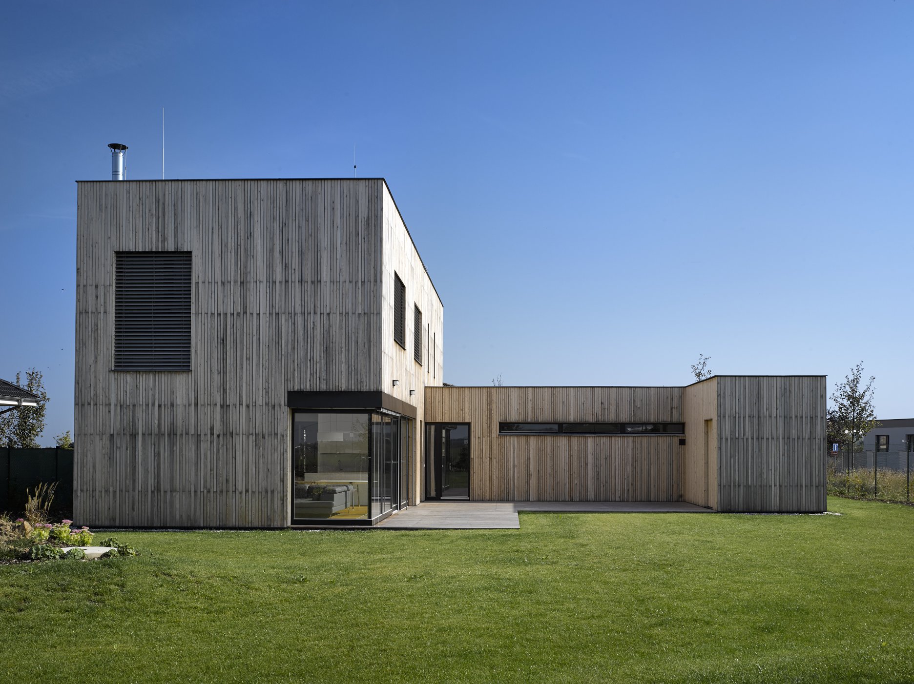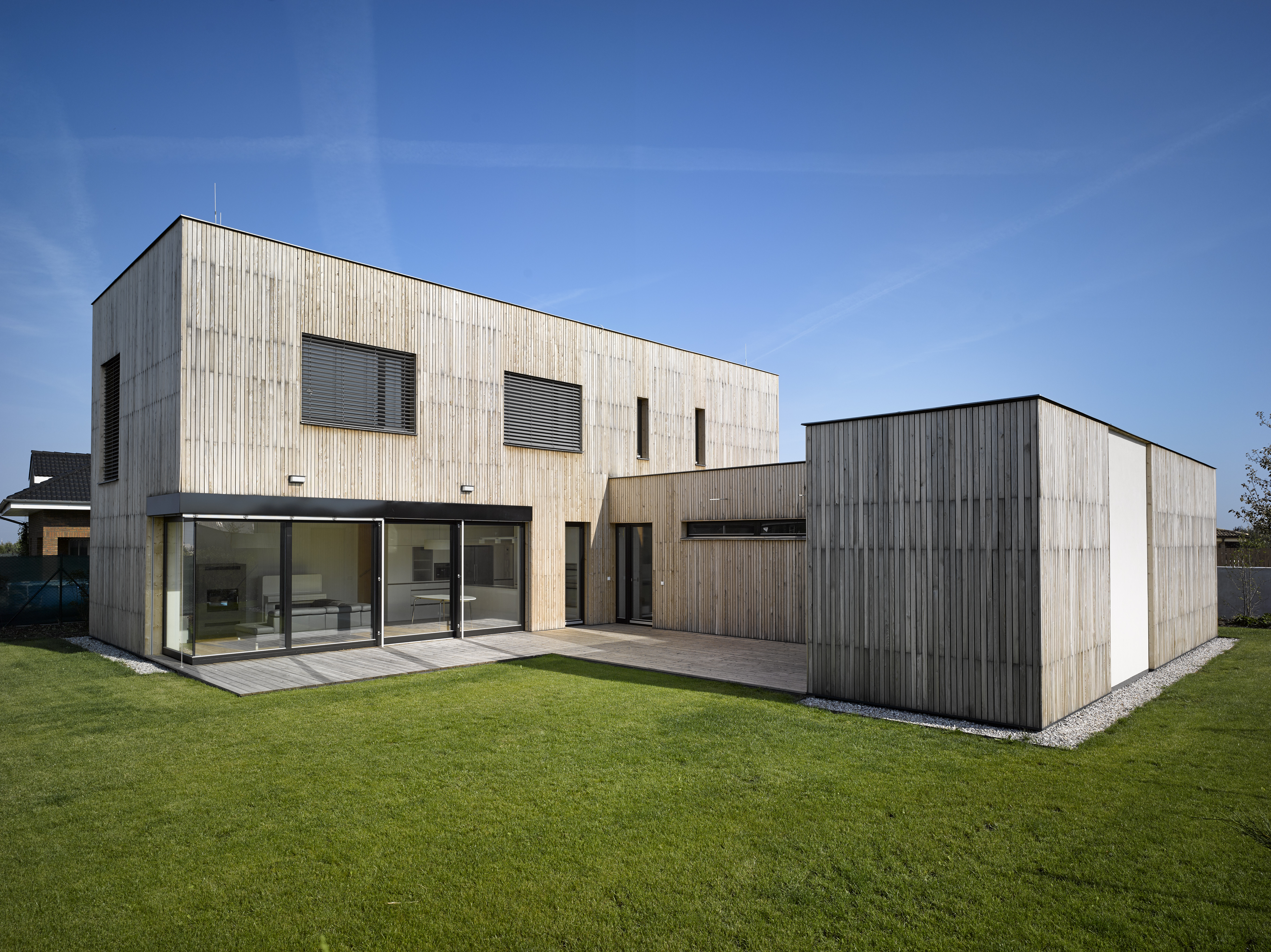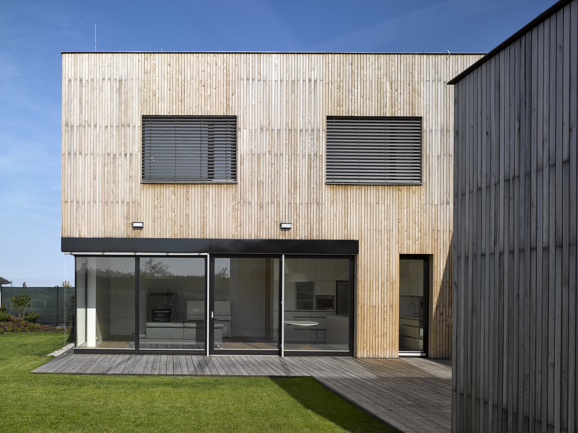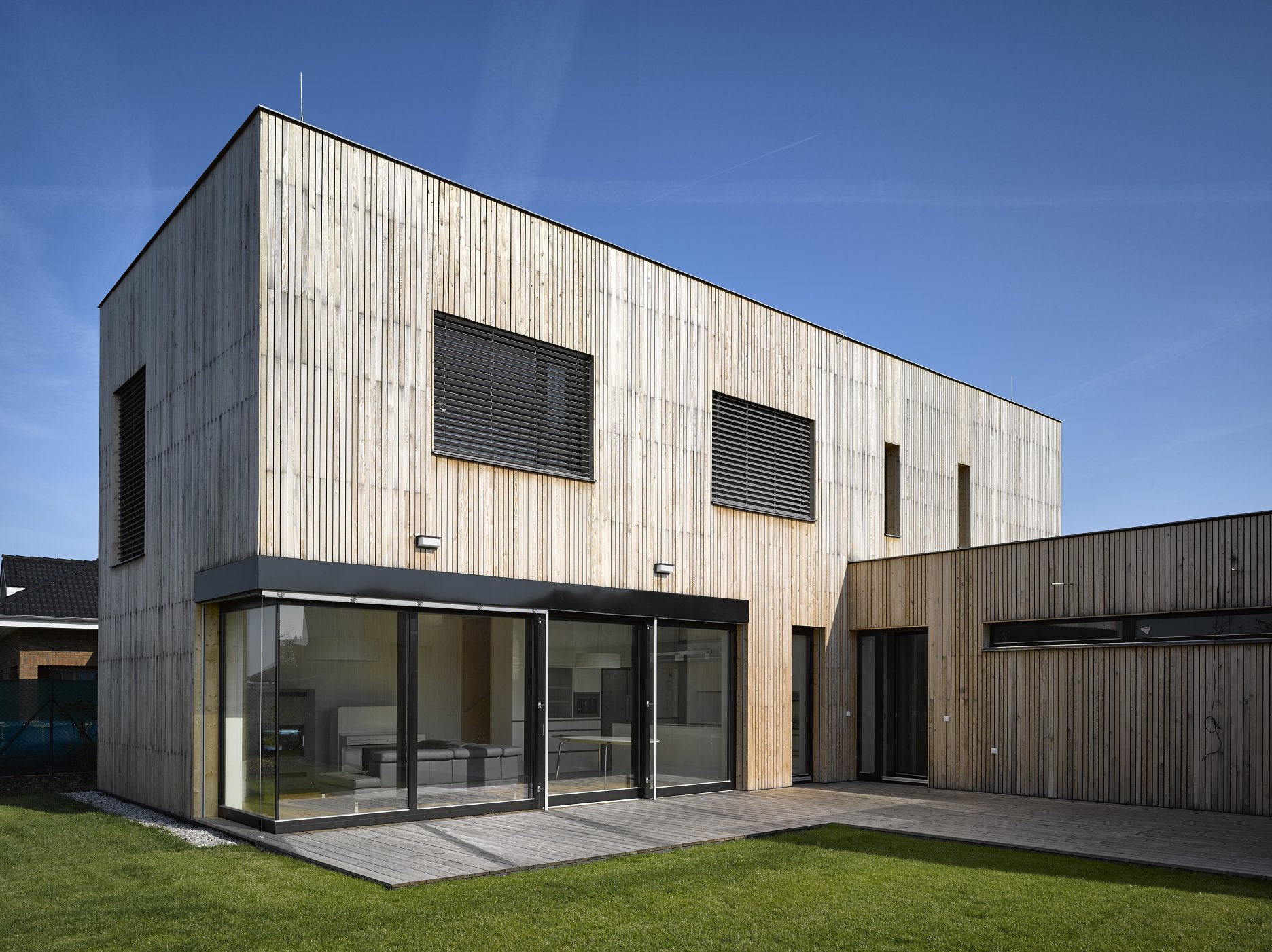 Pri pohľade z ulice môžeme vnímať linku betónového oplotenia, ktoré dôsledne integruje priestor pre odpadky a poštovú schránku. Pevné betónové časti striedajú tmavé otváravé segmenty. Drevom obložená fasáda domu je členená dôsledne komponovanými stavebnými otvormi. Aj v tomto prípade bol použitý tmavý antracitový odťieň okenných rámov, ktorý podporuje tektoniku riešenia.