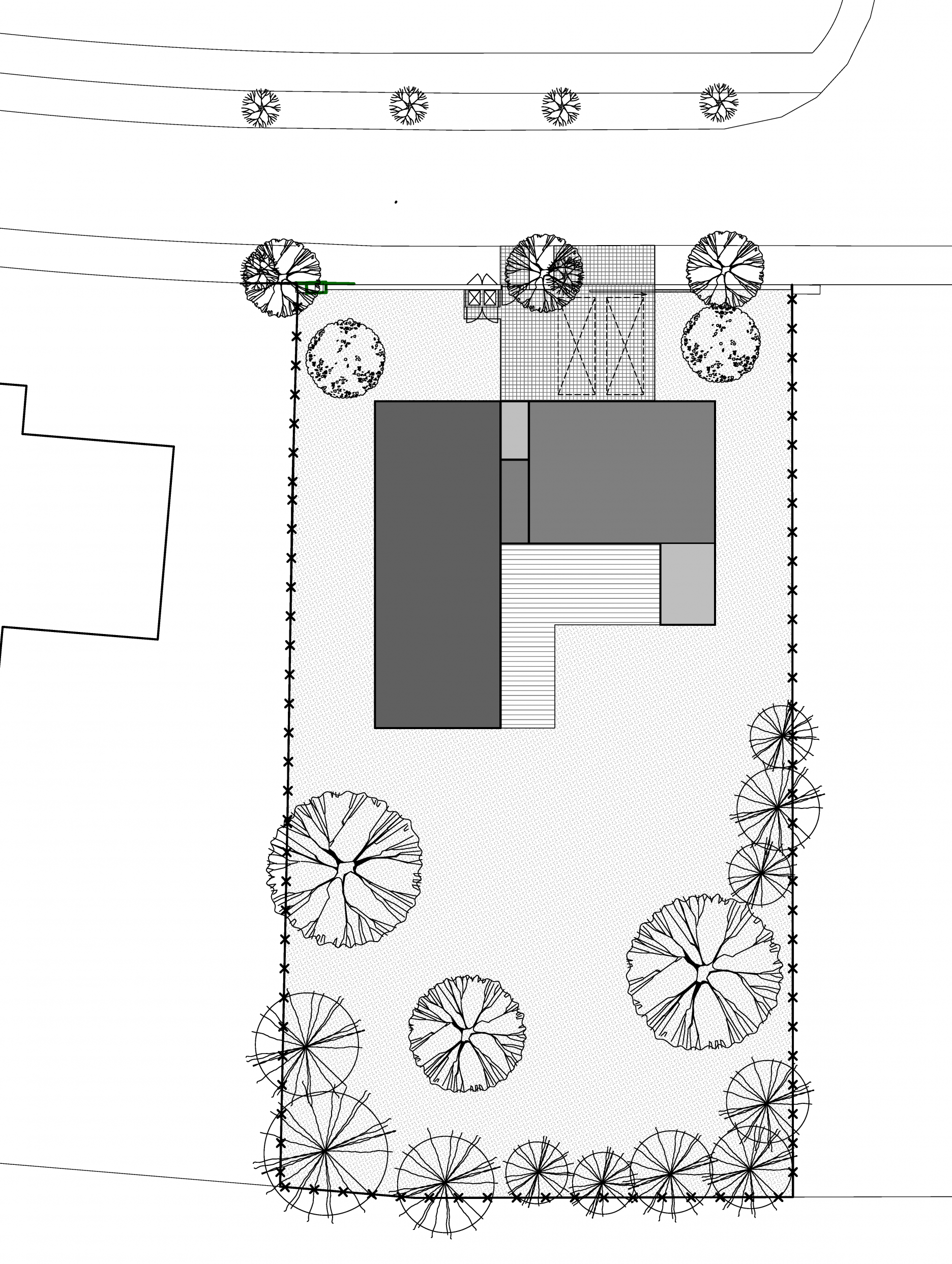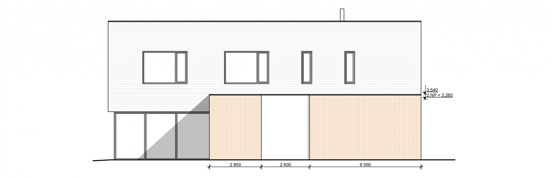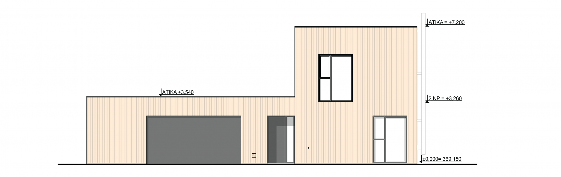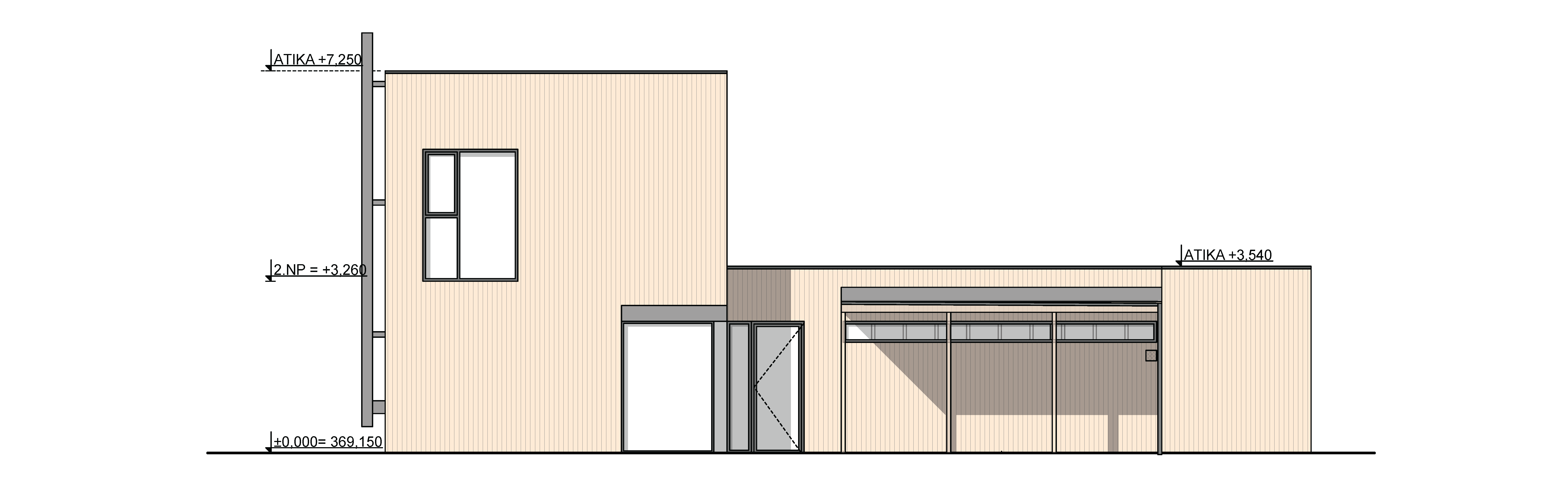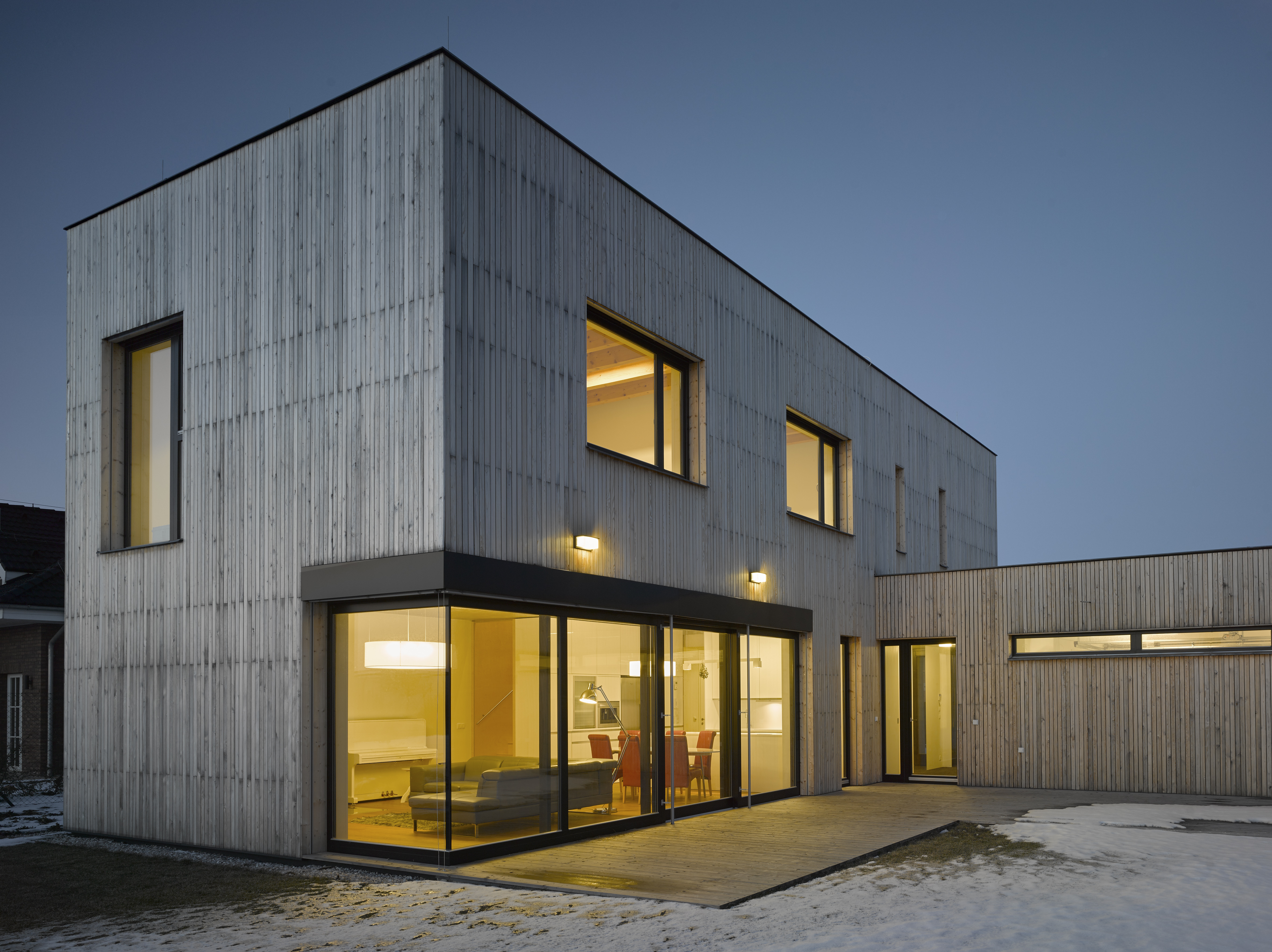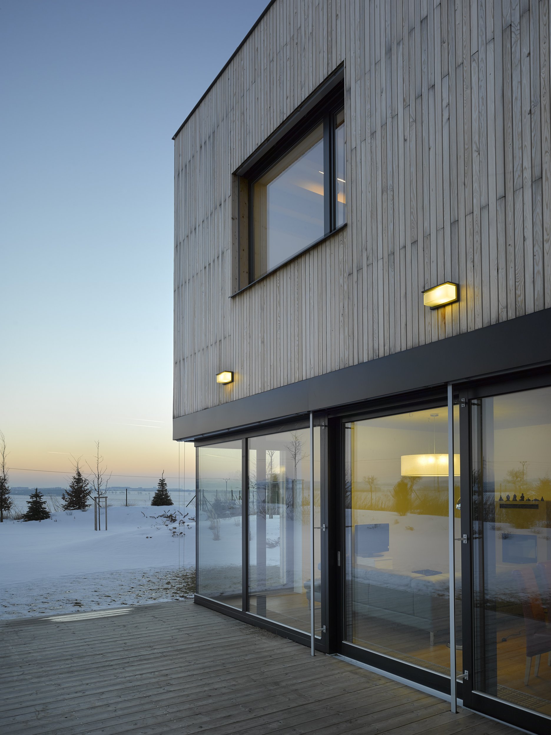 Pri pohľade z ulice môžeme vnímať linku betónového oplotenia, ktoré dôsledne integruje priestor pre odpadky a poštovú schránku. Pevné betónové časti striedajú tmavé otváravé segmenty. Drevom obložená fasáda domu je členená dôsledne komponovanými stavebnými otvormi. Aj v tomto prípade bol použitý tmavý antracitový odťieň okenných rámov, ktorý podporuje tektoniku riešenia.