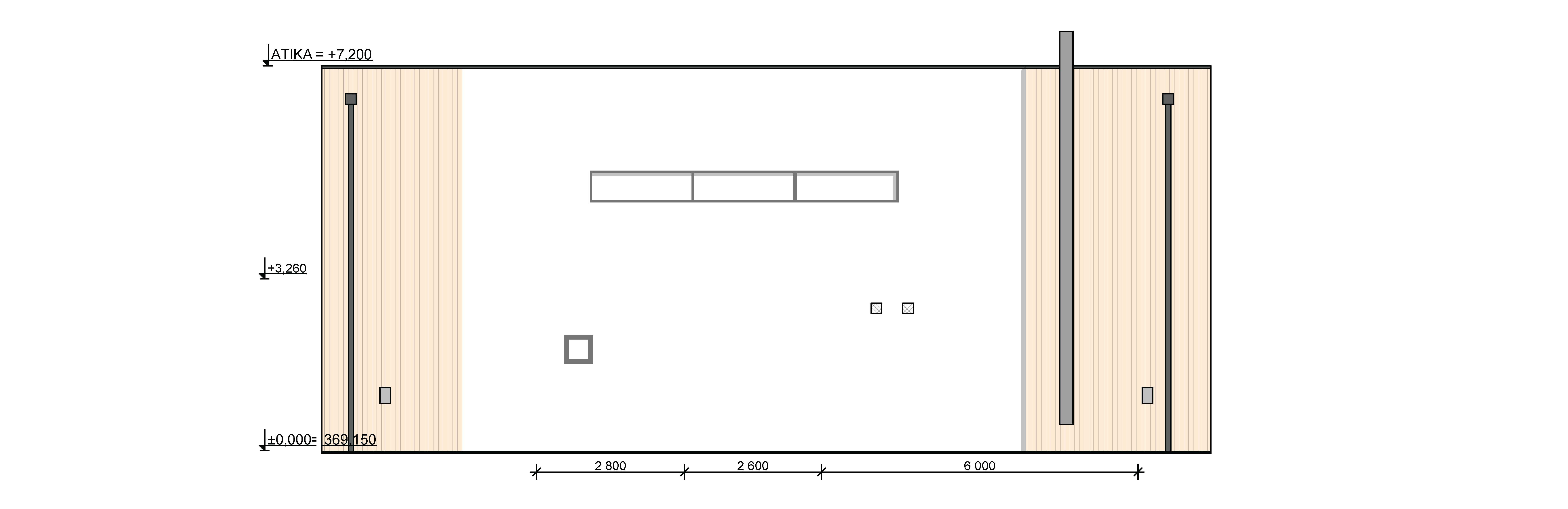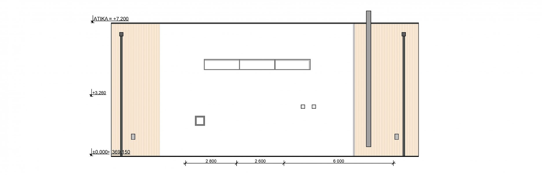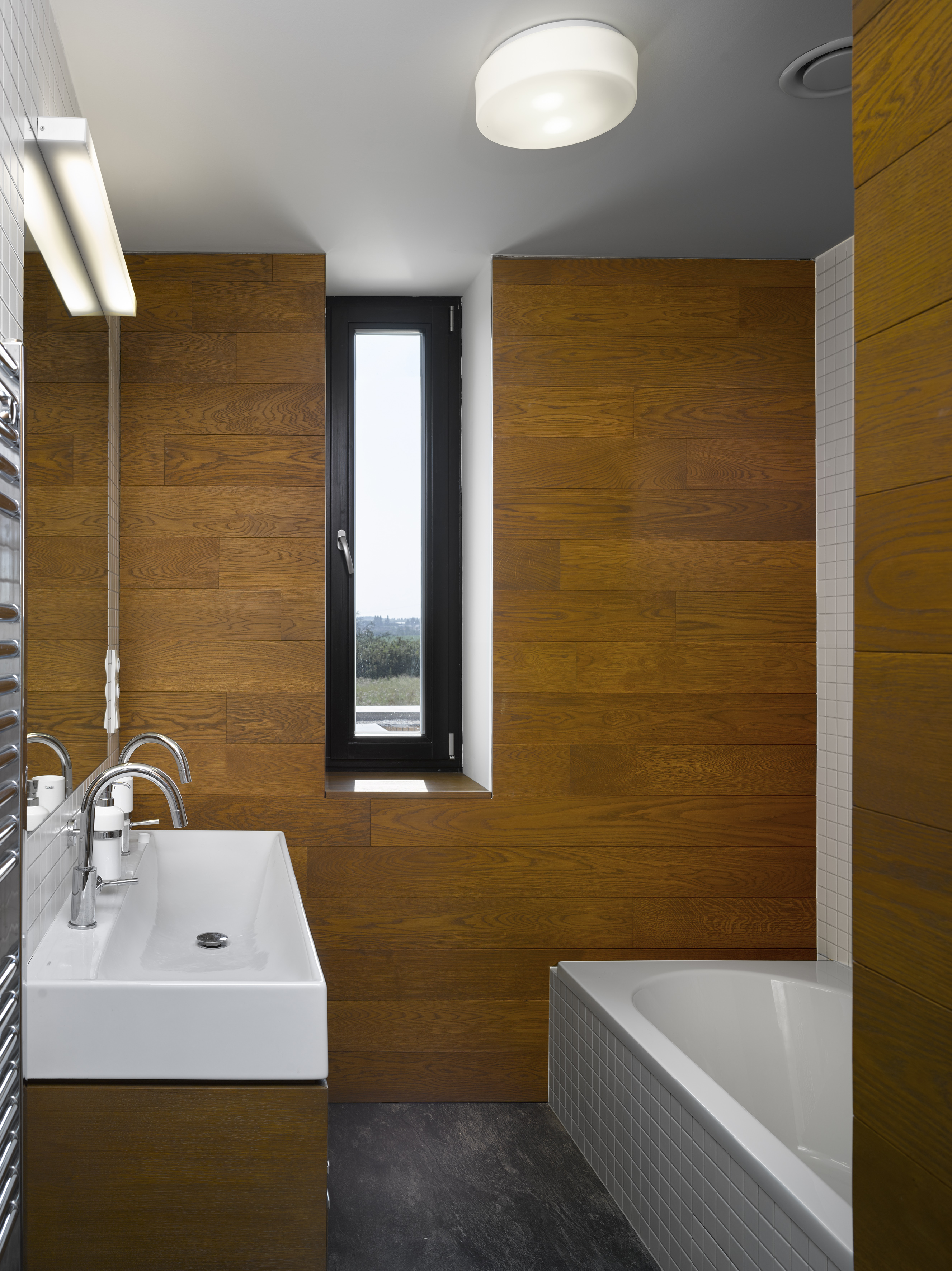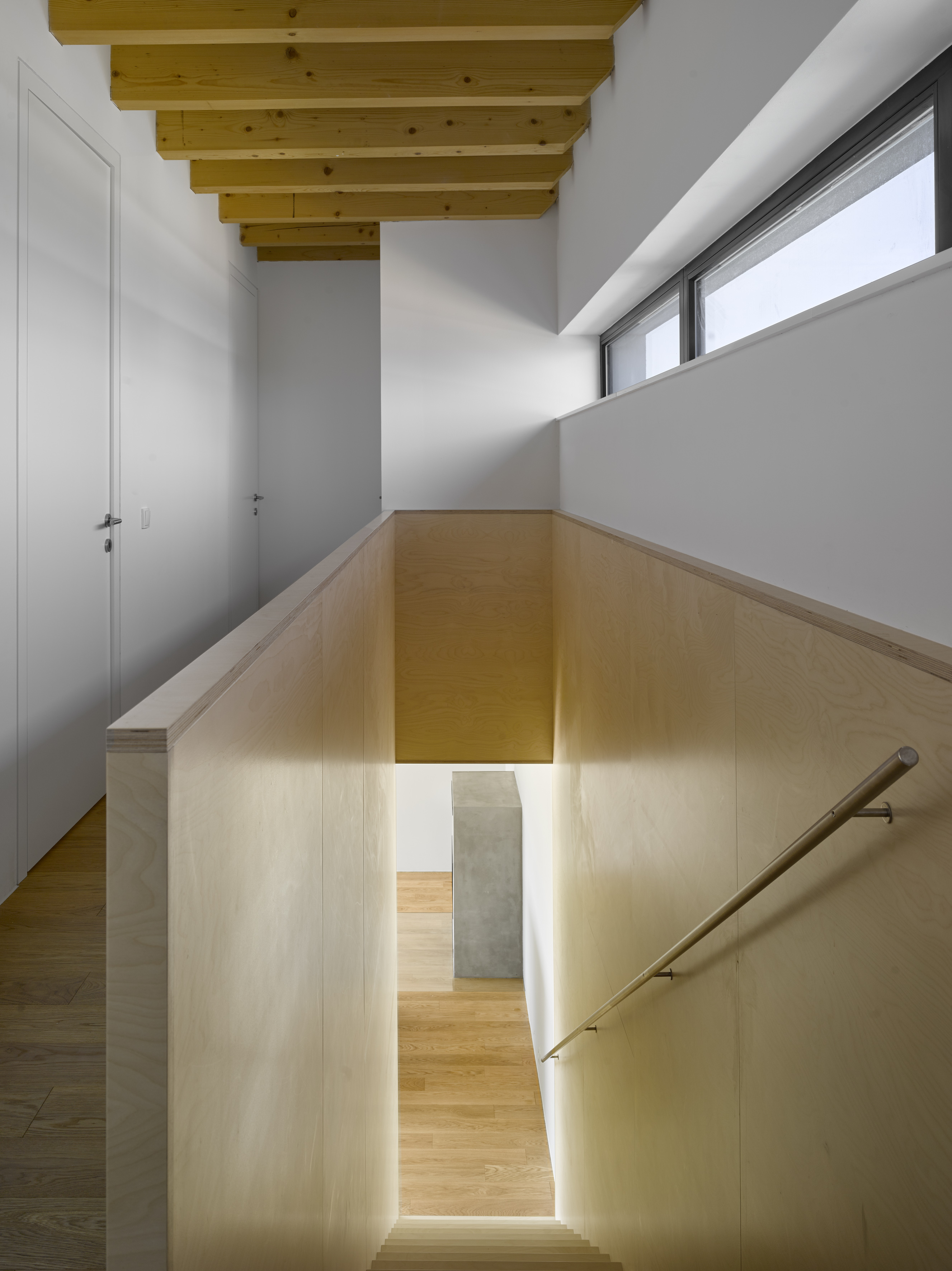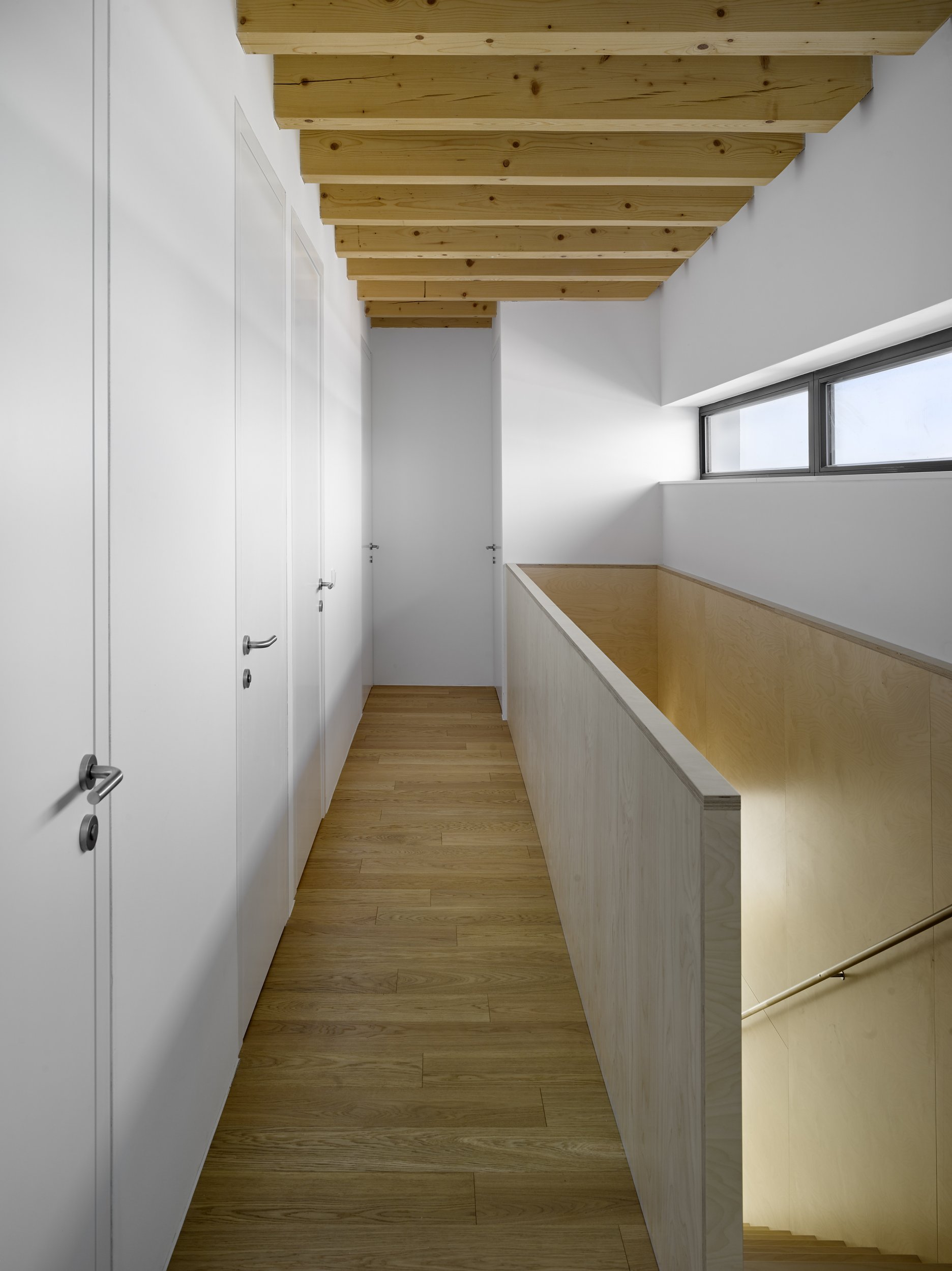 Pri pohľade z ulice môžeme vnímať linku betónového oplotenia, ktoré dôsledne integruje priestor pre odpadky a poštovú schránku. Pevné betónové časti striedajú tmavé otváravé segmenty. Drevom obložená fasáda domu je členená dôsledne komponovanými stavebnými otvormi. Aj v tomto prípade bol použitý tmavý antracitový odťieň okenných rámov, ktorý podporuje tektoniku riešenia.