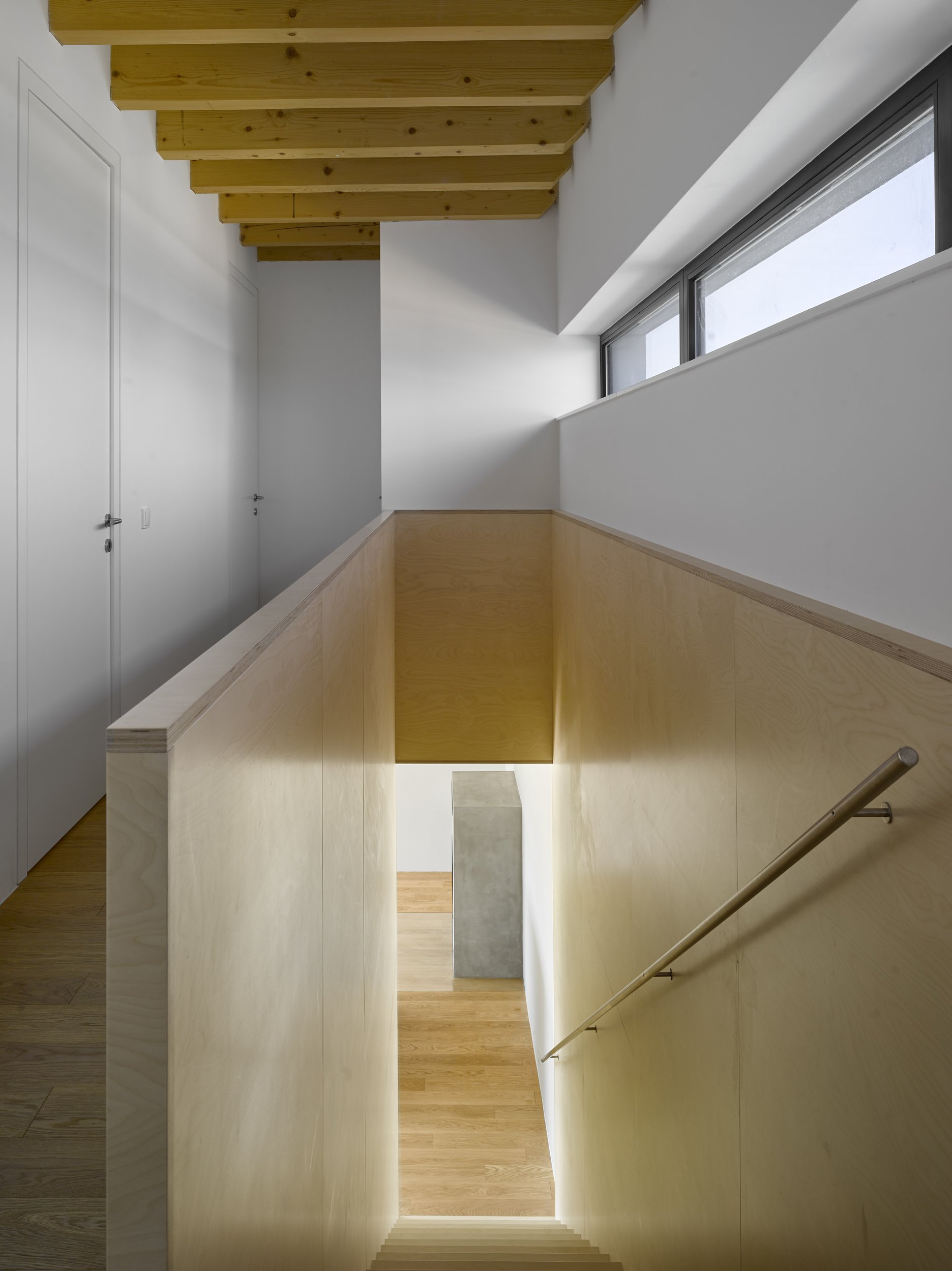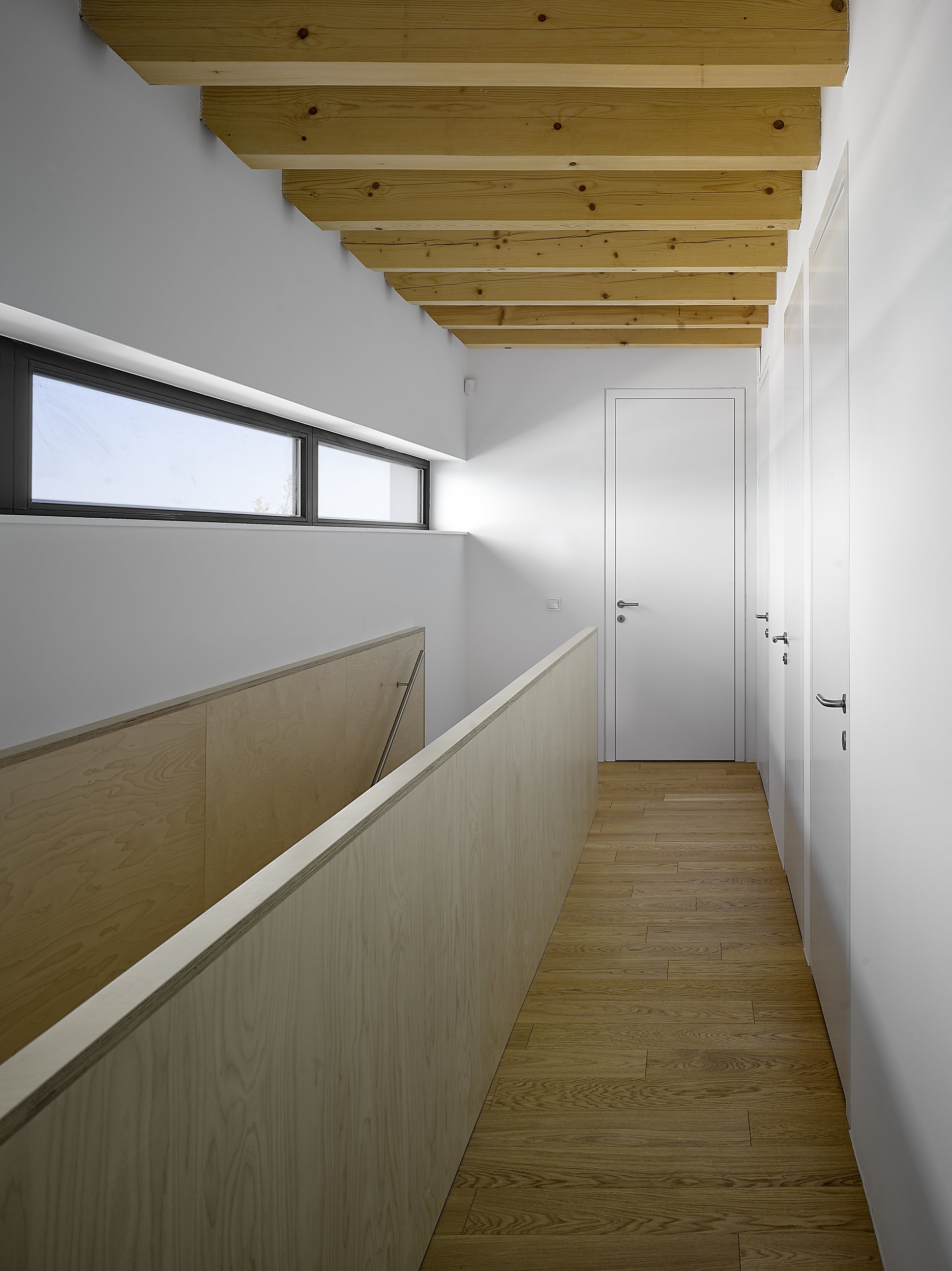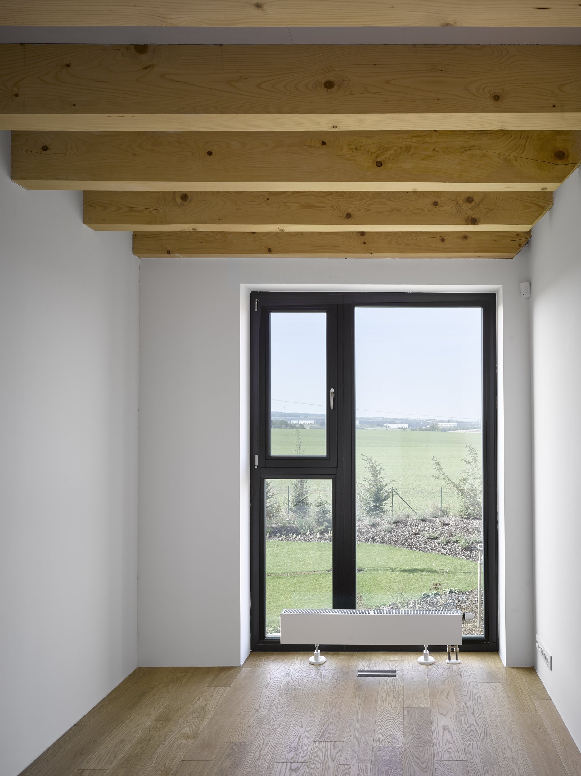 Konštrukcia domu je tradičná. Nosné steny sú murované z pálených tehál, fasáda je obložená smrekovými hranolmi. Konštrukcia strechy - drevený trámový strop je jasne viditeľný v interiéri na poschodí. Na prízemí bola zas v pohľade ponechaná betónová stropná doska. Materiály použité v interiéri zodpovedajú vonkajšej podobe domu. Funguje tu klasická schéma - drevené podlahy, biely vstavaný nábytok a v časti interiéru betónové stropy. Oceňujeme precízny detail, kedy steny a zariadenie pôsobia takmer ako kompozícia jednoliatych farebných ploch.