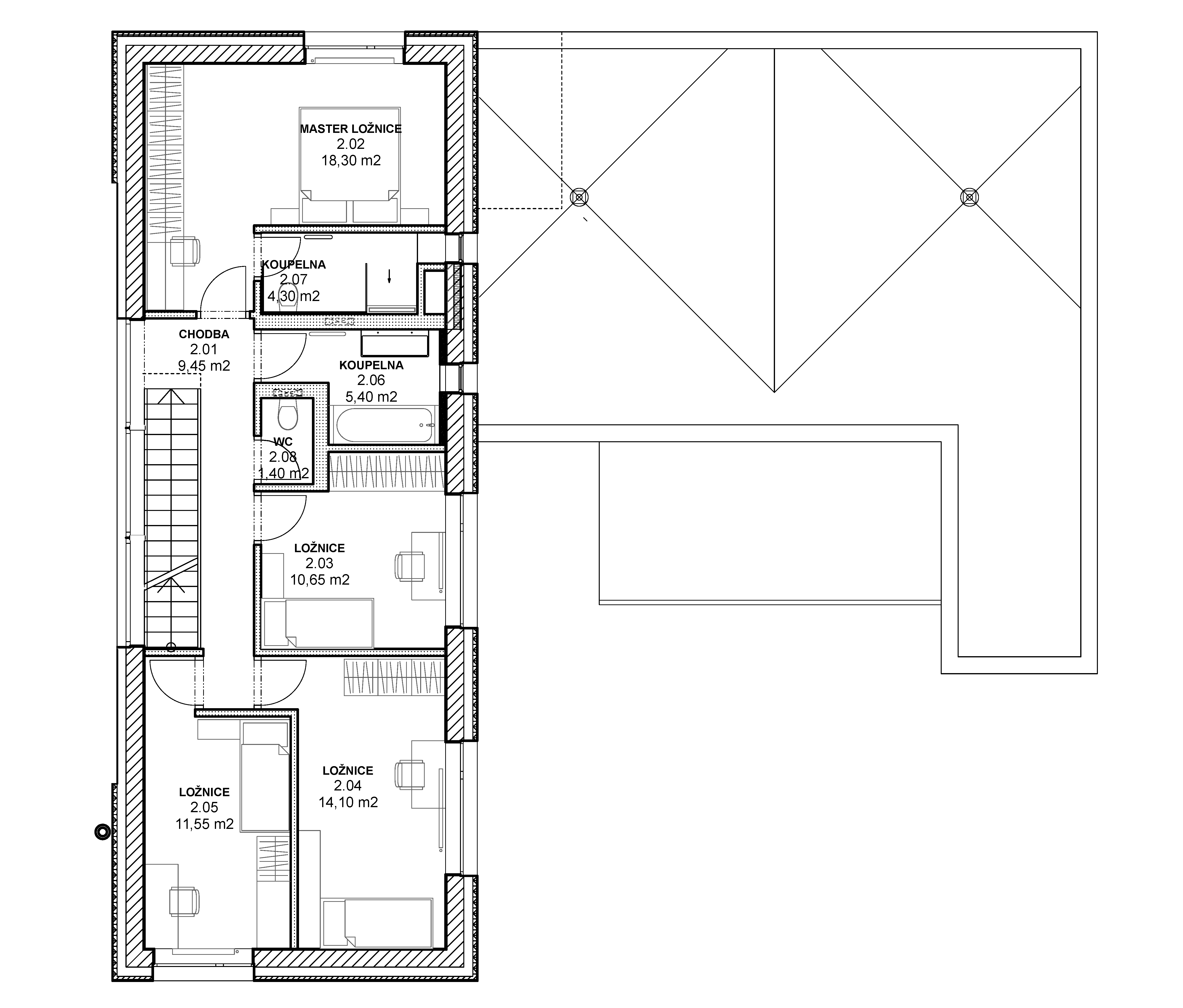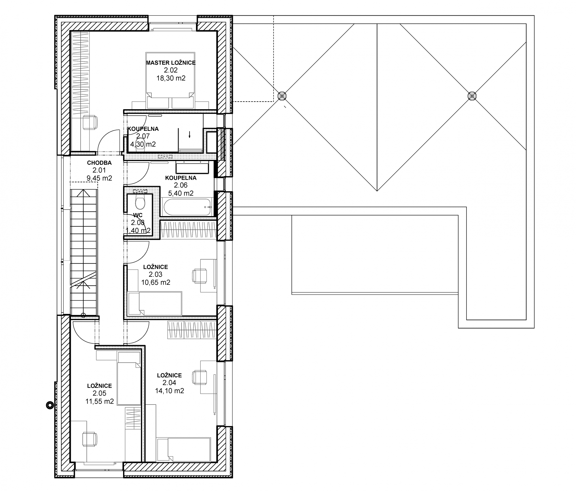 Na poschodí je situovaná nočná časť domu, kde sa nachádza rozmerná rodičovská spálňa s vlastným hygienickým zázemím, tri detské izby, kúpeľňa a samostatné WC.